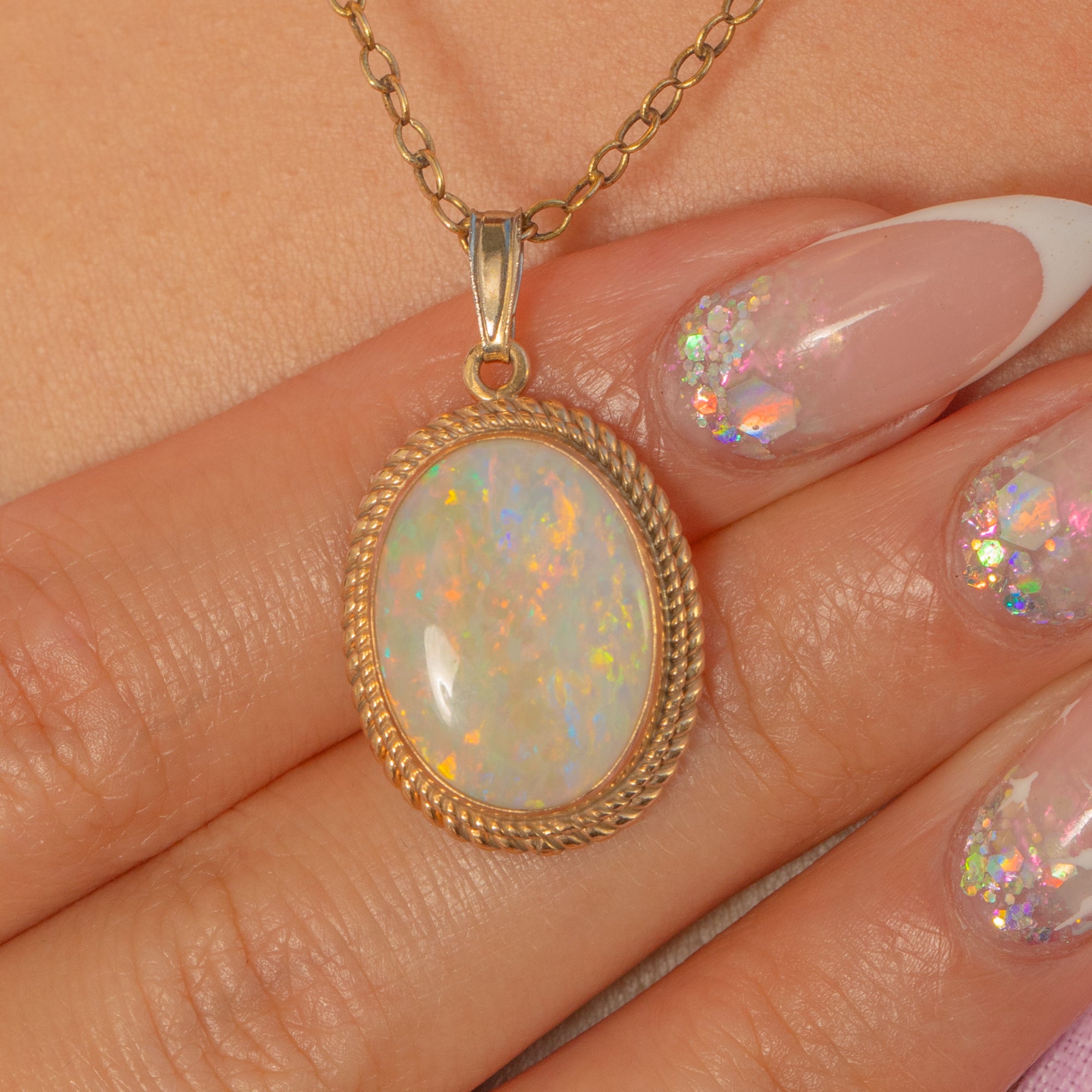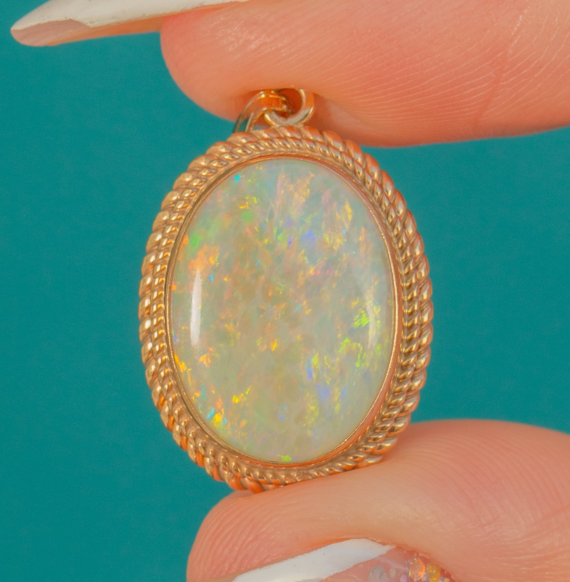 This vintage Opal pendant is a gorgeous showcase of classic design, featuring a glowing natural solid Opal framed by an elegant 9ct Gold rope border. The 1.70ct Opal has beautiful play of colour, with lively flashes that dance across the surface as it moves.