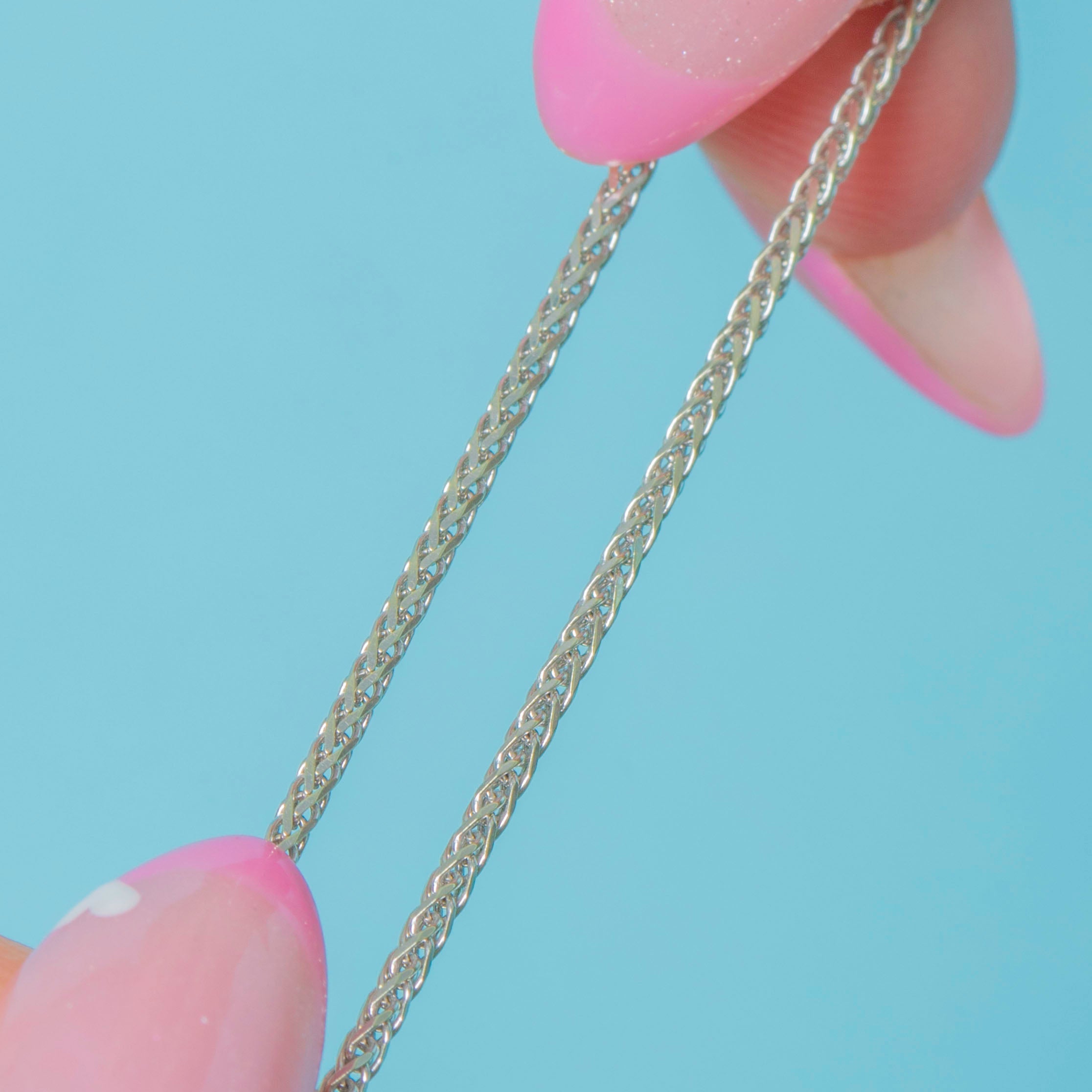 This Vintage 9ct White Gold spiga chain is sleek, refined and effortlessly wearable. Its elegant plaited design catches the light beautifully, giving a soft shimmer that complements both pendants and minimalist styling alike.