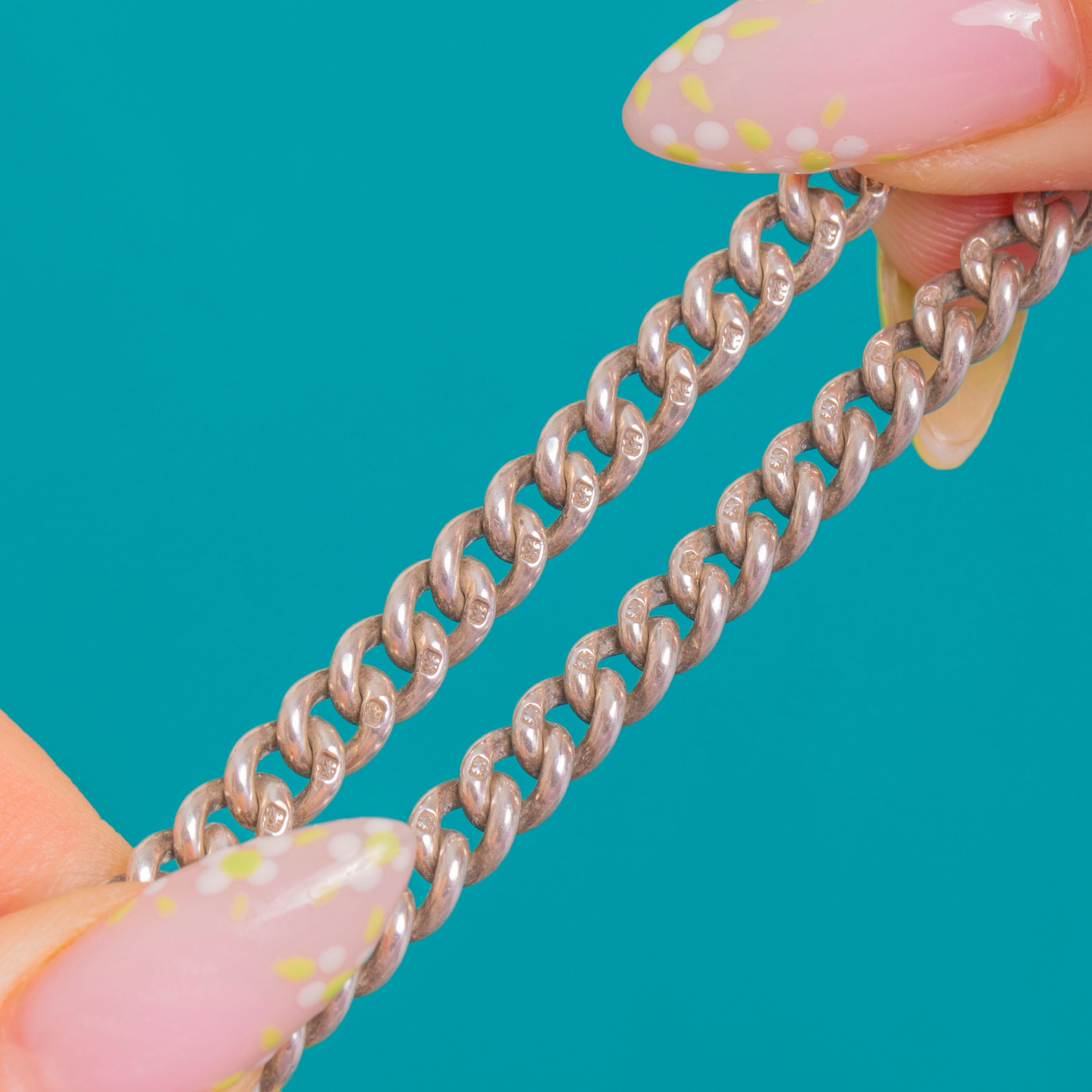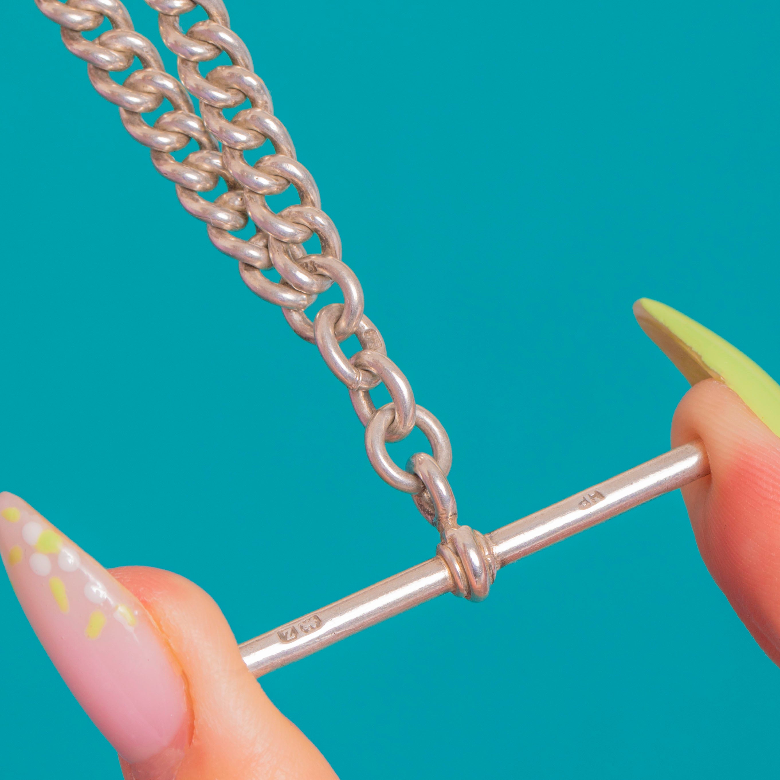 A superb Victorian Silver Albert curb chain finished with twin dog clips and a classic T-bar. The bold curb links have that timeless, tactile presence we love, and the chain carries a satisfyingly weighty 30.2g for a luxurious drape.