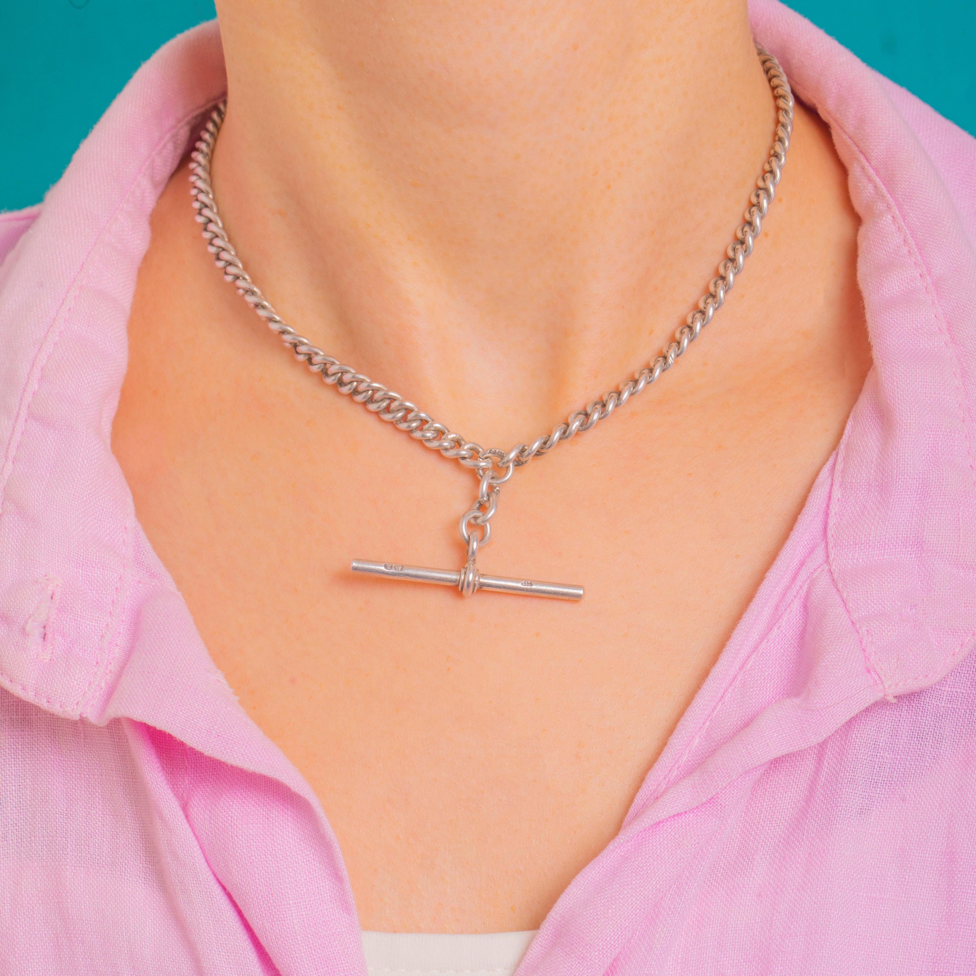 Beautifully marked throughout, every curb link bears the Lion Passant, with further hallmarks and the date letter Z for 1874 to both dog clips and the T-bar. Today it makes a chic collar-length necklace; wear the T-bar front and centre or use the dog clips to style charms and lockets with ease.