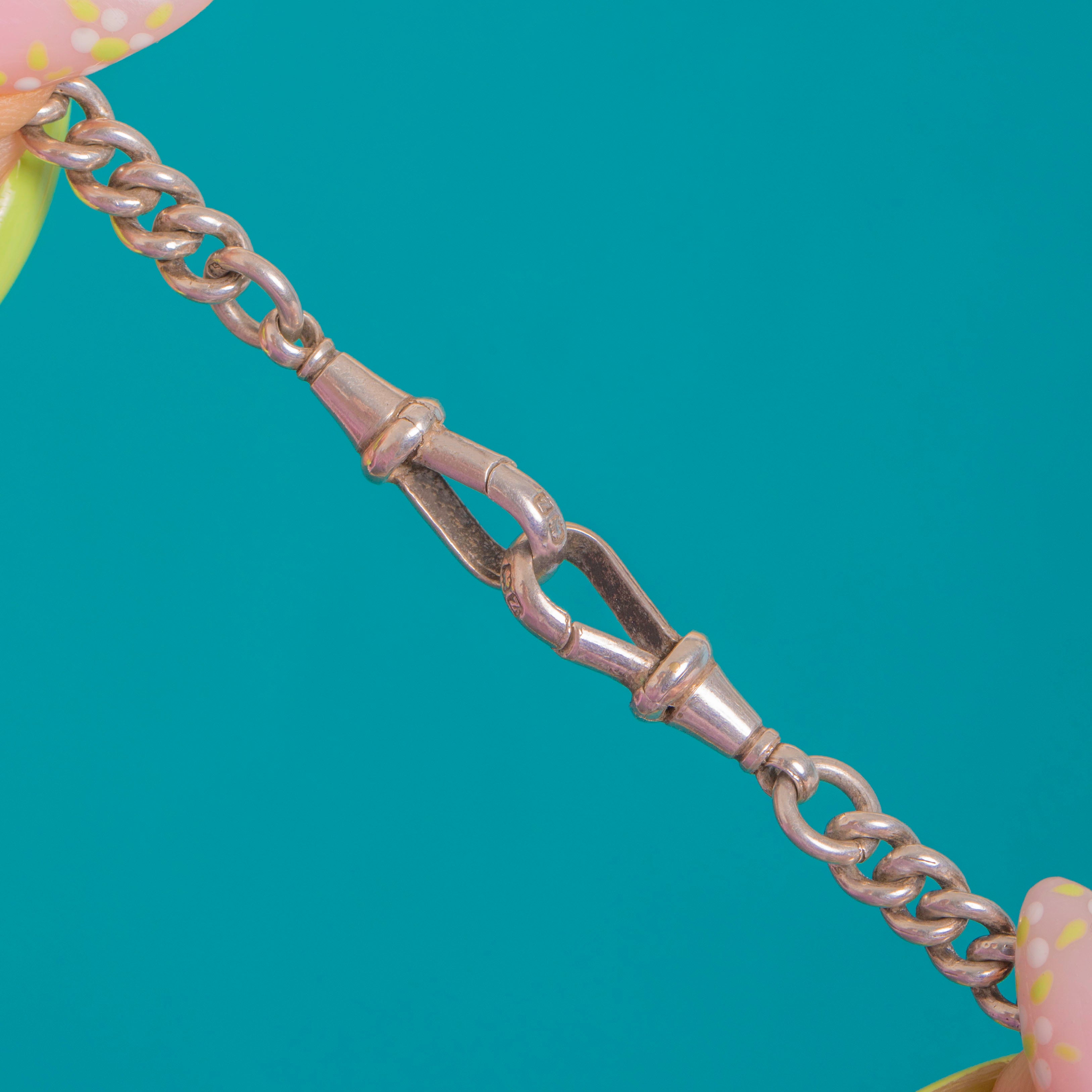 EXCELLENT: The Silver shows light surface wear and a pleasing patina consistent with age; the curb links are well-preserved. Both dog clips and the T-bar are secure and operate smoothly, with crisp, legible hallmarks.