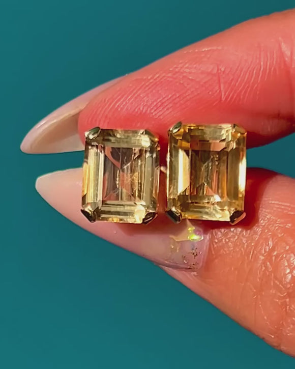 These Art Deco Citrine earrings are a dazzling pair, set with striking emerald-cut Citrines in rich golden hues. The gemstones measure 10mm by 8.5mm each, weighing an impressive 4.13ct apiece, and are mounted in 14ct Gold settings that showcase their bold geometry.