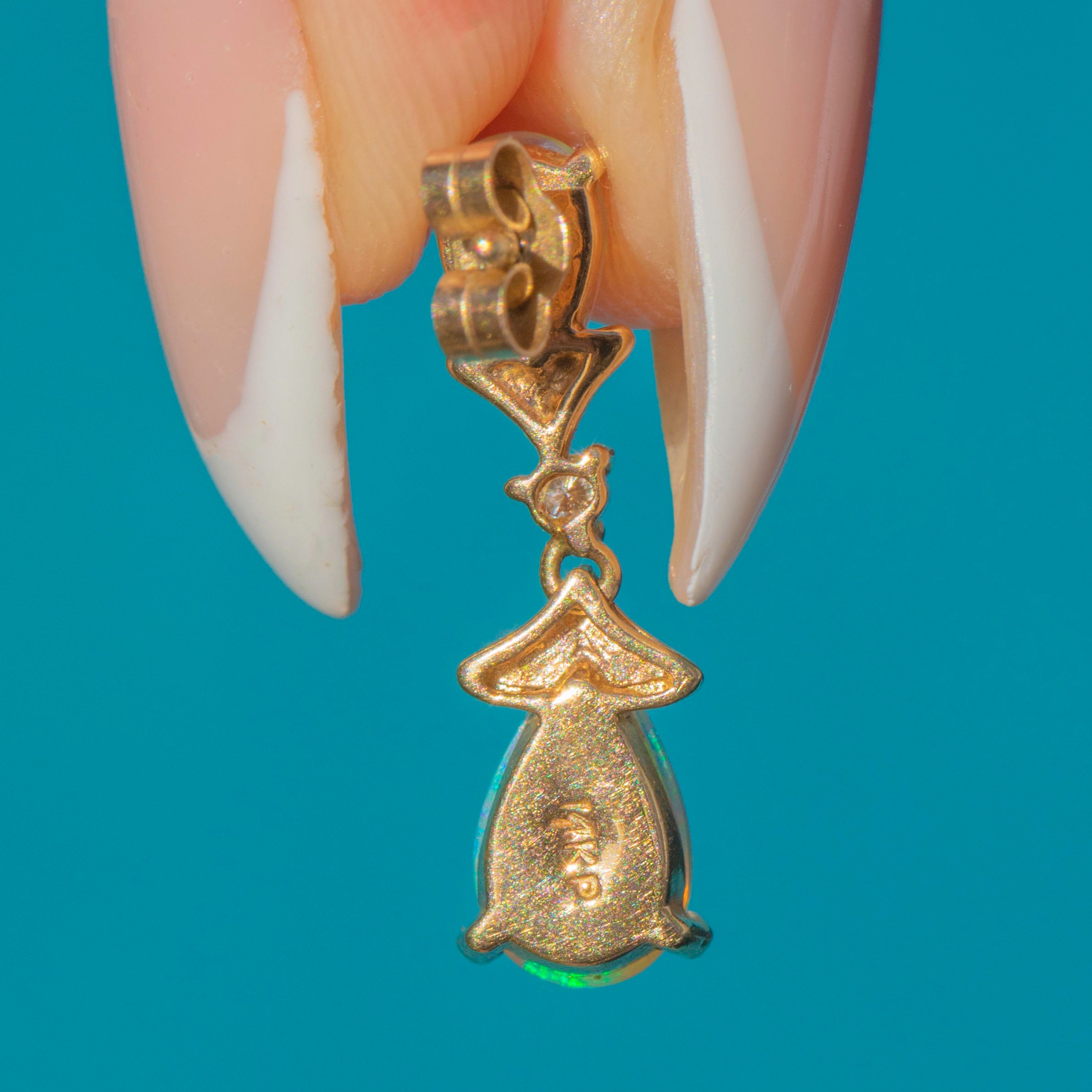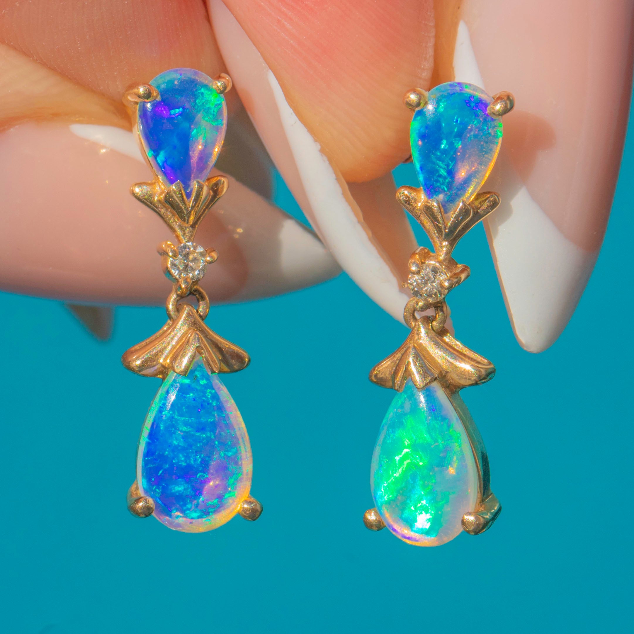 These beautiful Vintage drop earrings are crafted in 14ct Gold and set with vibrant Opals and Diamonds. Each earring features a double-drop design with pear-shaped Opals above and below, linked by a sparkling Diamond accent. The Opals display a kaleidoscope of colour—flashes of blue, green, and orange fire—capturing the magical play-of-colour this gemstone is so loved for.