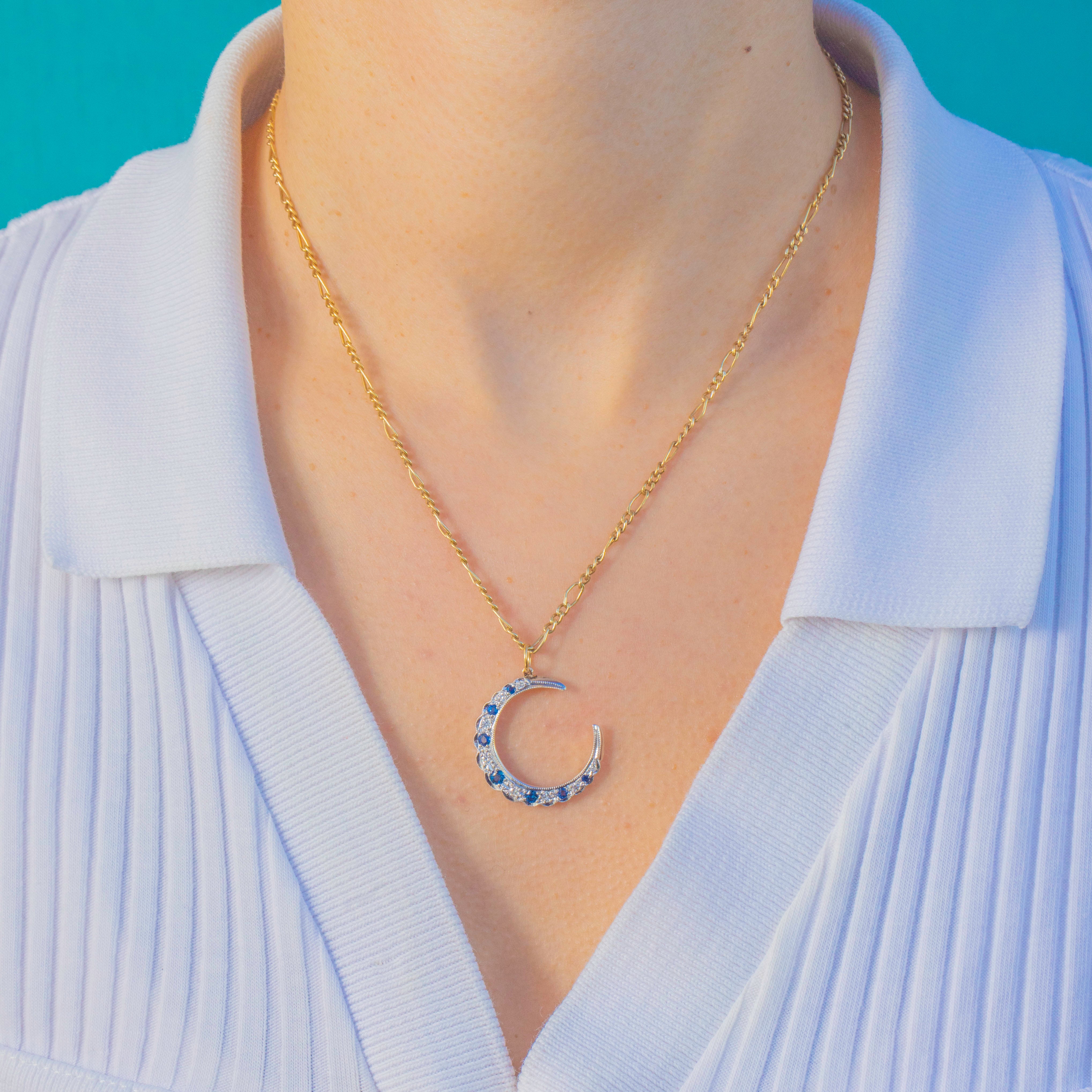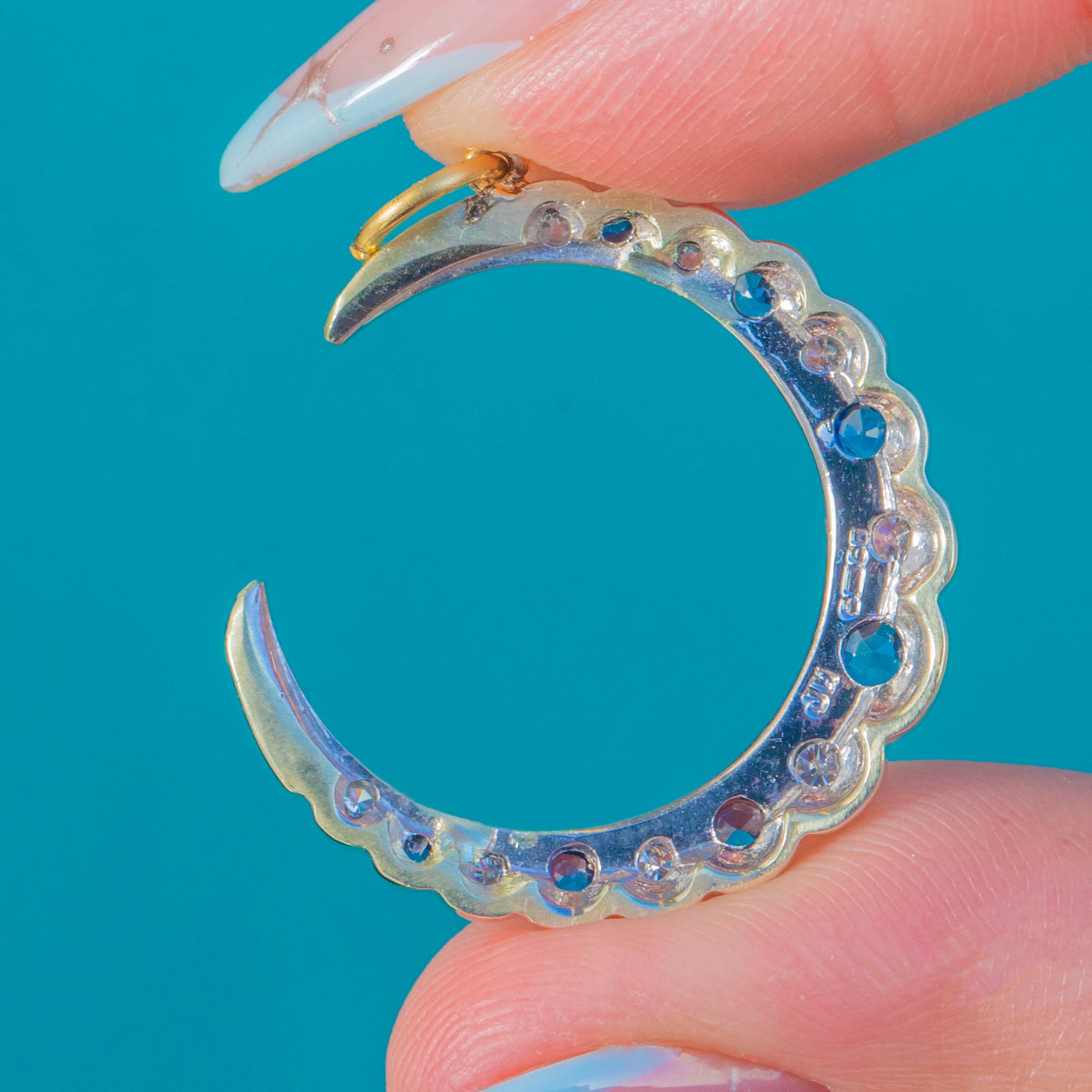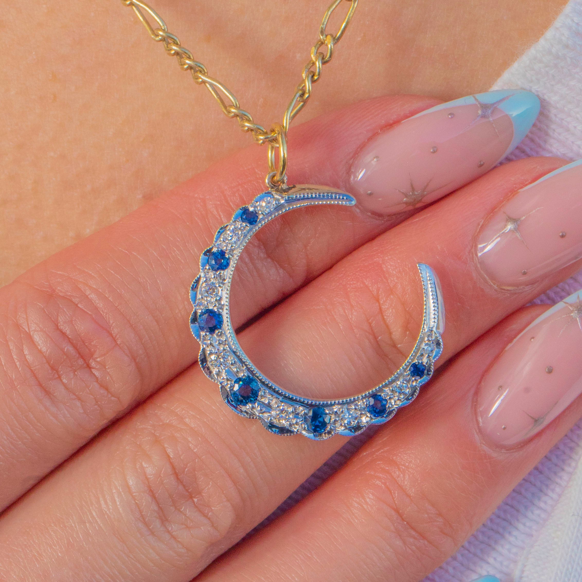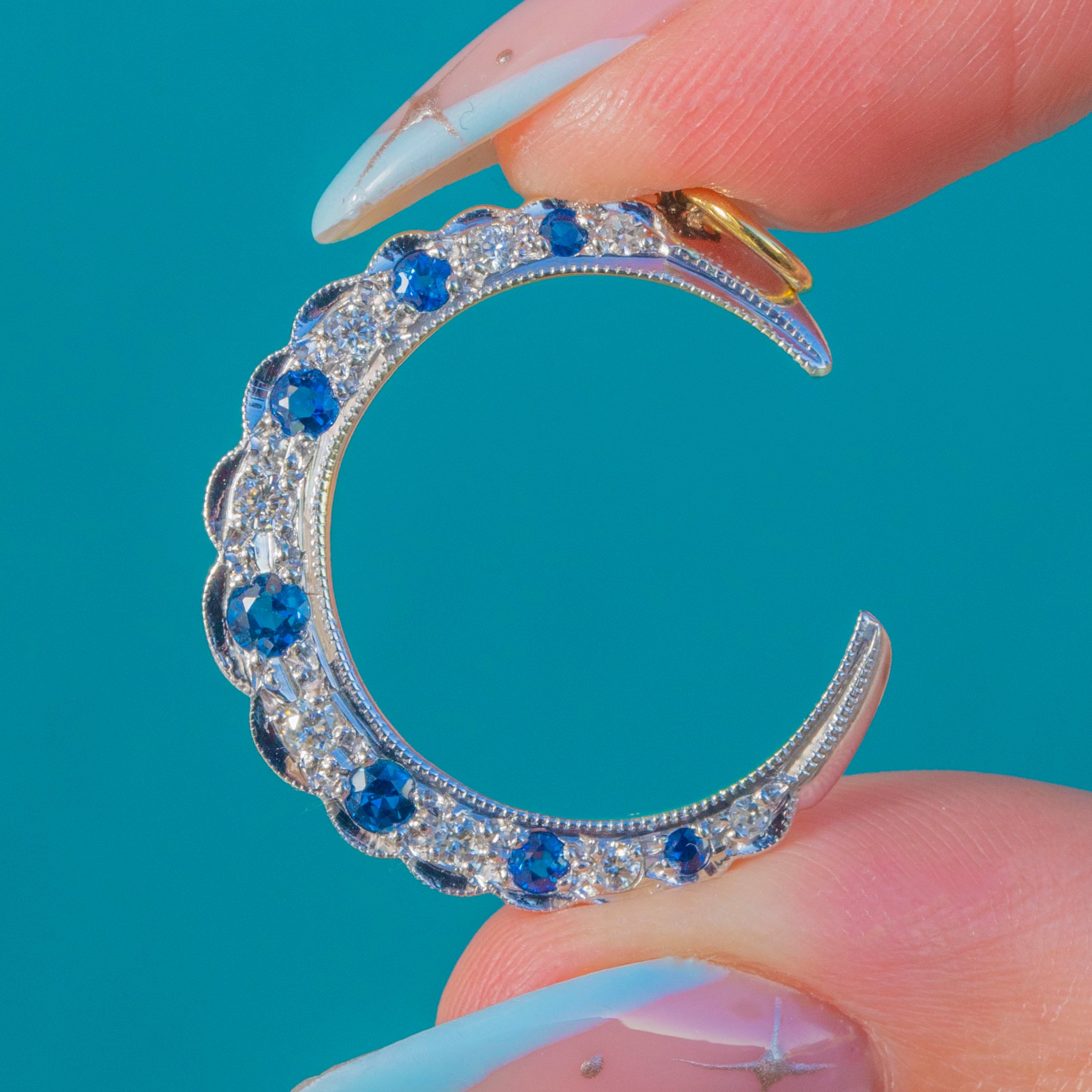 A timeless celestial beauty, this 1940s crescent charm balances icy Diamond scintillation with serene Sapphire blues. Graduated round stones sweep along a graceful arc of 14ct White Gold, their tones shifting from deep midnight to pale sky for a dreamy, night‑sky sparkle.