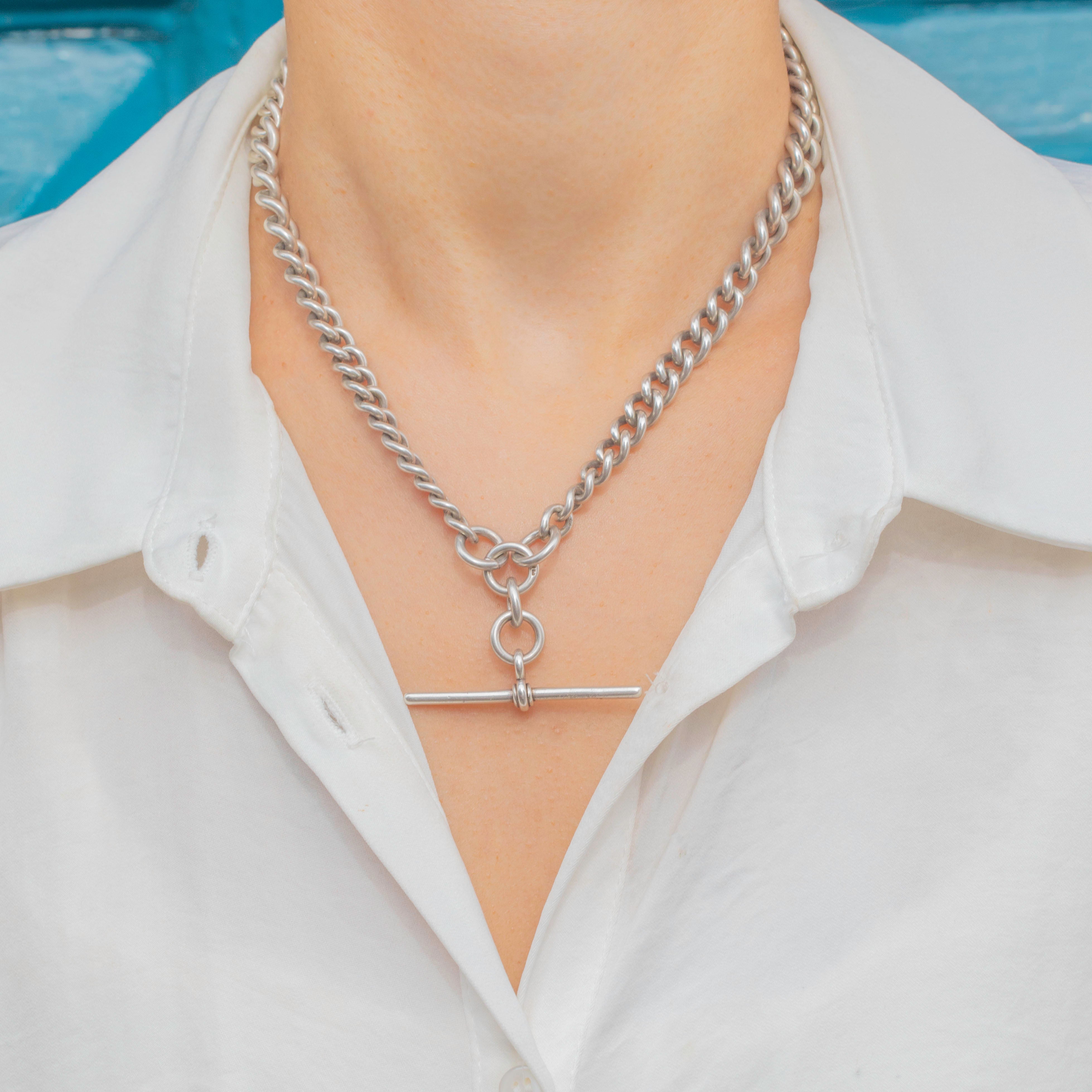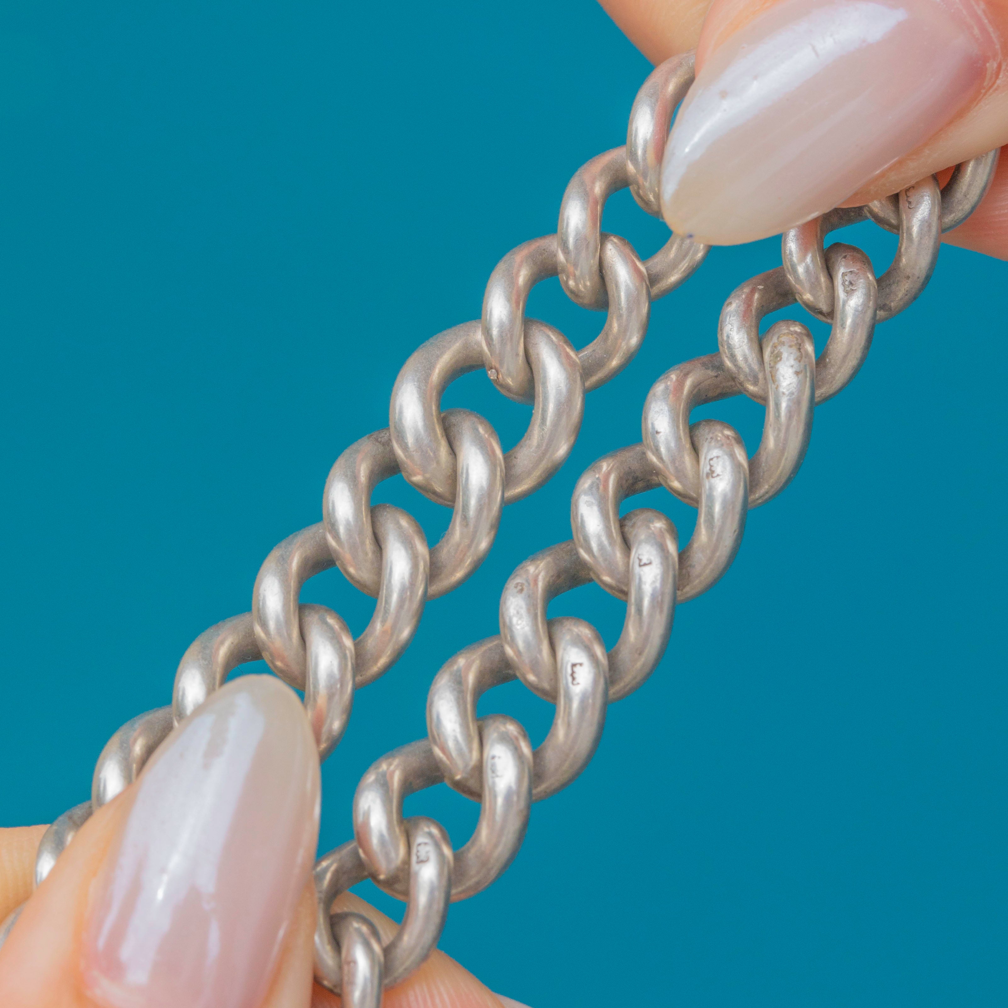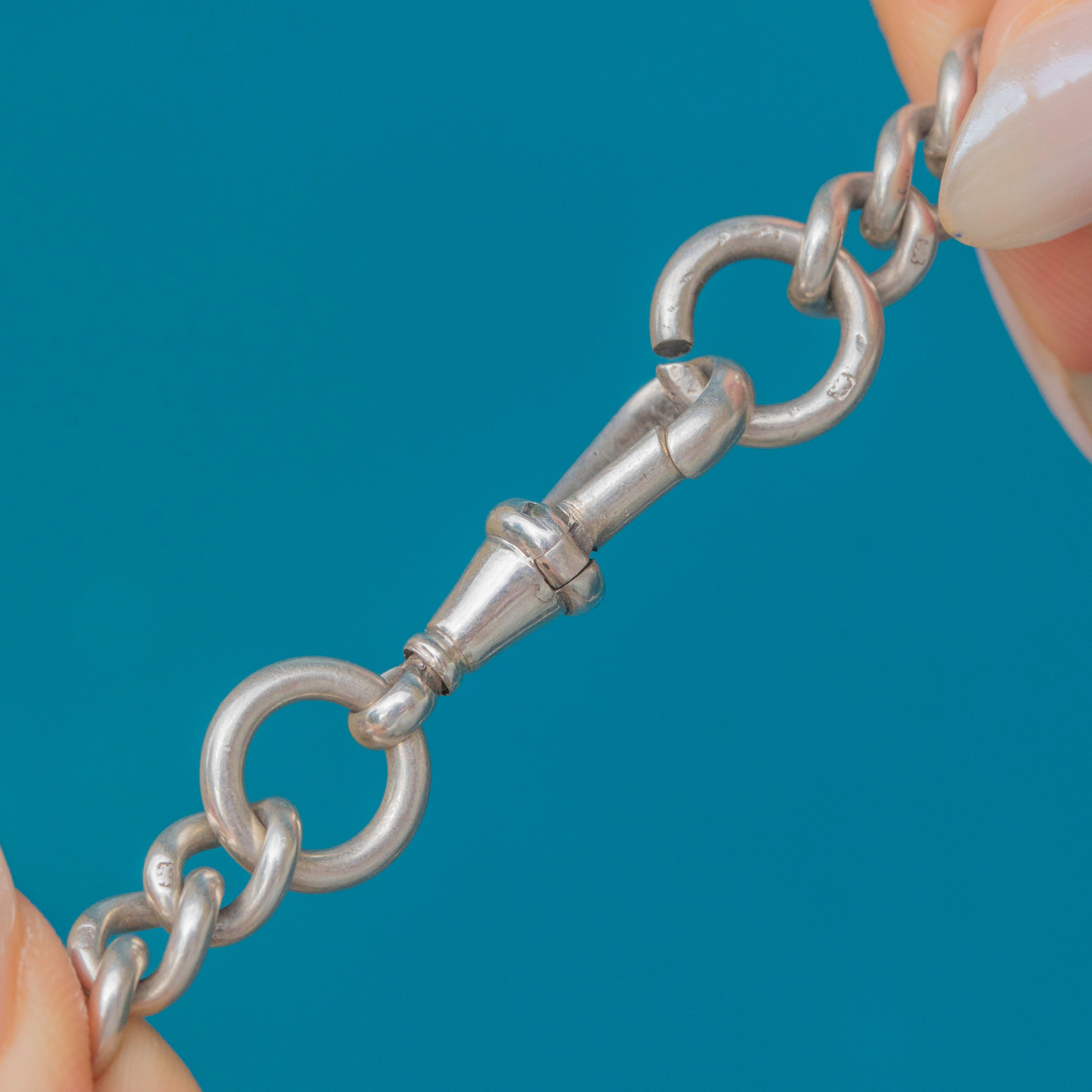 Radiating antique charm, this Silver Albert chain is formed of glossy graduating links which catch the light brilliantly and project a lustrous sheen from their curvaceous forms.