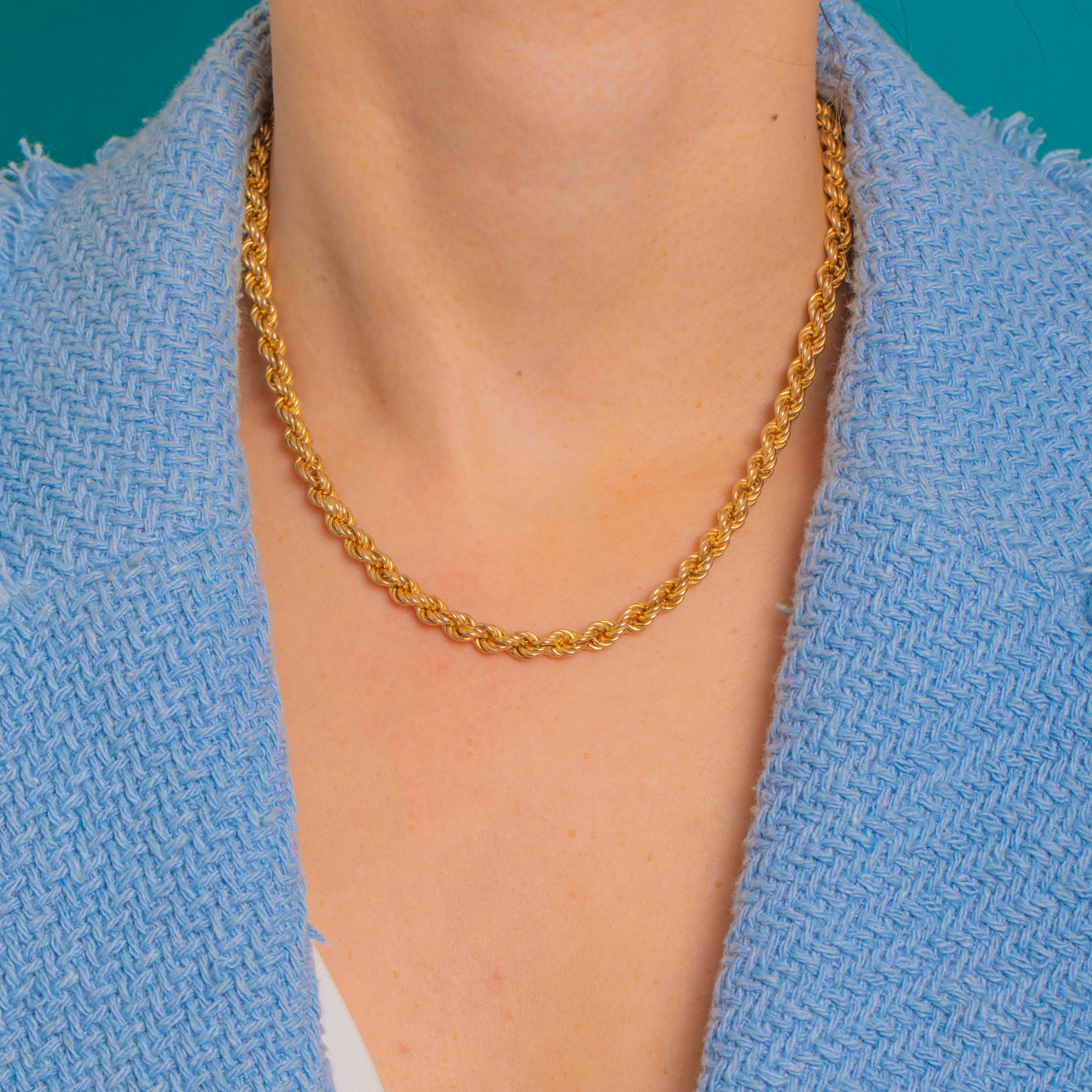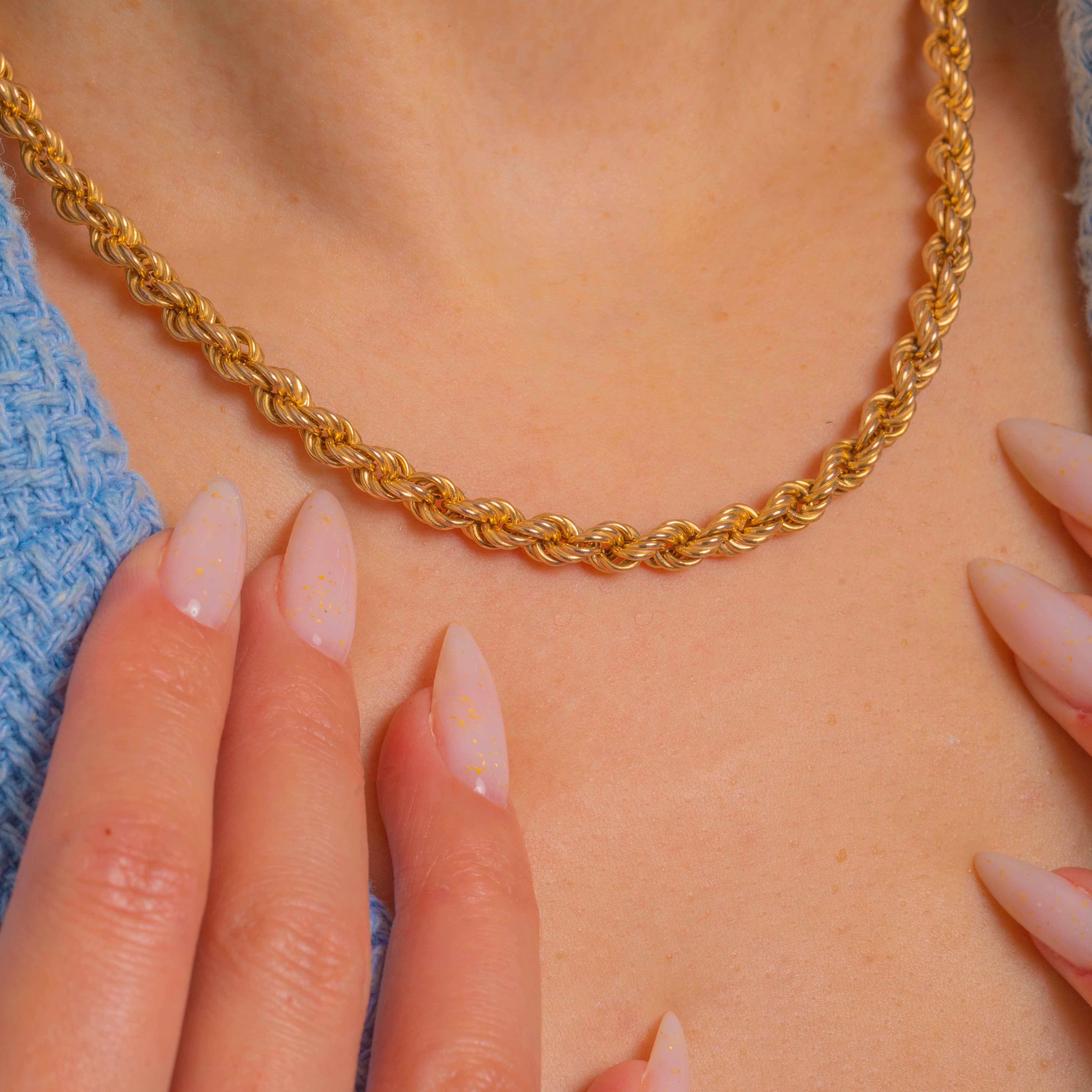 EXCELLENT: Bright high-polish finish with only the lightest surface wear seen under close inspection. The rope links are even, intact and securely soldered throughout, and the bolt-ring clasp is in good working order. Well cared for with no visible repairs or distortions.
