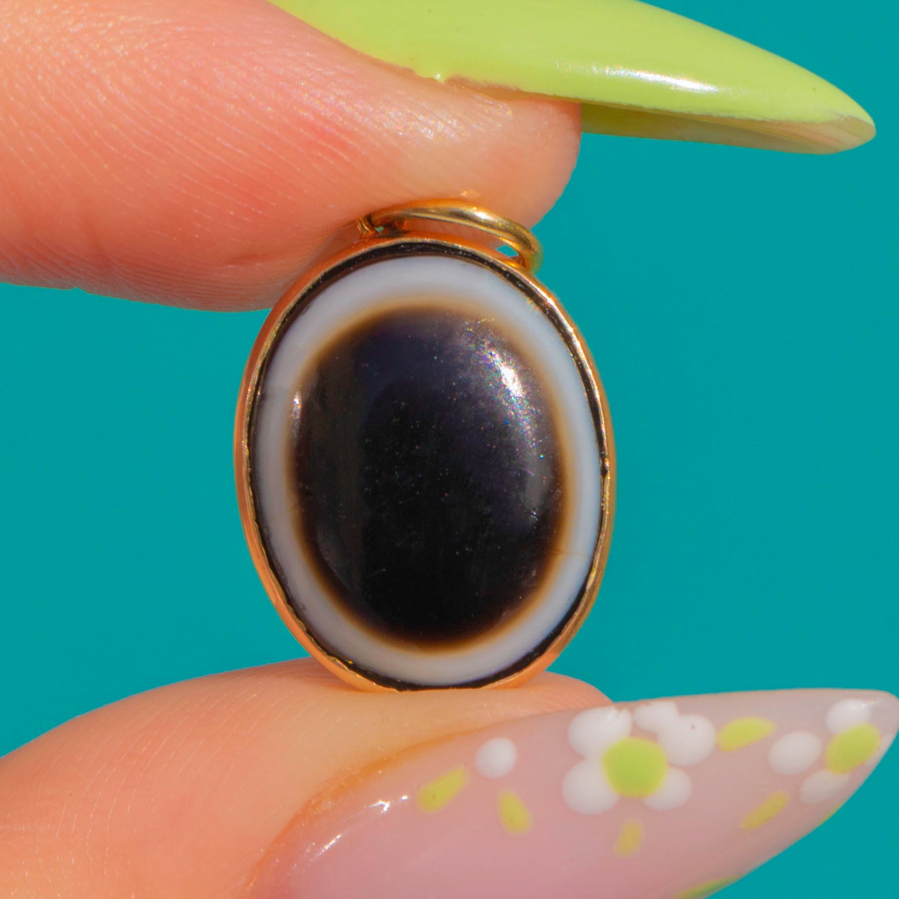 A petite treasure from the Victorian era, this 15ct Gold charm showcases a striking Bull’s Eye Agate cabochon with dramatic concentric banding. The dark centre is haloed by warm brown and a broad milky-white ring, all polished to a glossy dome that catches the light beautifully.