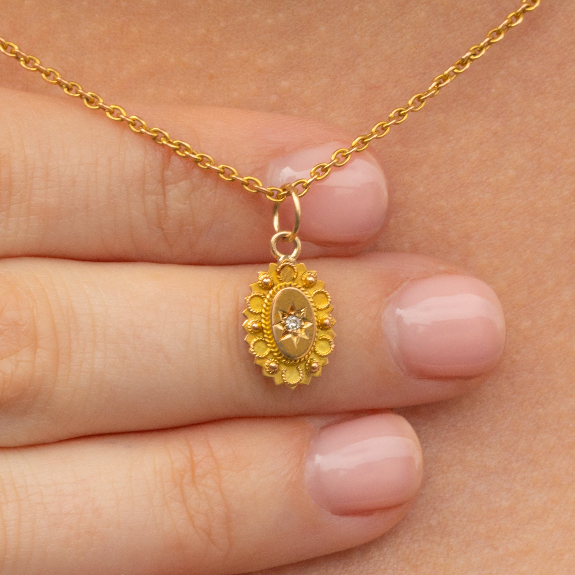 This 15ct Gold Diamond oval Etruscan charm is a lovely petite pendant to have in your jewellery box! This piece is made from solid 15ct Gold throughout, and features a star-set Diamond at the centre.