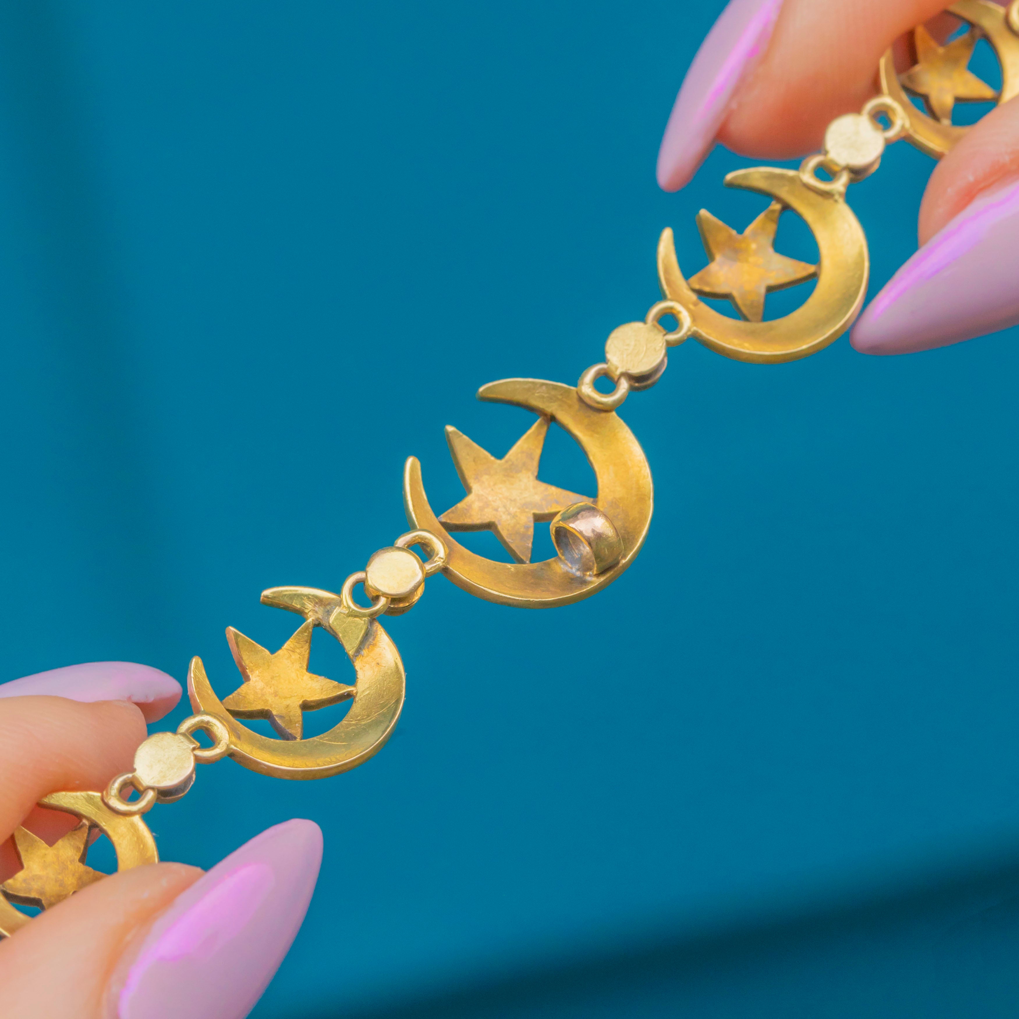 Crafted in rich 15ct Gold, the crescent and stars are suspended from a fine antique chain, forming a perfectly balanced composition that drapes beautifully around the neck. A rare and exquisite jewel for lovers of antique celestial design.