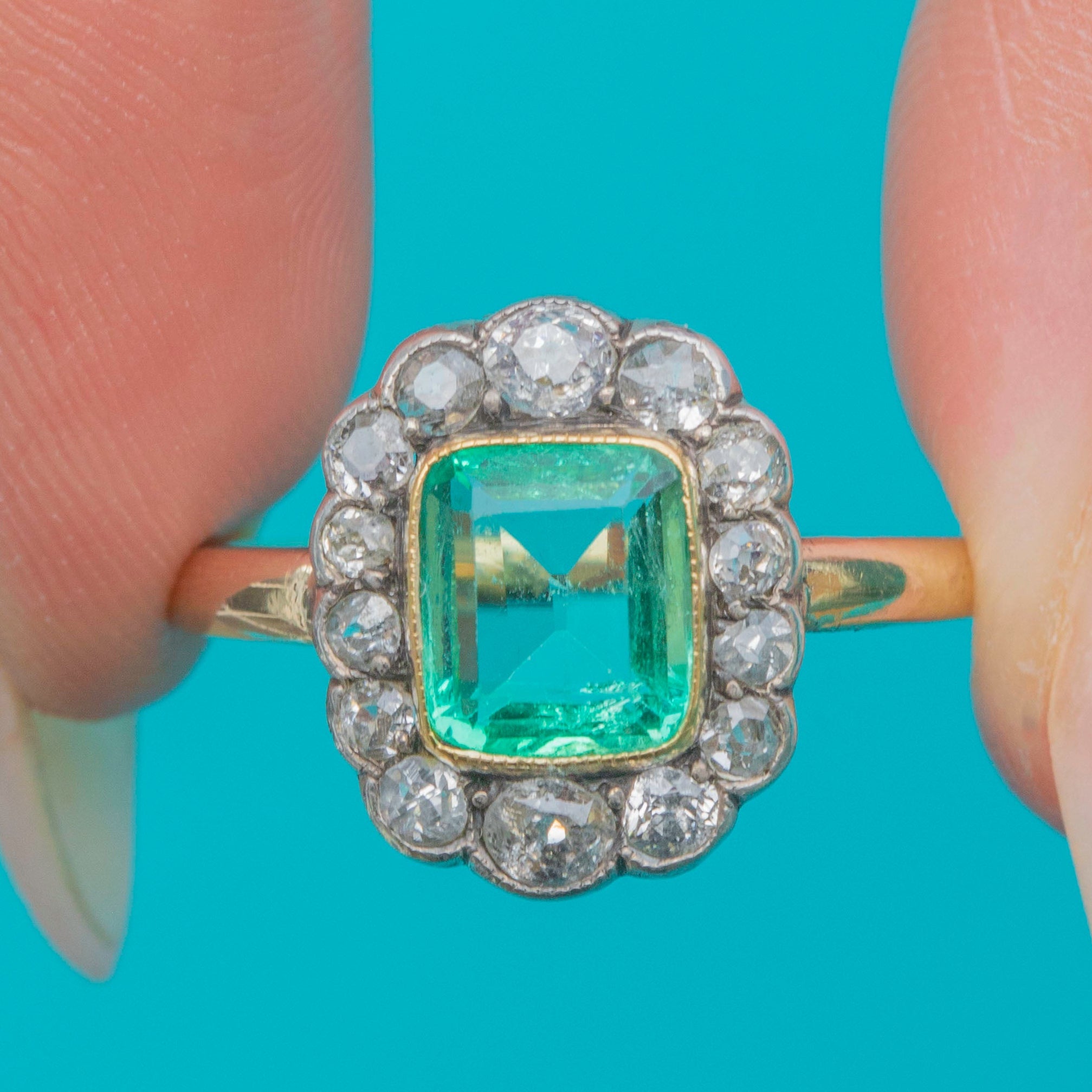 Antique 15ct Gold Emerald Diamond Cluster Ring, 1.00ct Emerald
