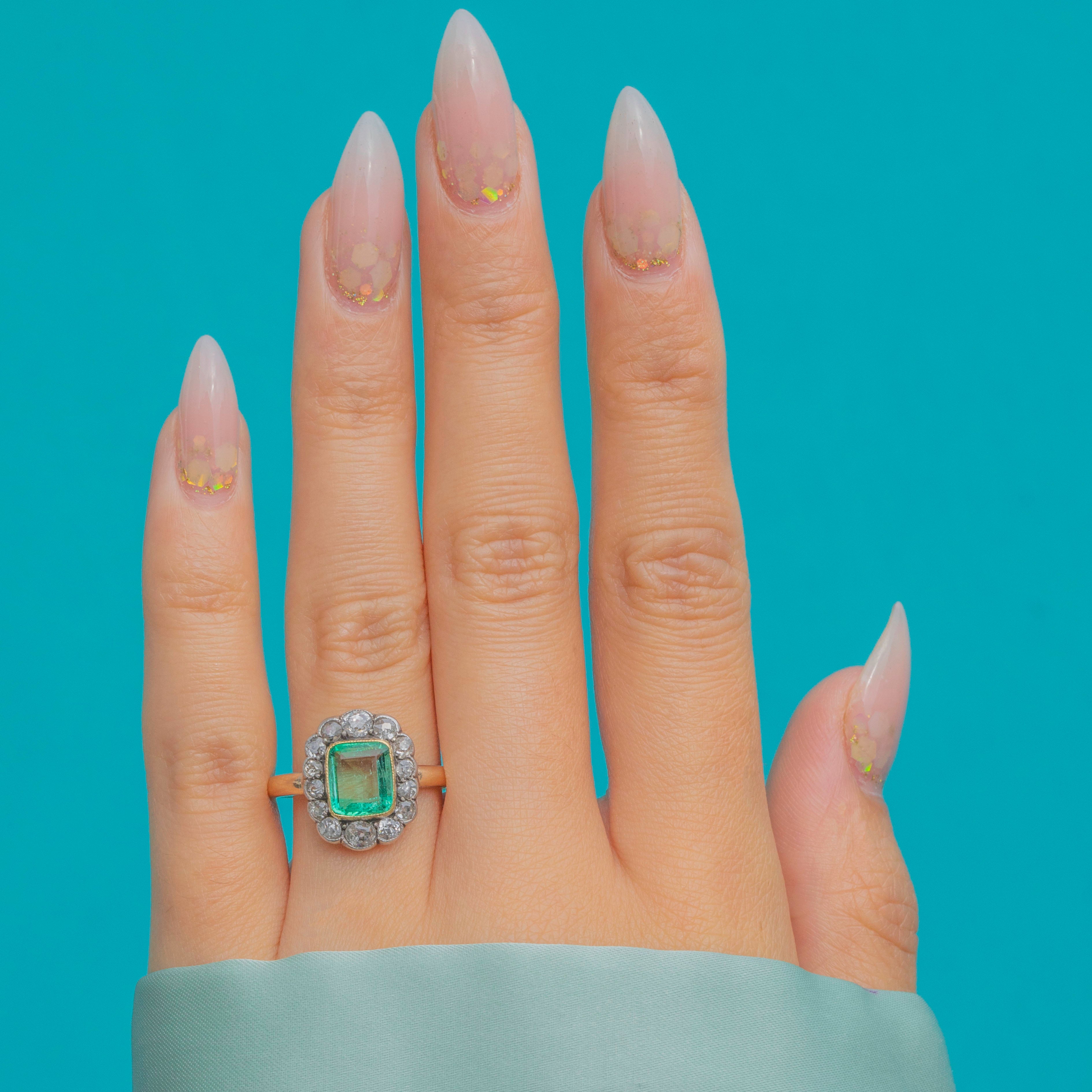 EXCELLENT: The Emerald is pristine with no chips or abrasions, retaining a gorgeous saturated green hue. Diamonds are bright, lively, and securely set. Band and settings are in excellent condition, with only minor wear consistent with age.