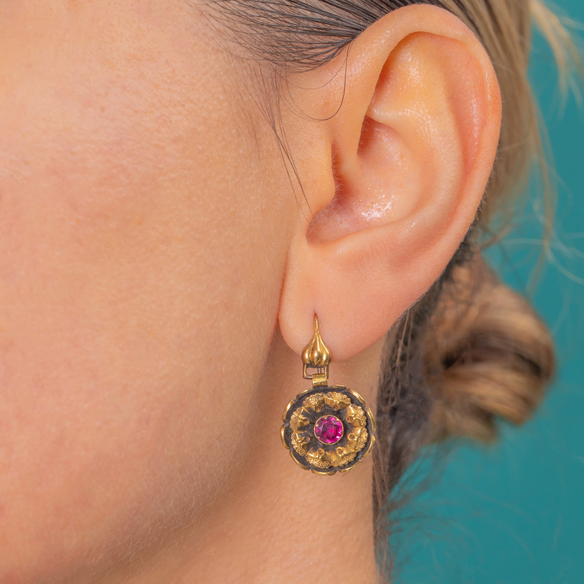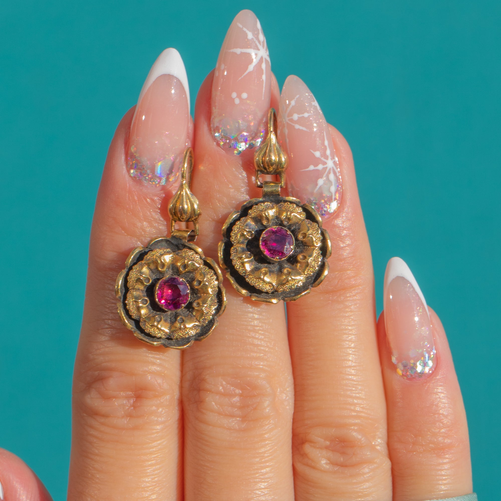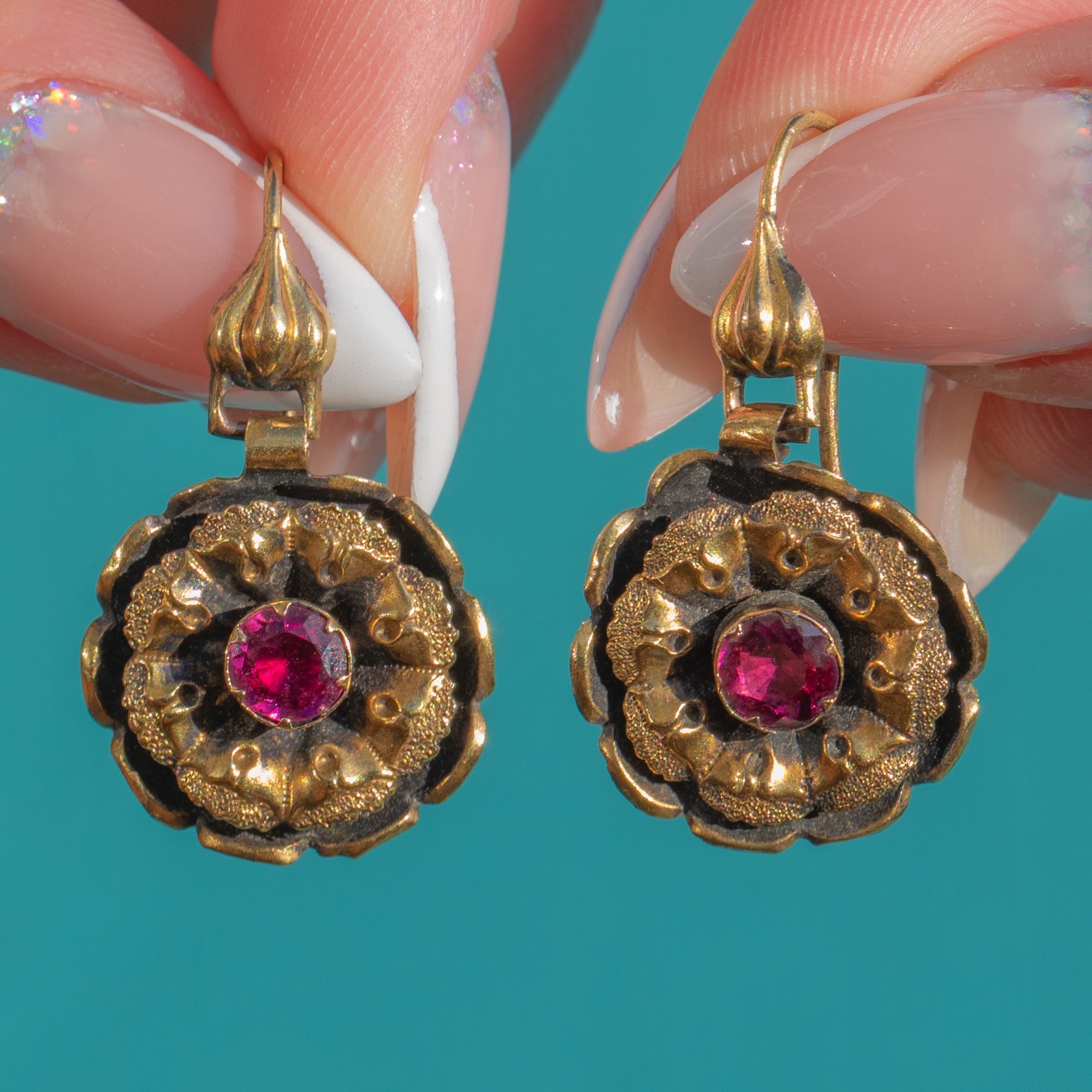 Beautiful Victorian earrings crafted in rich 15ct Gold, featuring deep pink Garnets framed by ornate Goldwork. The textured floral repoussé design gives them a striking three-dimensional quality, while the Garnets bring a vibrant glow against the Gold petals.