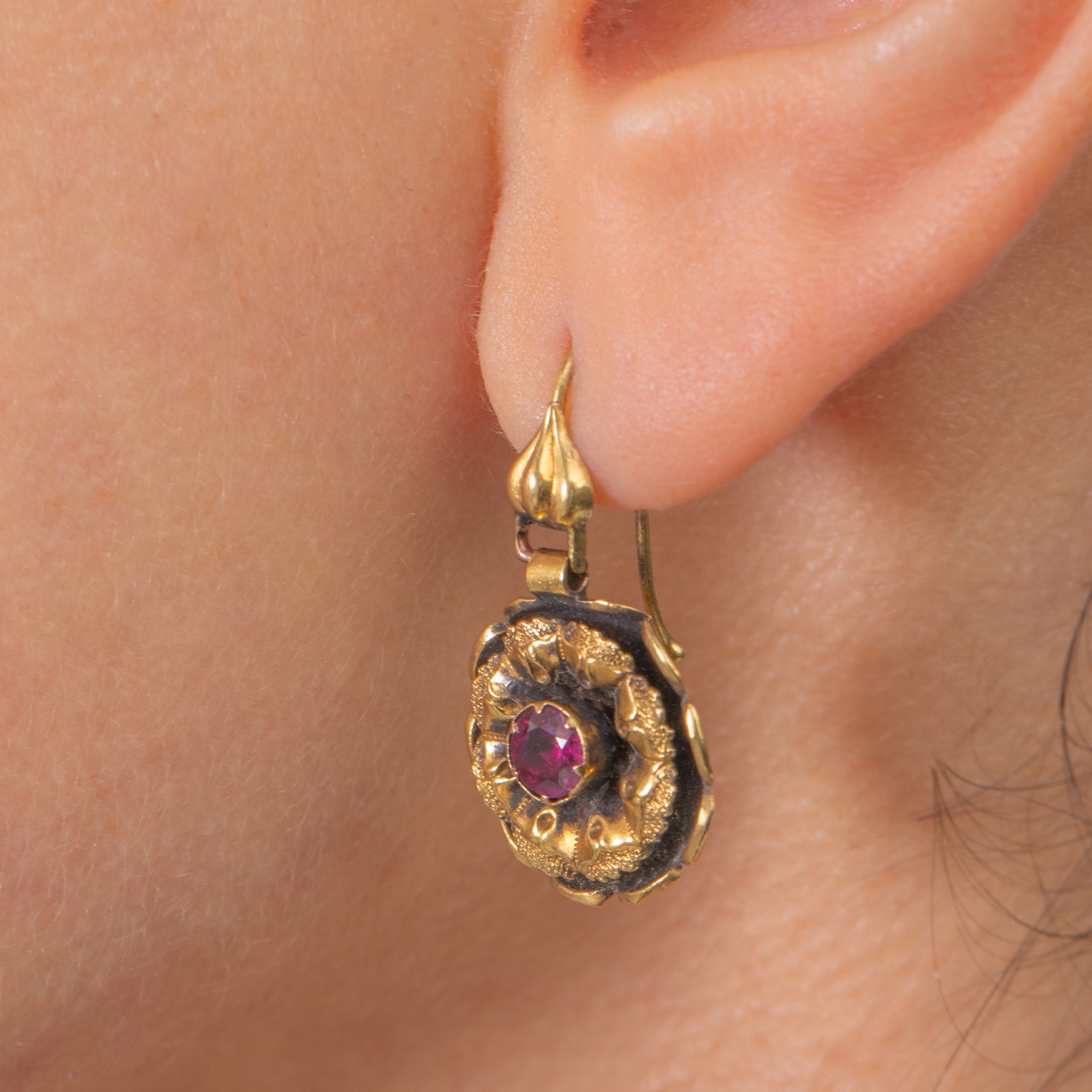 VERY GOOD: The Garnets are bright and well-preserved. The Goldwork shows light wear in keeping with age but remain beautifully crisp, and the original hooks are secure.