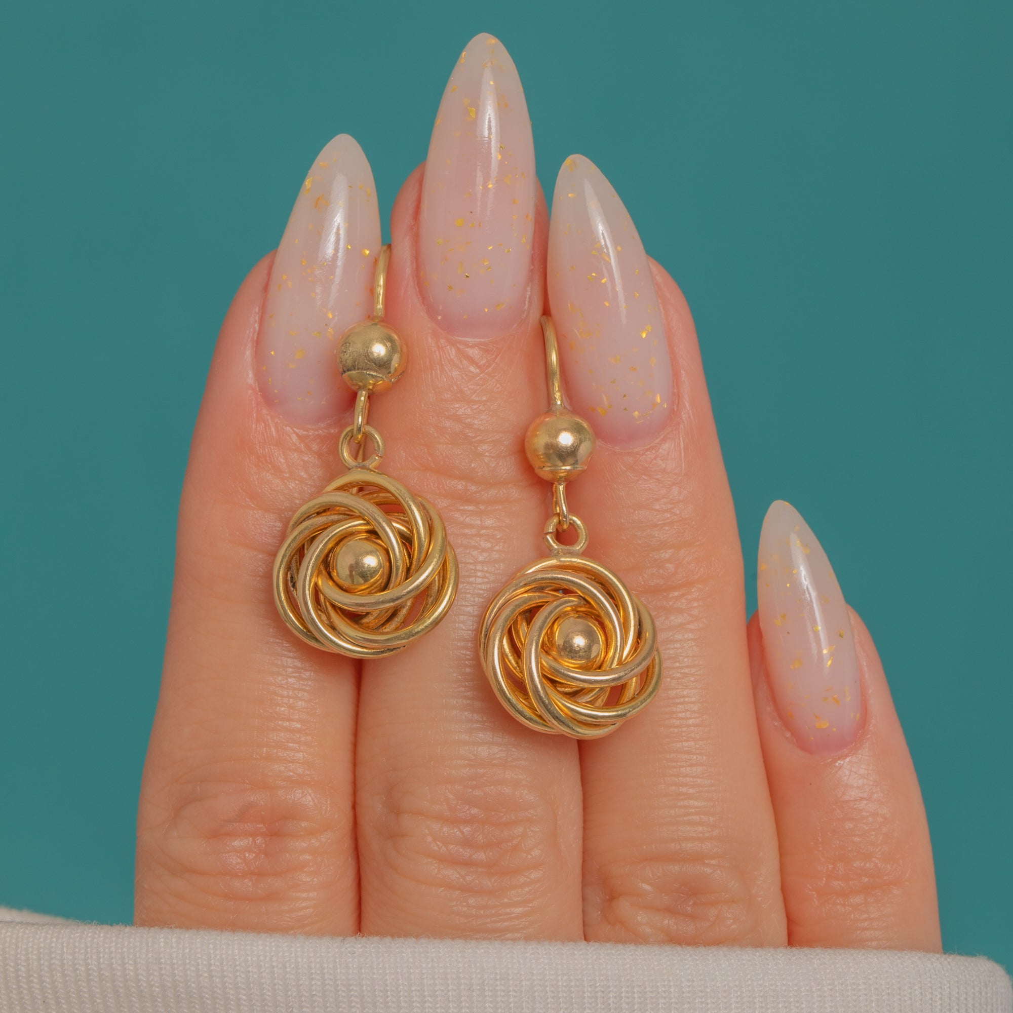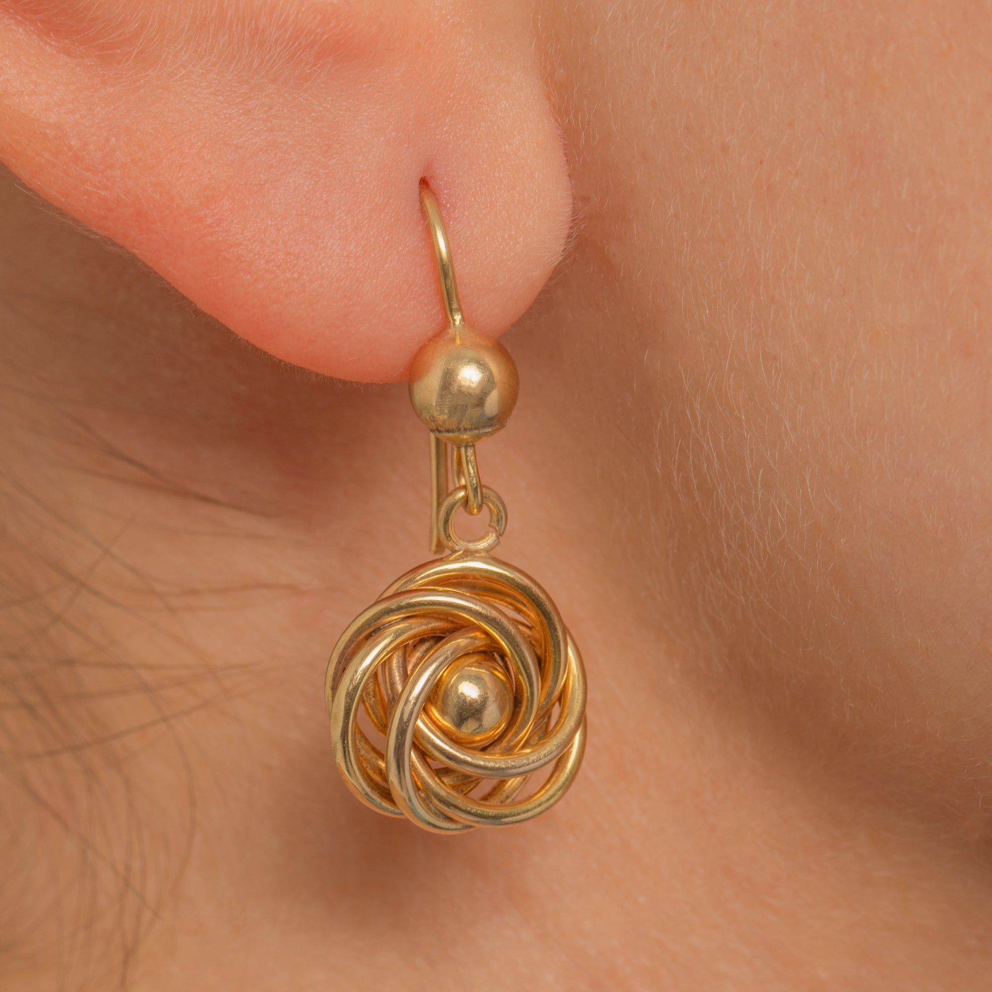 Finely wrought in glowing 15ct Gold, these Victorian love‑knot earrings are a timeless whisper of romance. Each articulated rosette is formed from interlaced rounded wires encircling a polished central bead, suspended beneath a neat ball surmount on simple shepherd hooks for graceful movement and elegant sway.