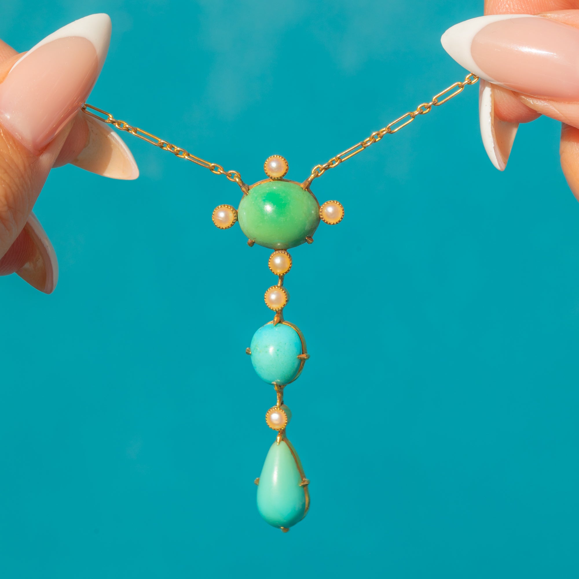 The largest oval Turquoise sits at the centre, with a smaller oval and an elegant teardrop below, creating a graceful cascade. The warm Gold setting and fine antique chain complete this rare and eye-catching piece, brimming with Victorian charm.