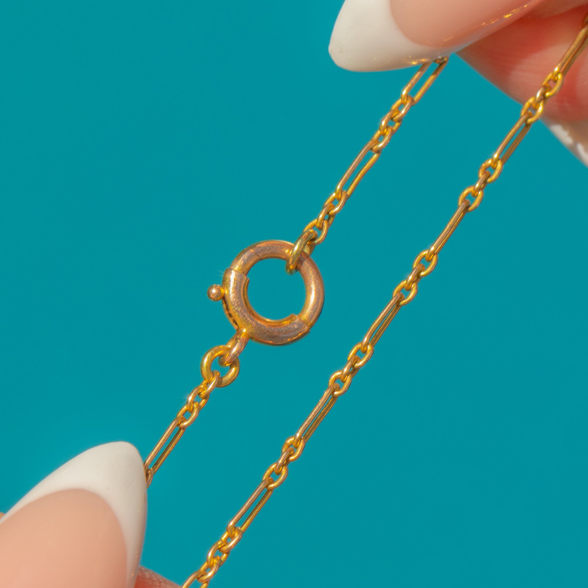 EXCELLENT: The Turquoise cabochons are vibrant and well-preserved with no chips or cracks. Pearls are smooth and glowing. The Gold settings and chain remain in superb antique condition, with a fully functioning bolt ring.