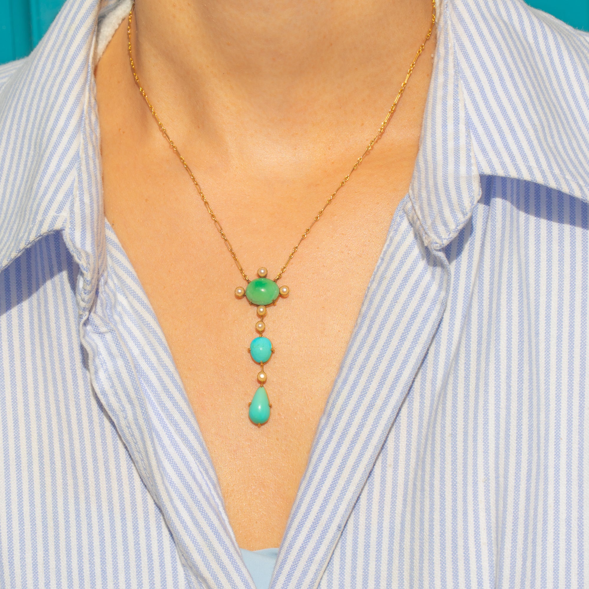 A breathtaking Antique pendant necklace crafted in 15ct Gold, featuring a vertical arrangement of vivid natural Turquoise cabochons highlighted with lustrous Pearls.