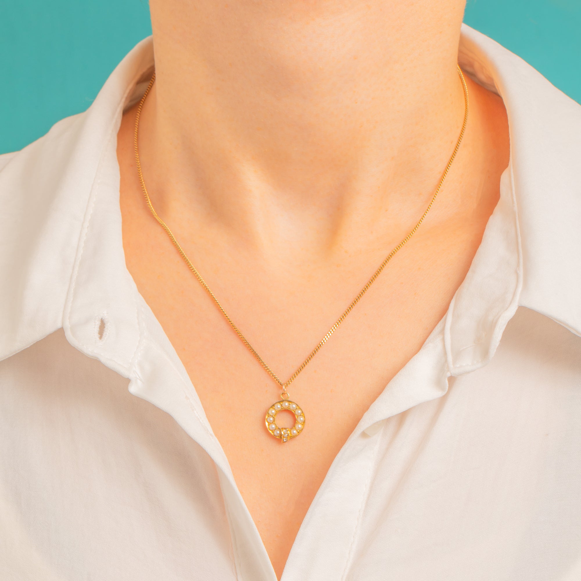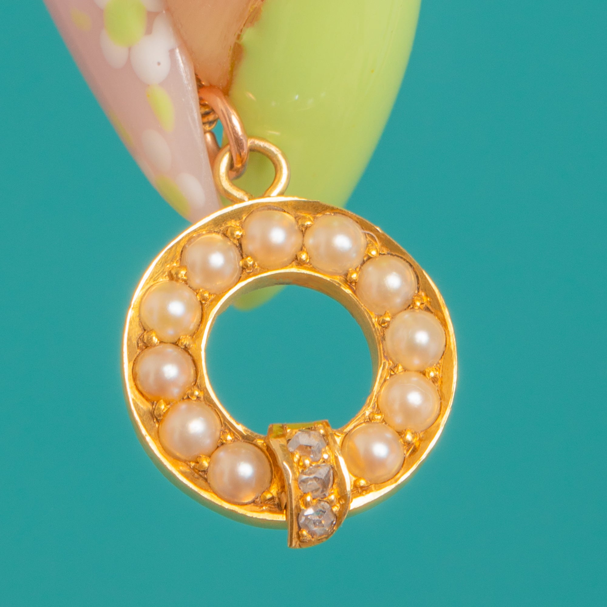 Petite and beautifully refined, this Victorian 15ct Gold charm forms a delicate open wreath of creamy Seed Pearls, finished with a tiny tab set with a trio of twinkling Rose-Cut Diamonds. The warm glow of antique Gold pairs perfectly with the soft lustre of the Pearls, while the Diamonds add a subtle, romantic sparkle.
