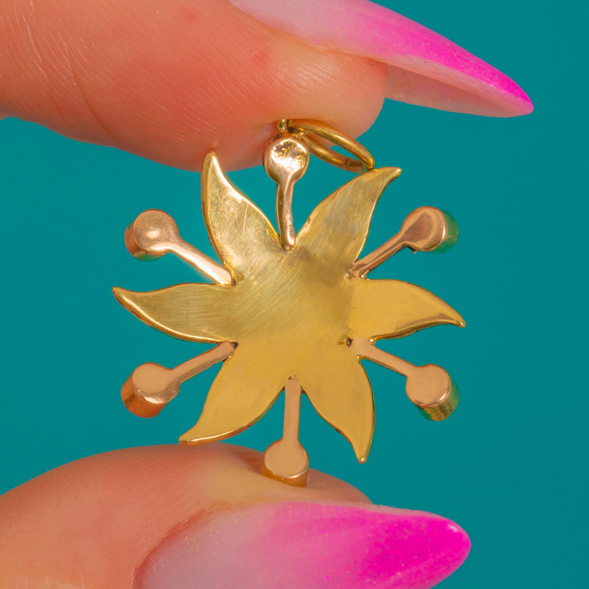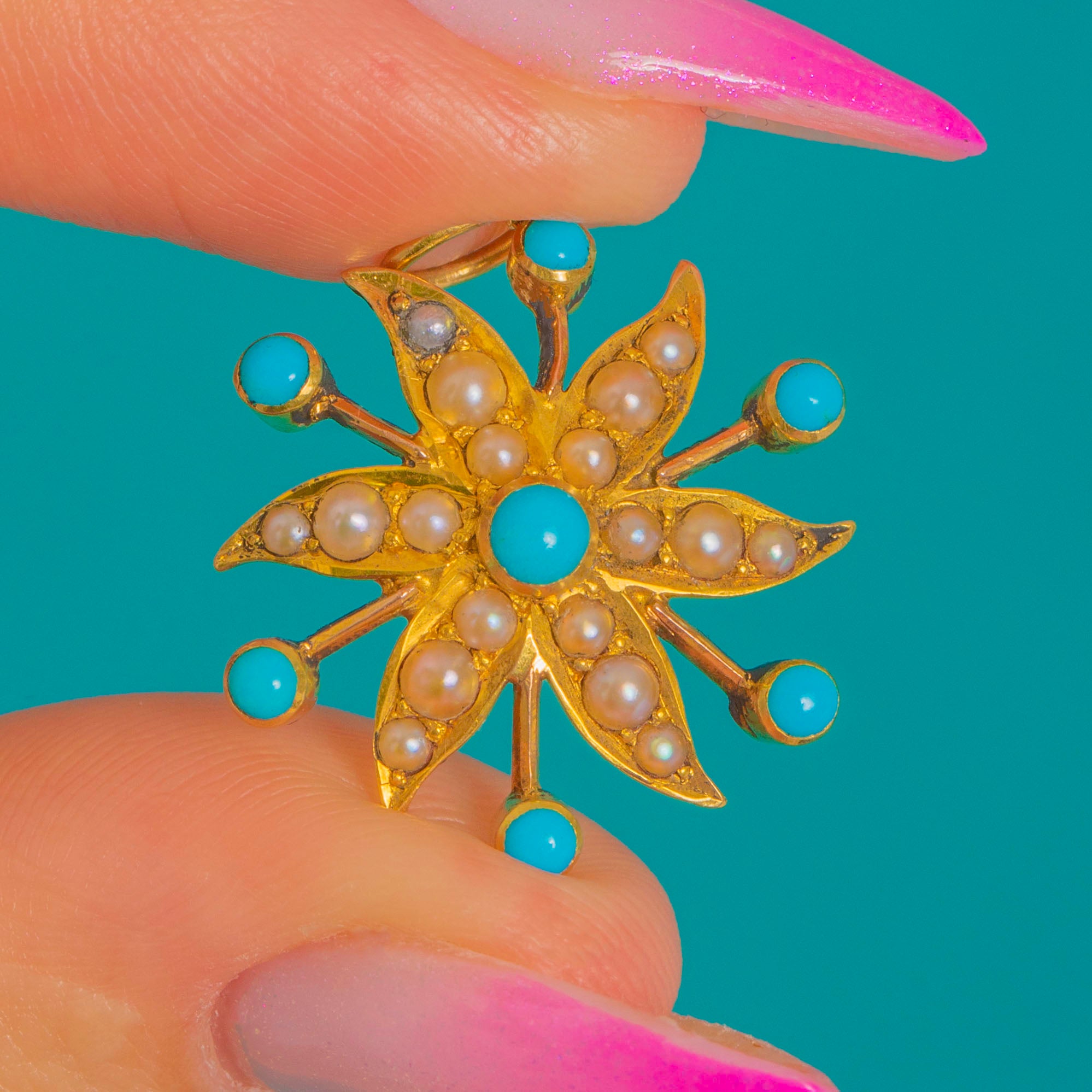 A luminous Victorian flower pendant crafted in rich 15ct Gold, centred on a vivid round Turquoise cabochon. From the heart of the piece, delicate petal-like rays unfold, each softly cupped and set with natural Seed Pearls to create a romantic, starburst bloom.