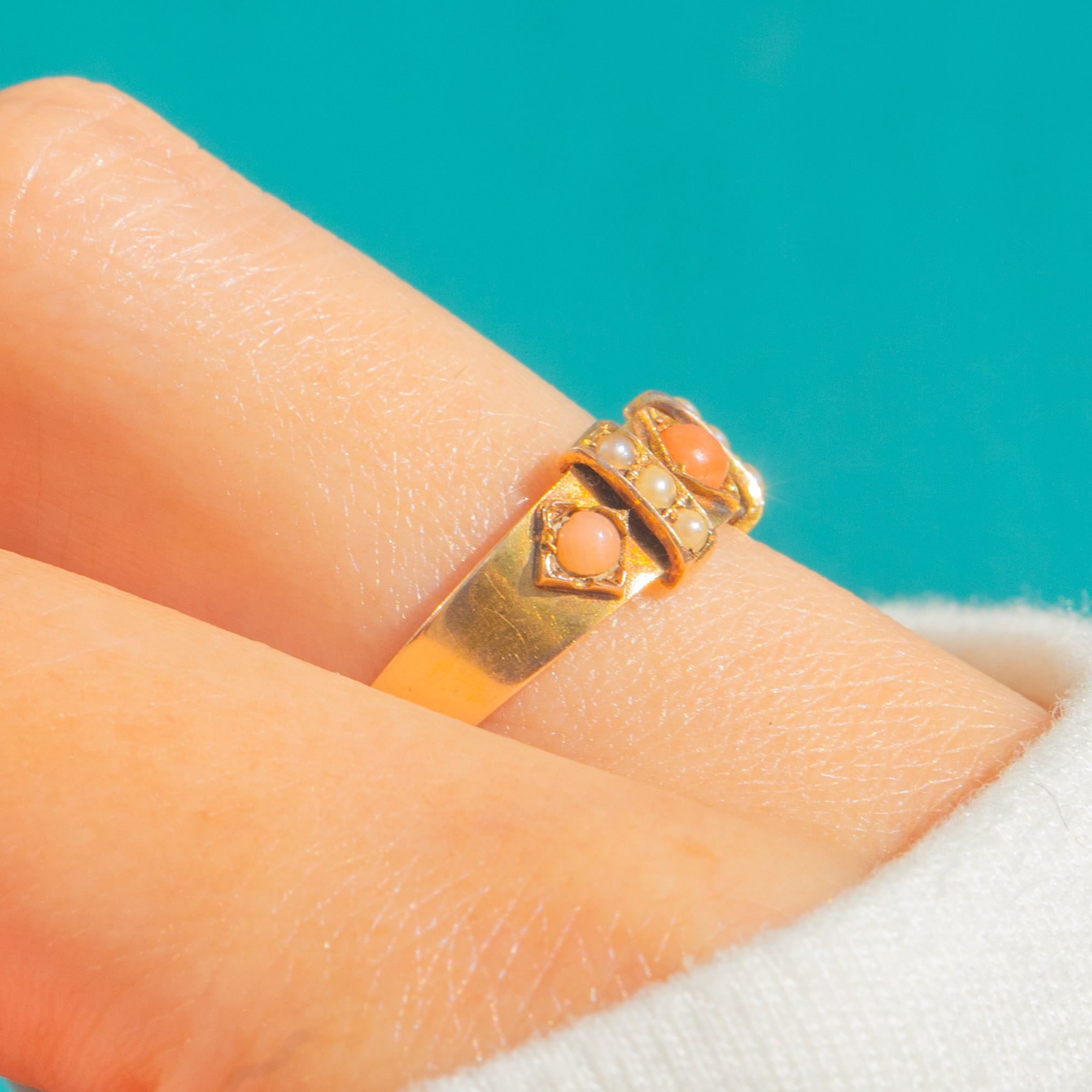 A delicate Victorian treasure, this slim 15ct Gold ring is set with glowing Coral cabochons and tiny lustrous Seed Pearls arranged in a refined lozenge-panel head. The alternating rows create a charming rhythm of warm orange-pink and soft cream, elevated by a hand-finished, multi-part construction that makes this ring completely unique.