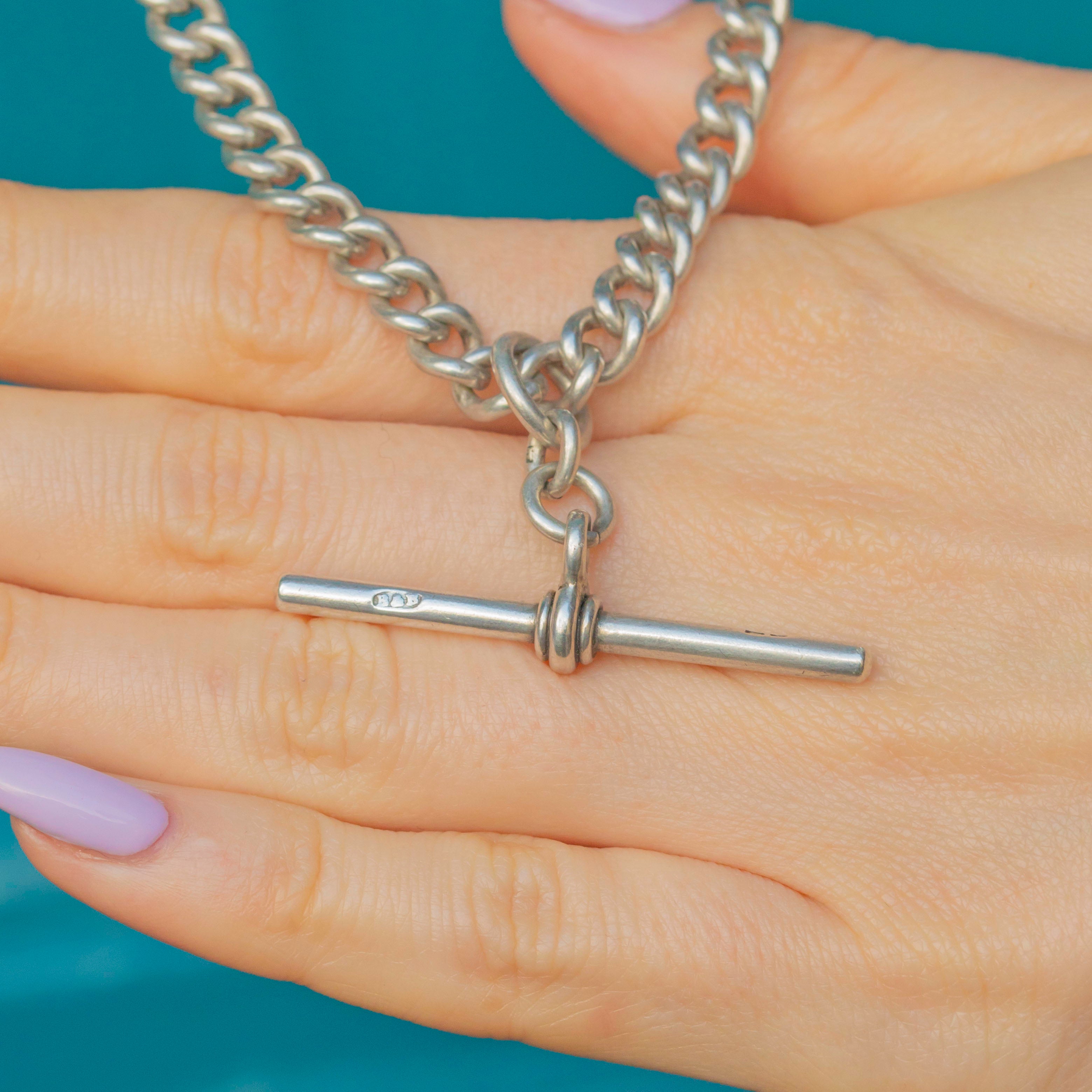 Crafted from over 40 grams of lustrous Sterling Silver, this chunky Edwardian chain features a large T-bar and two dog-clips, each adding a touch of unique charm. Dated to 1910 and with a desirable length of 16.5", this antique Silver Albert chain will make a wonderful addition to your collection.