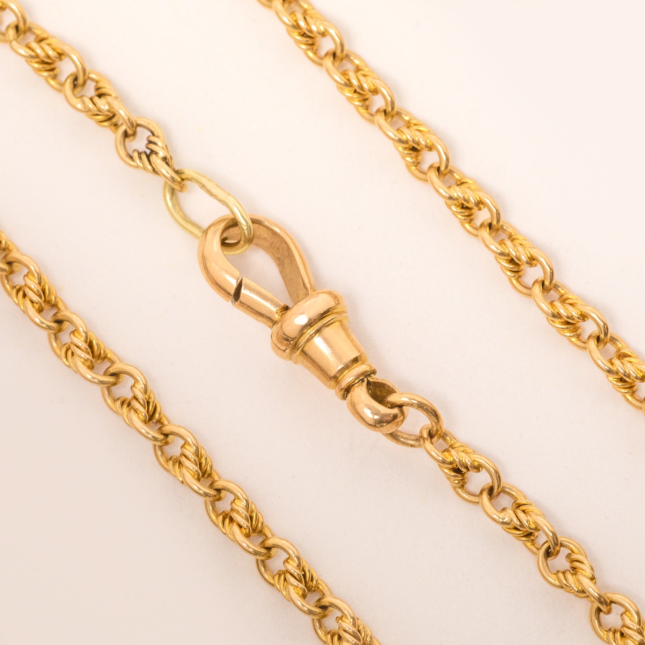 EXCELLENT. This 16" antique 15ct Gold lover's knot chain is in excellent condition. The lover's knots are perfectly intertwined and the Gold is bright and buttery throughout. The dog-clip is in perfect working order, so this splendorous Victorian Gold chain can be worn with confidence!
