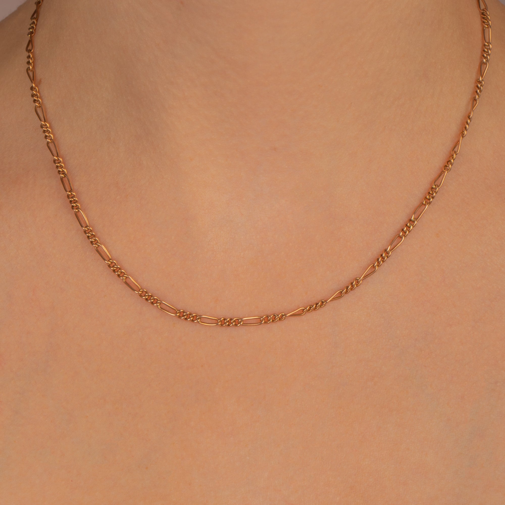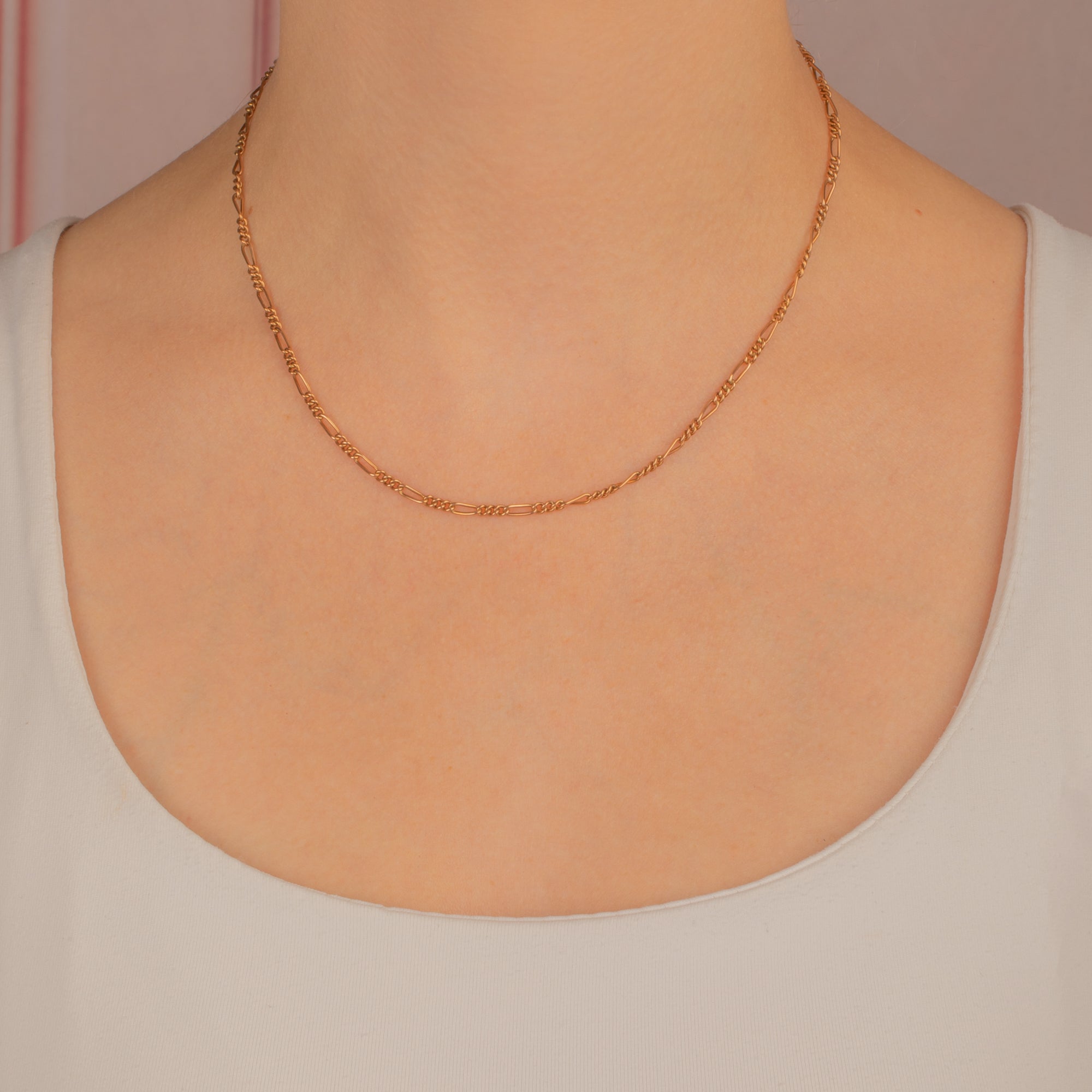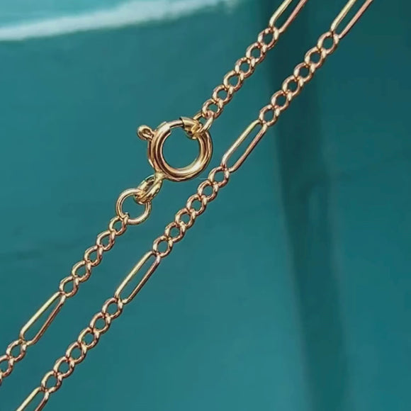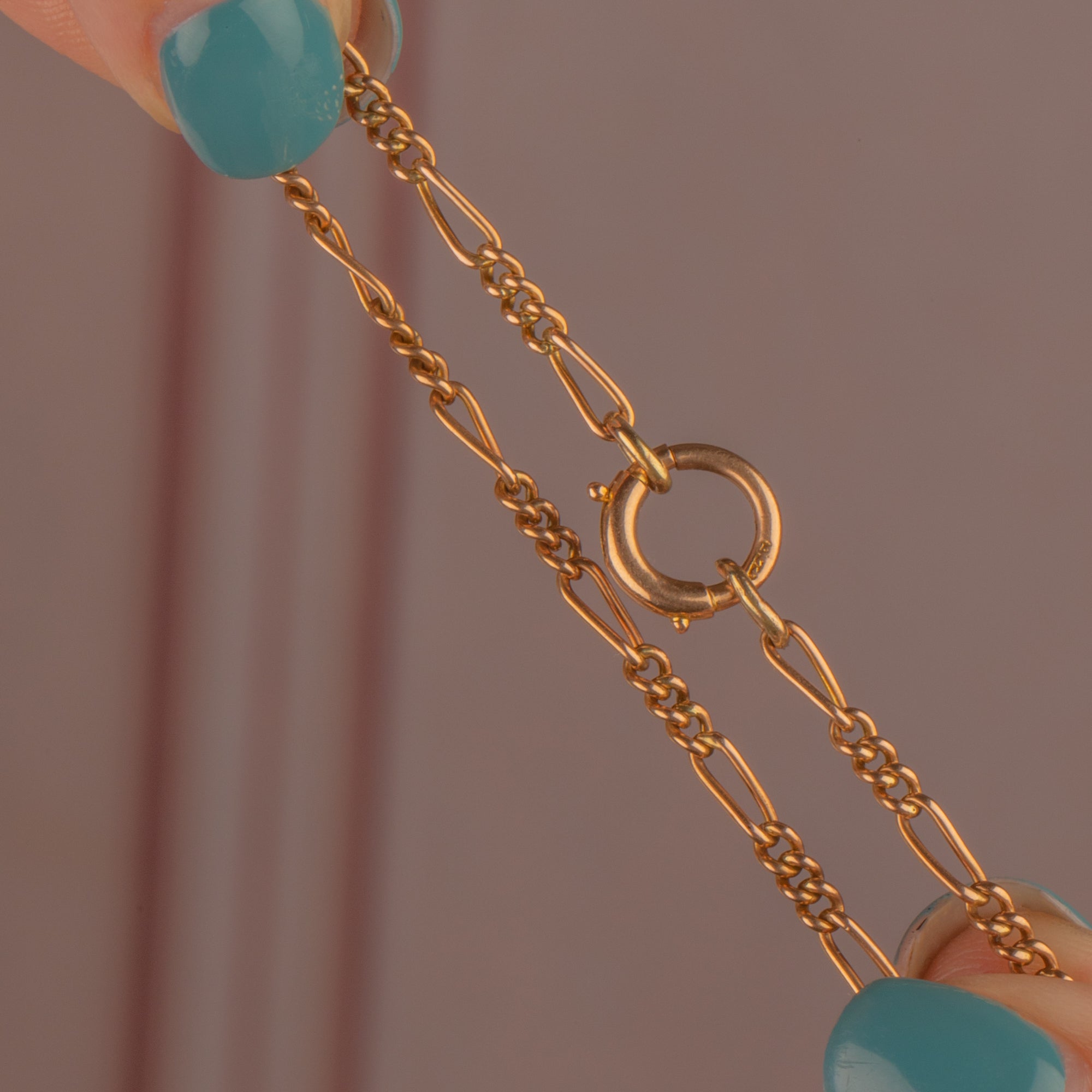 EXCELLENT. This 16" antique 9ct Gold Figaro chain is in mint condition. Her rich buttery Gold links have kept their gleaming tone over the years and are securely connected. The bolt ring closes with ease to allow for confident and reliable wear!