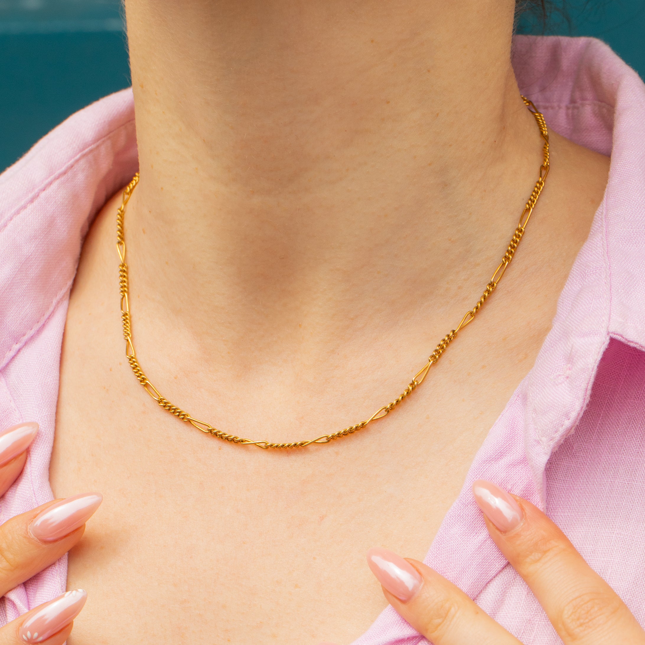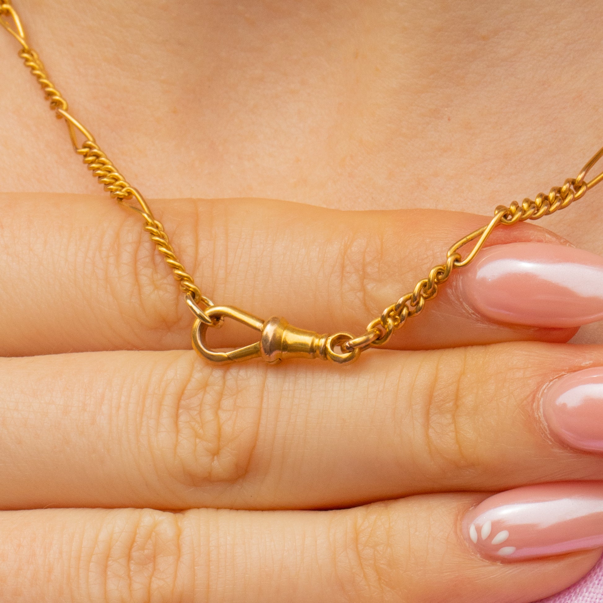 This 16" antique 9ct Gold figaro chain is a delicate delight. Boasting perfectly formed petite flattened links, her splendour is sure to win your heart!