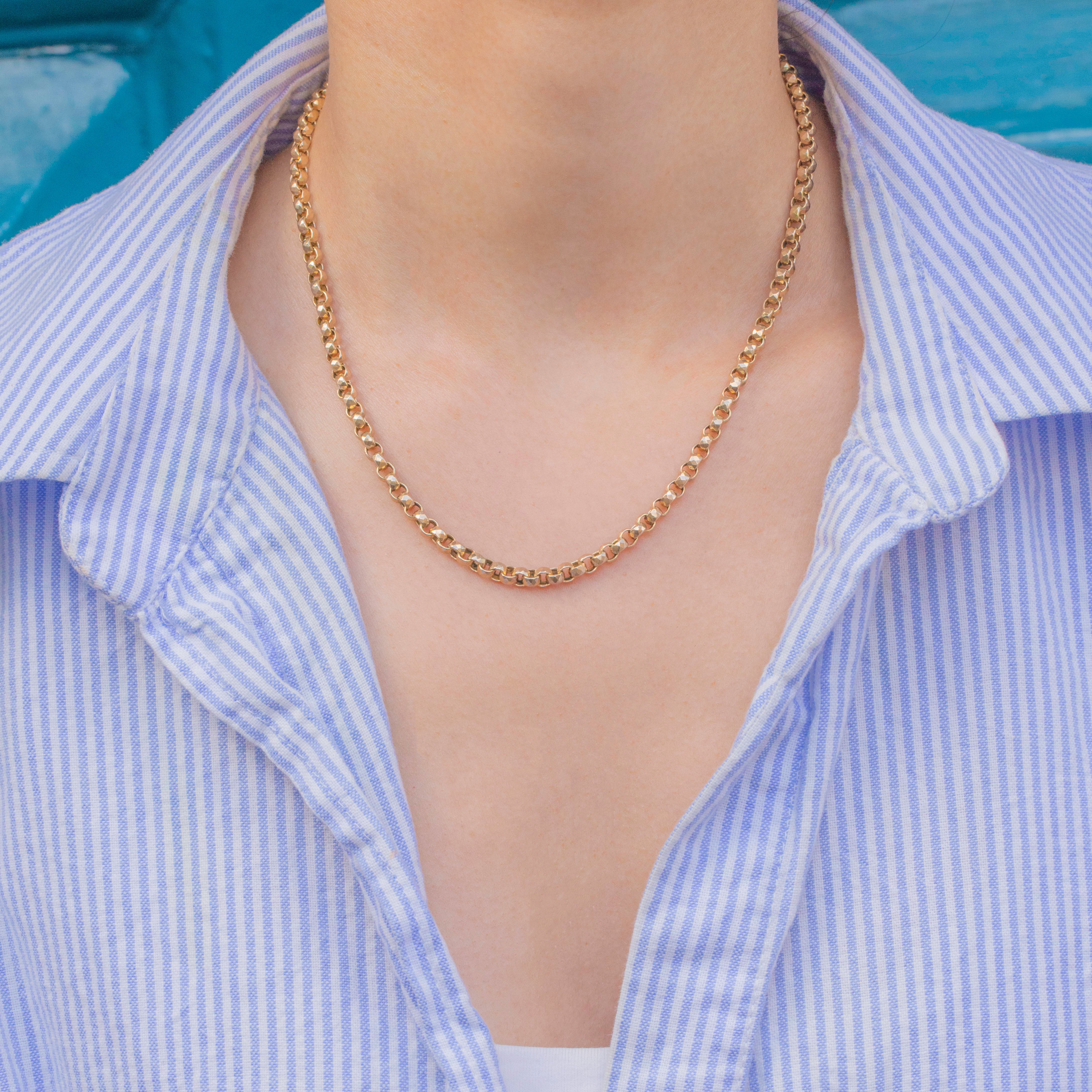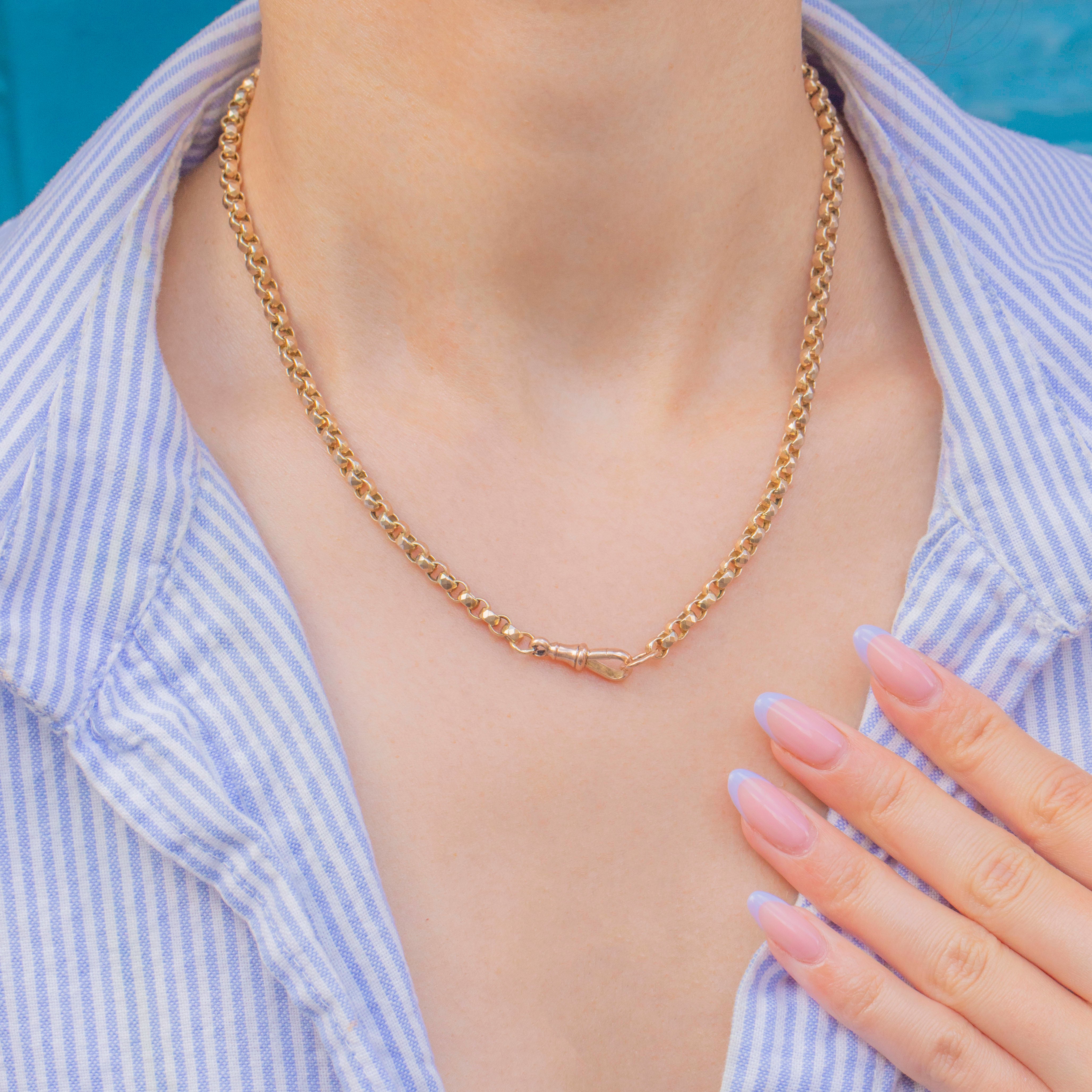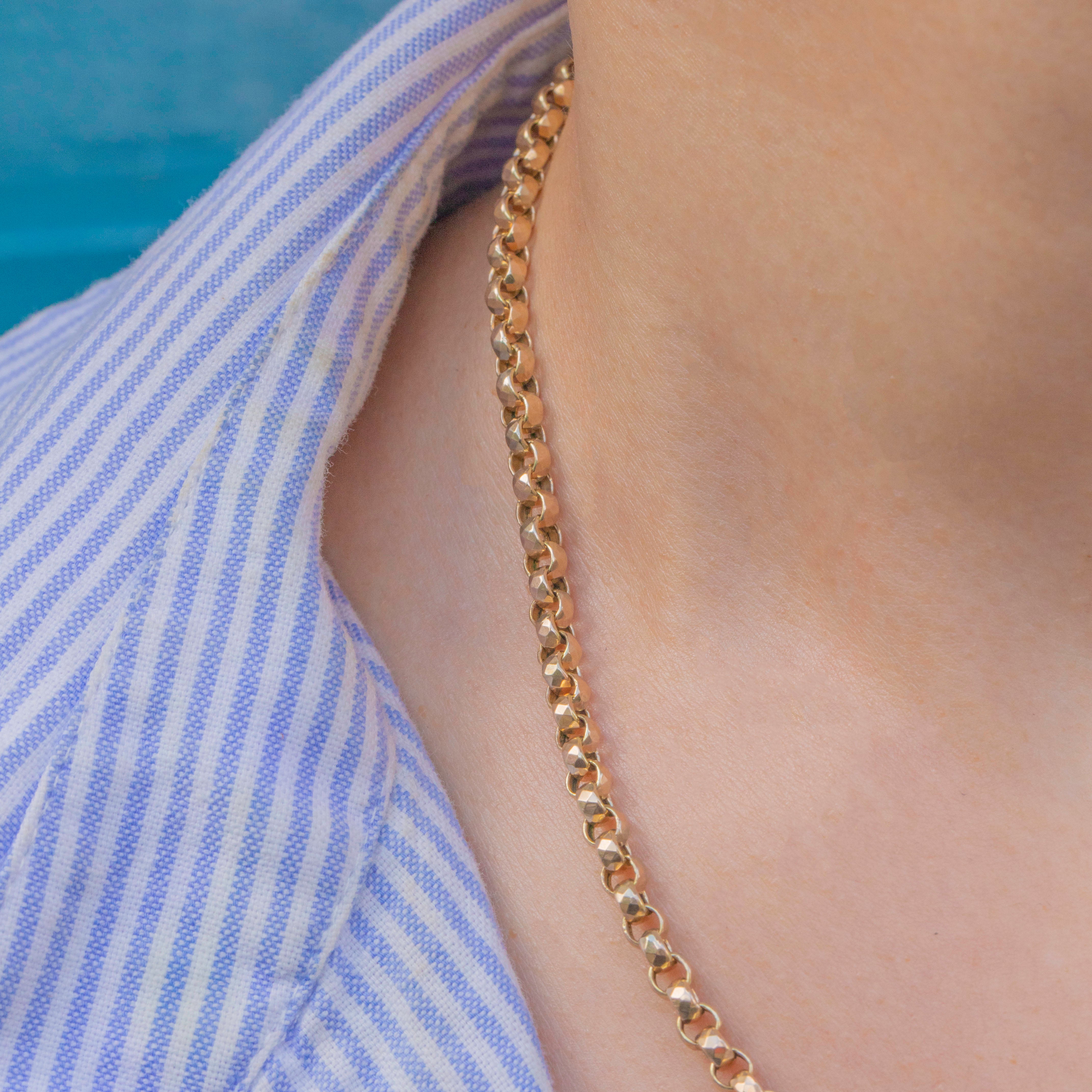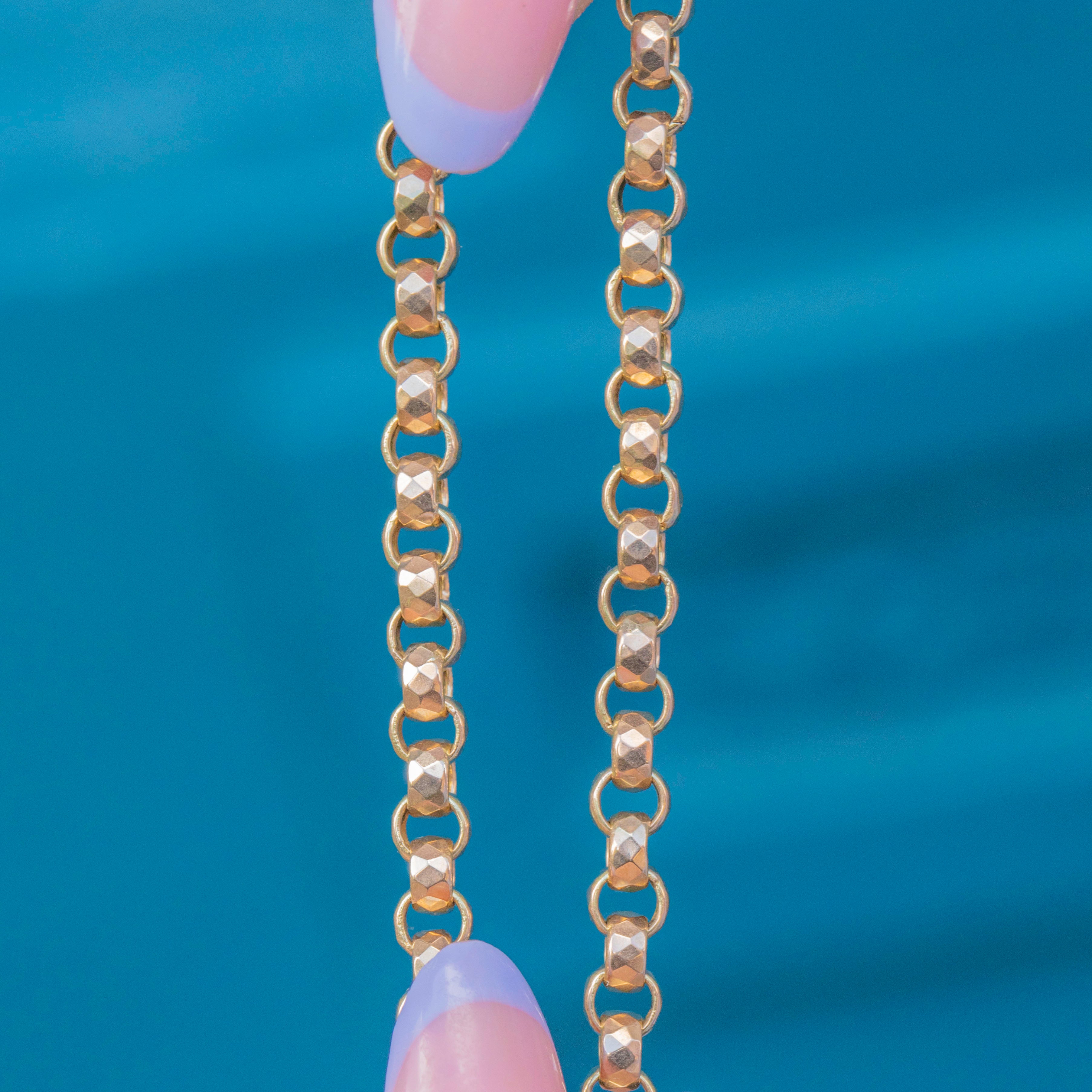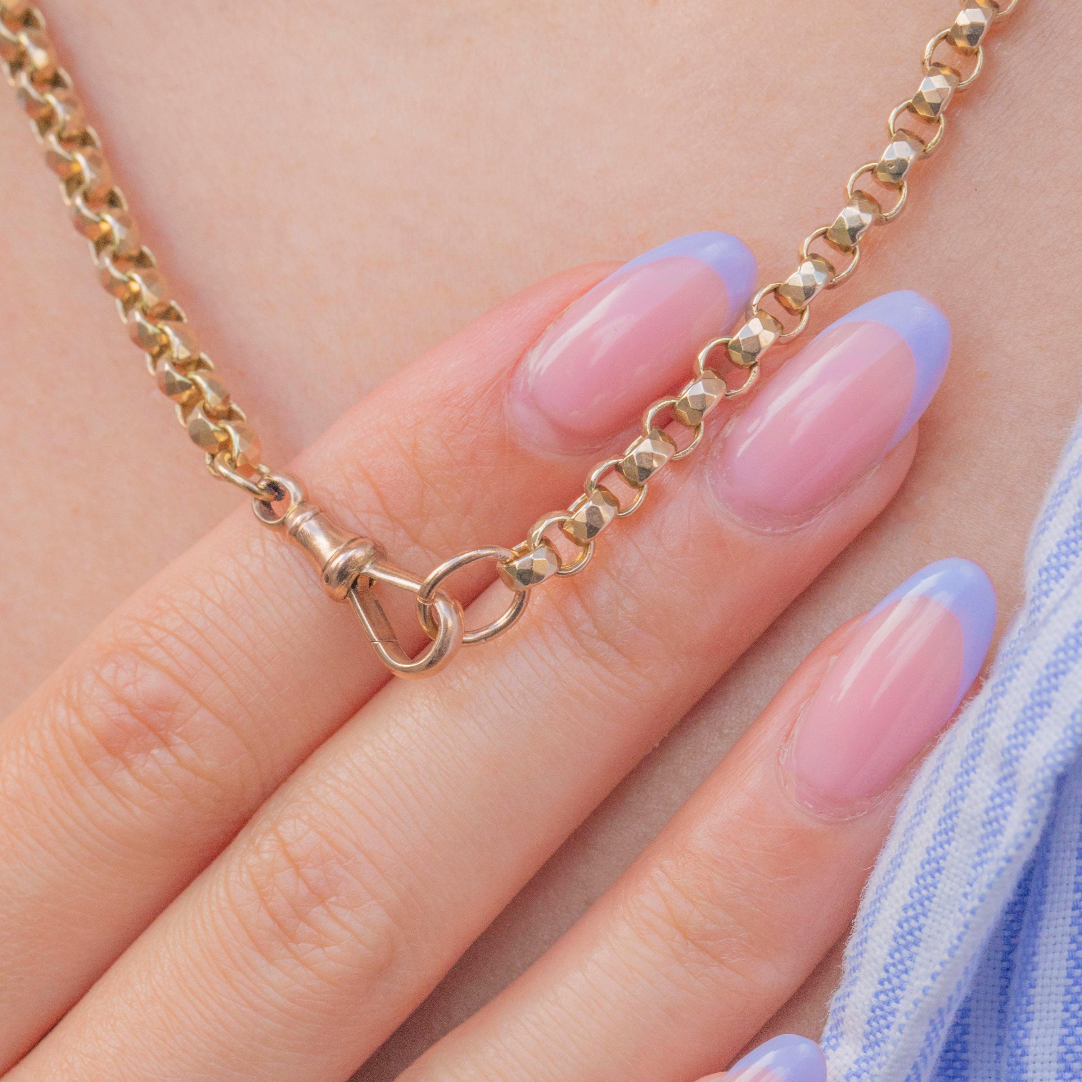 This antique chunky 9ct Gold faceted belcher chain is fun and fabulous! A timeless piece to wear at every occasion, this solid 9ct Gold chain is complete with a Victorian dog clip to attend to all your charm holding needs.