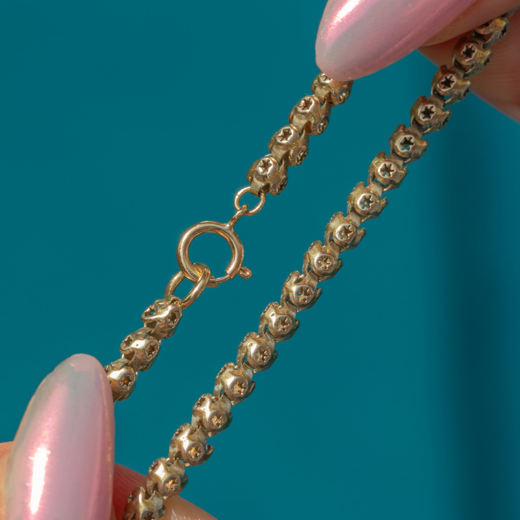 A classic example of Victorian jewellery, this antique Gold cased chain is made up of chubby box links, each side adorned with a hand-pierced star detail!