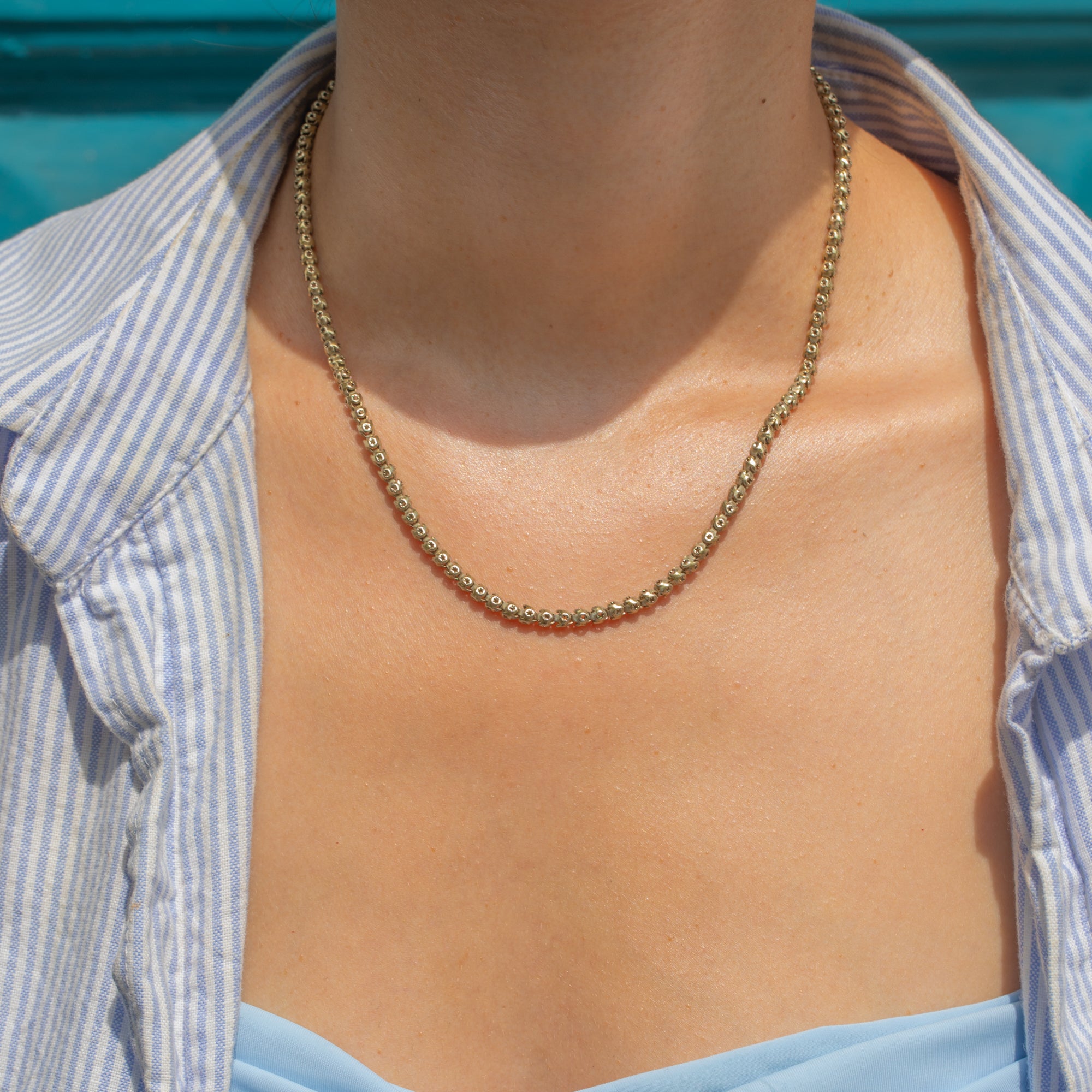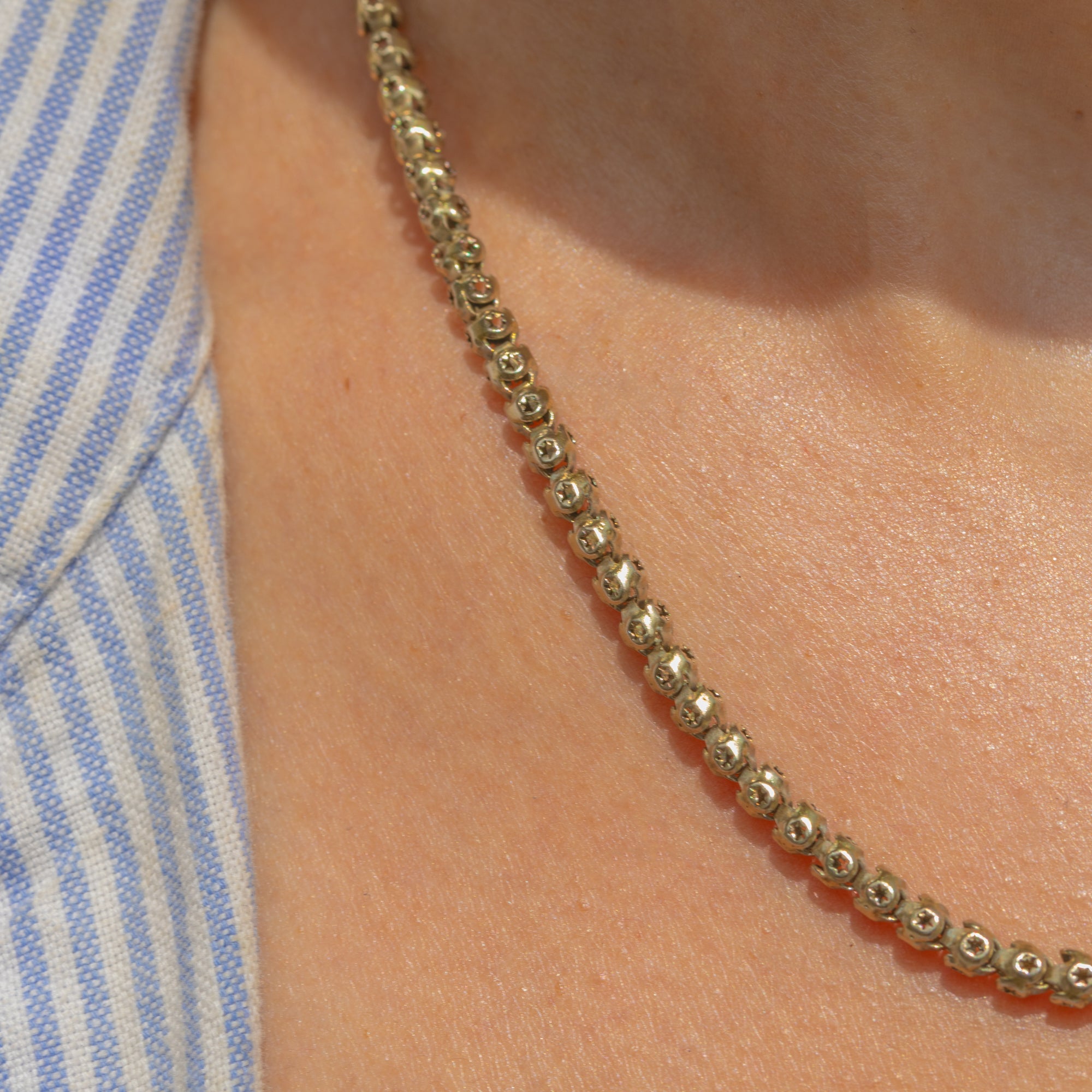At 16 inches long, this Victorian chain rests delicately across the collarbones and is perfect for being worn as a standalone piece or stacked in a modern chain mess!