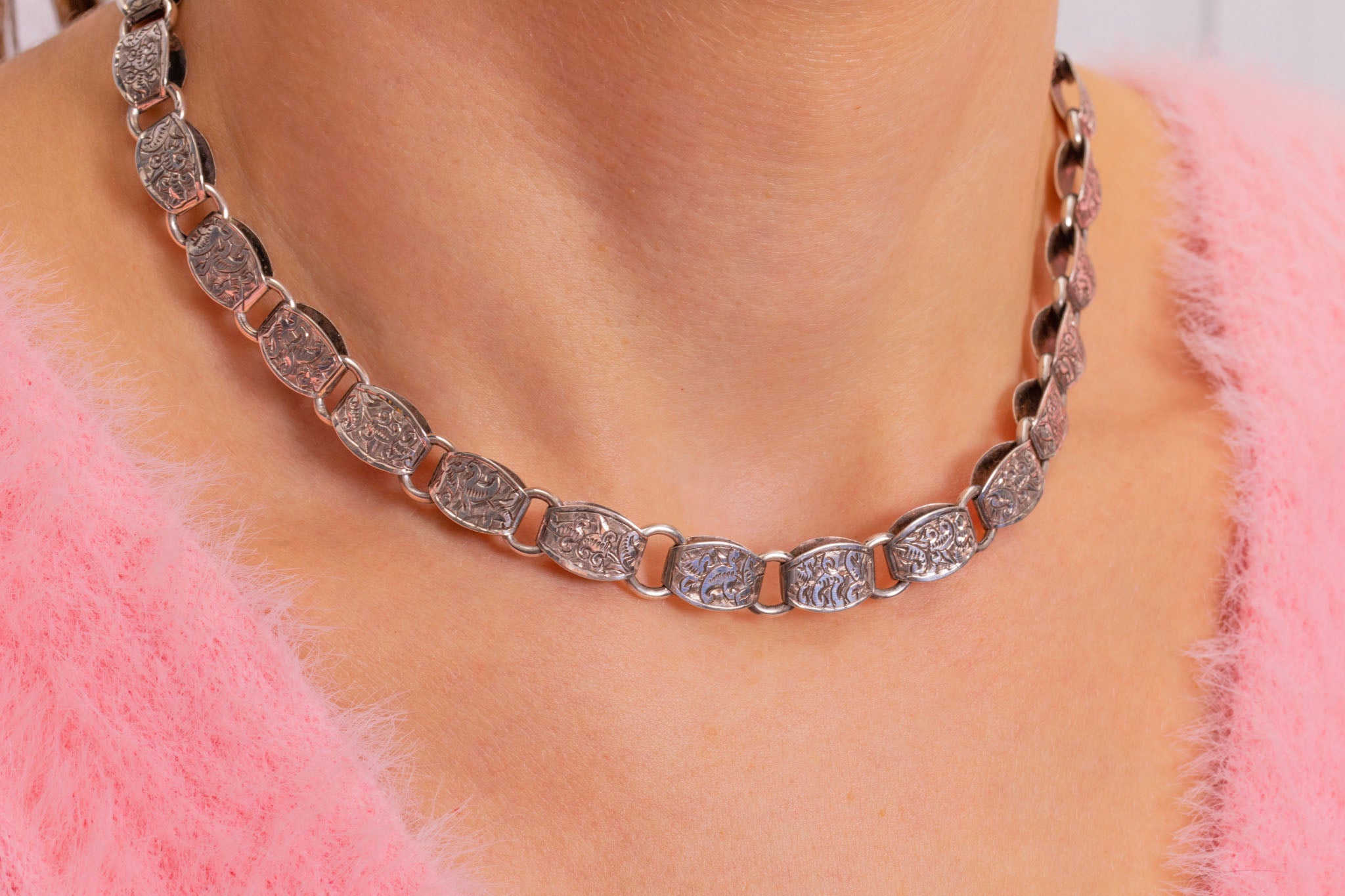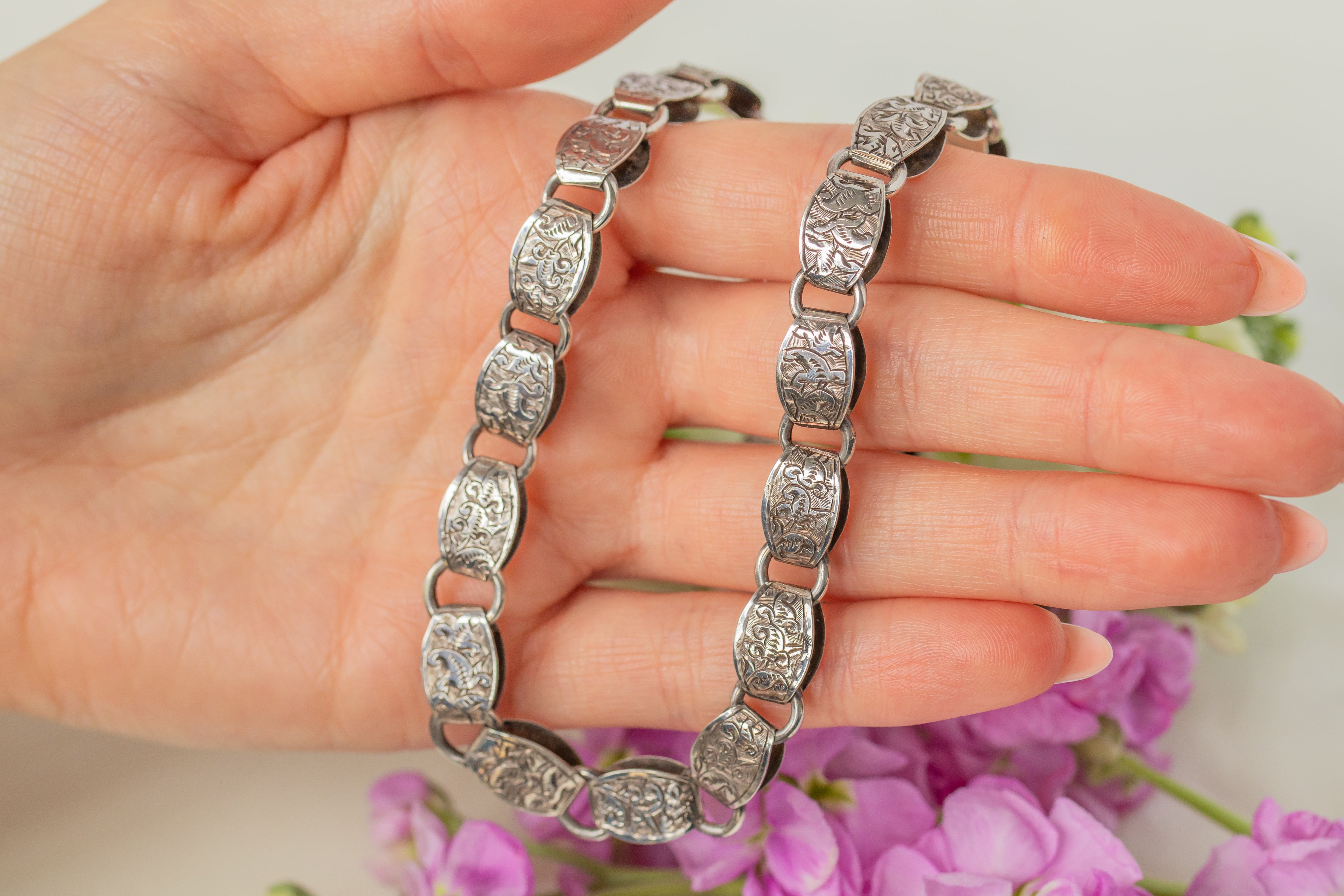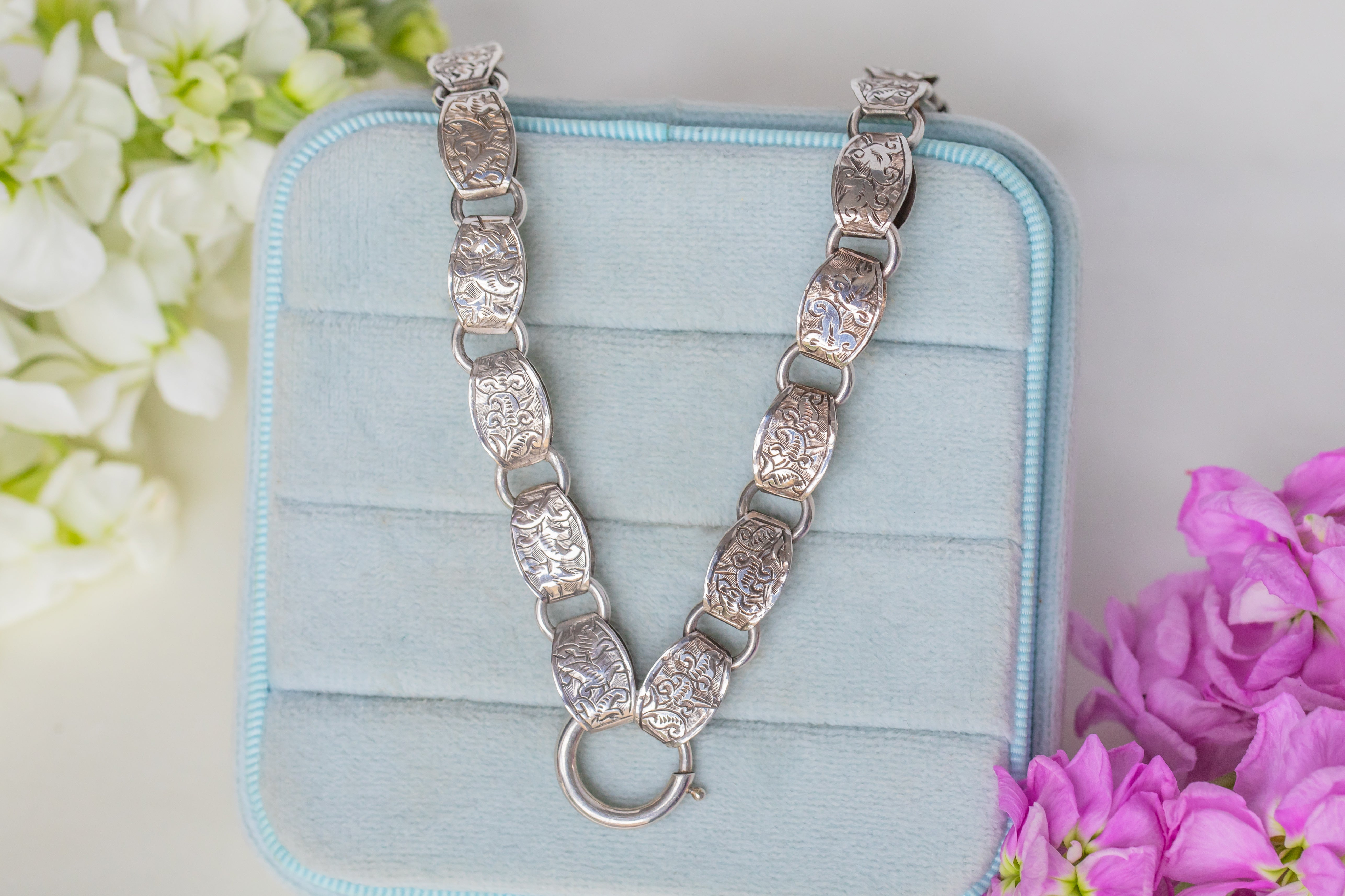 VERY GOOD. This 16" antique Silver engraved book chain necklace is in very good condition. The necklace has lovely flat links that will sit flush against the chest and the engravings are unique to each link, which have all been securely attached to the next. The chain has minimal surface wear, only some age spots on a few of the links. One of the links has been repaired throughout its lifespan, but given her age, this is hardly surprising and the job has been done well so you can cherish her for decades to come. The bolt ring closes securely allowing you to personalise this chain with a pendant or locket and wear her confidently!