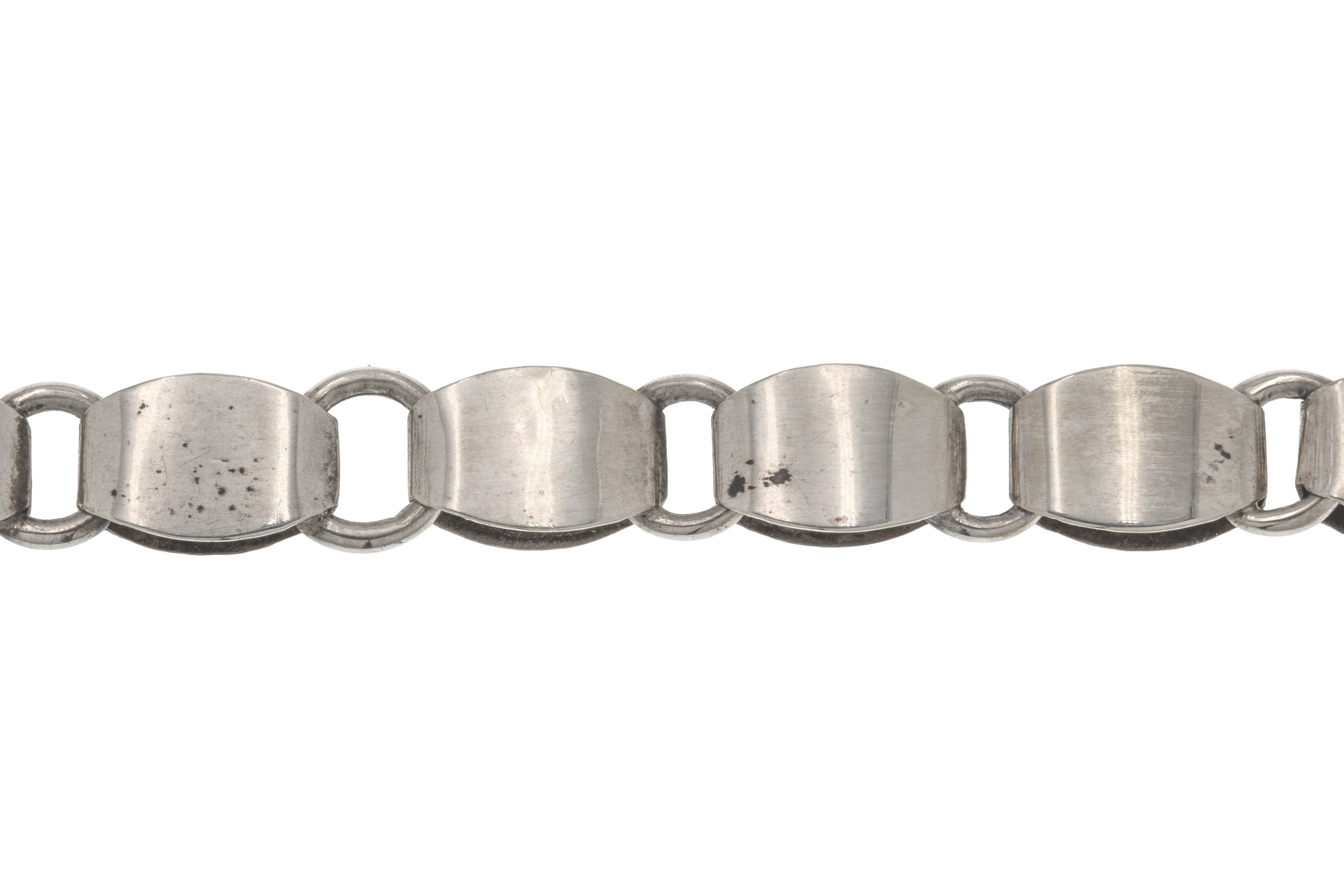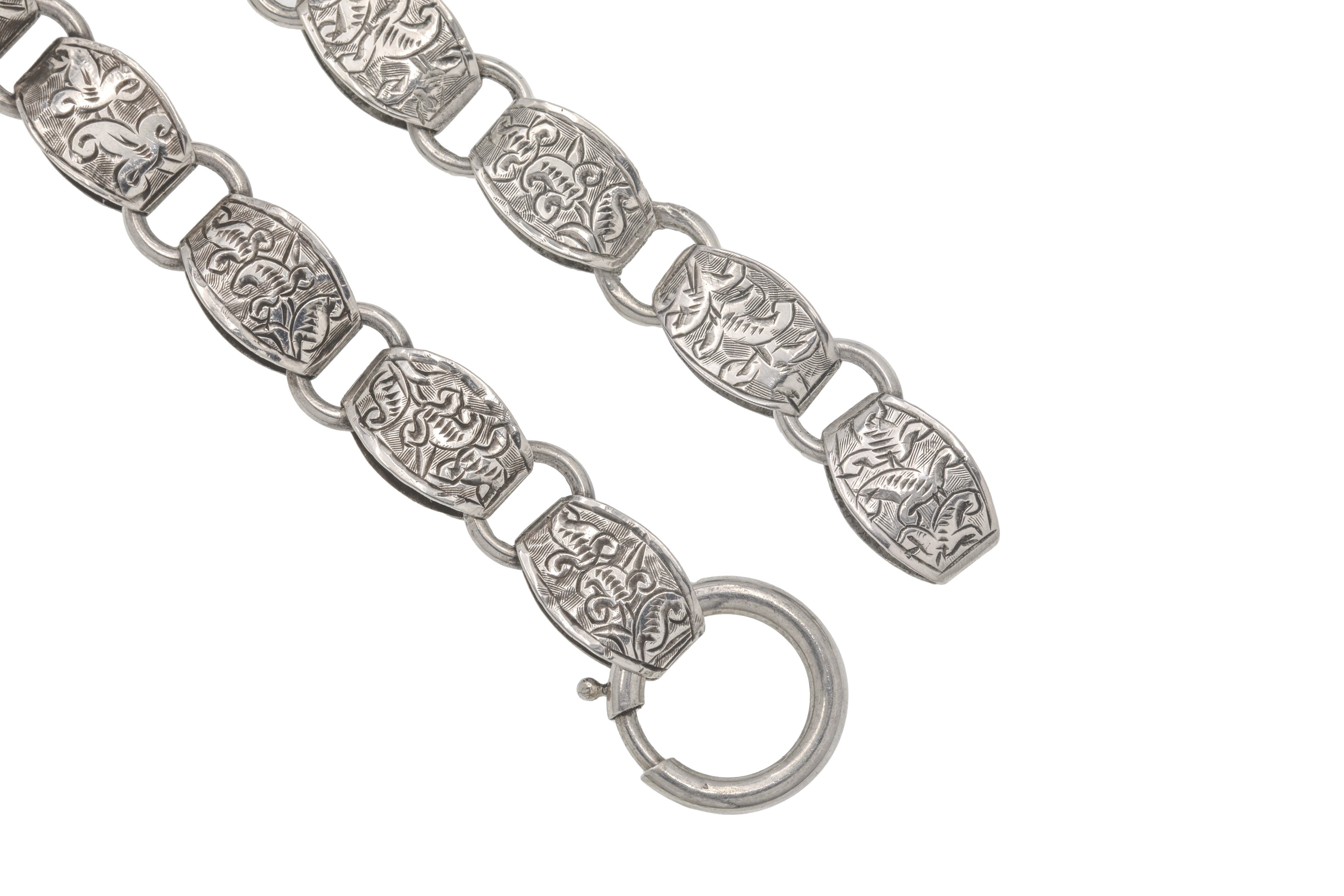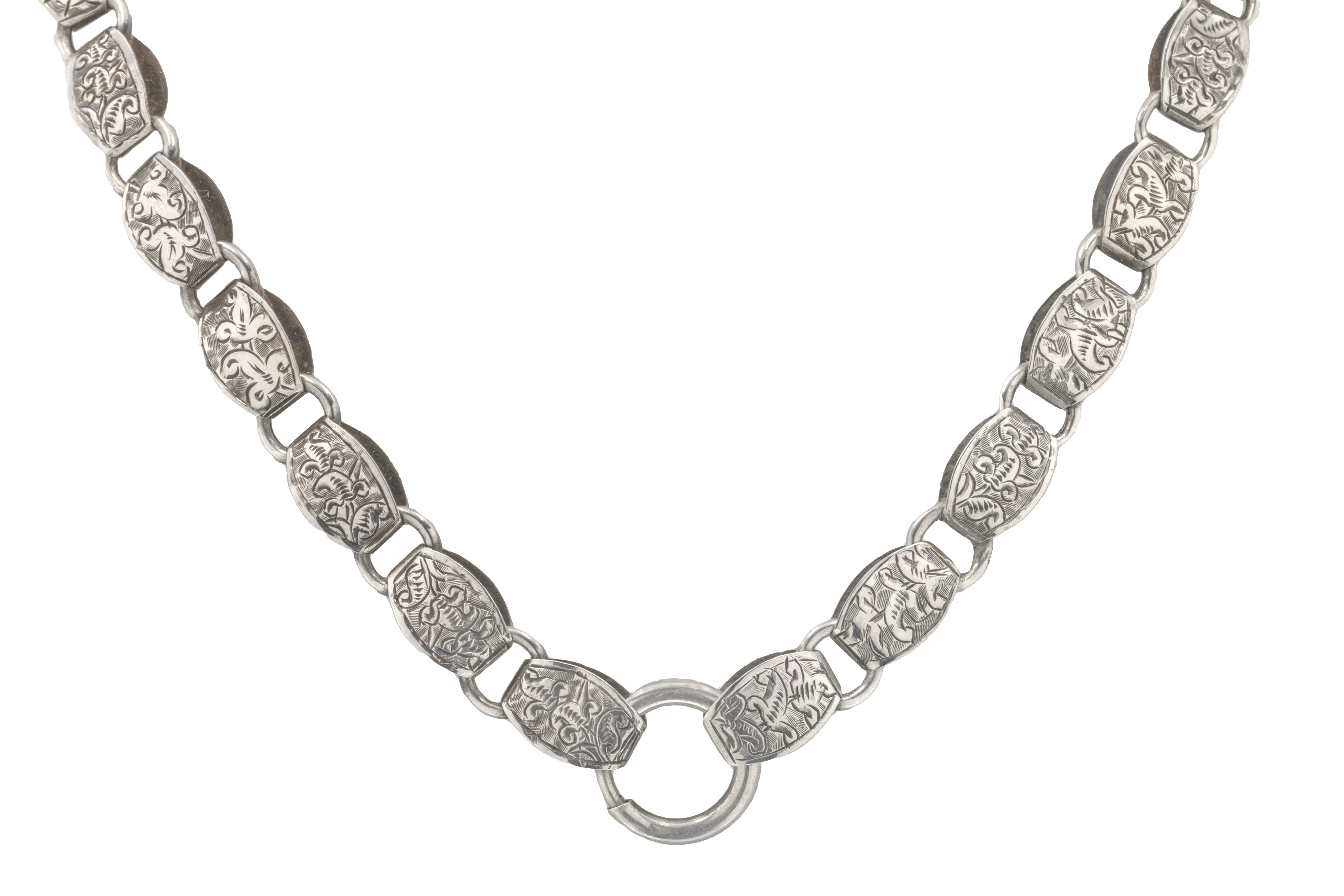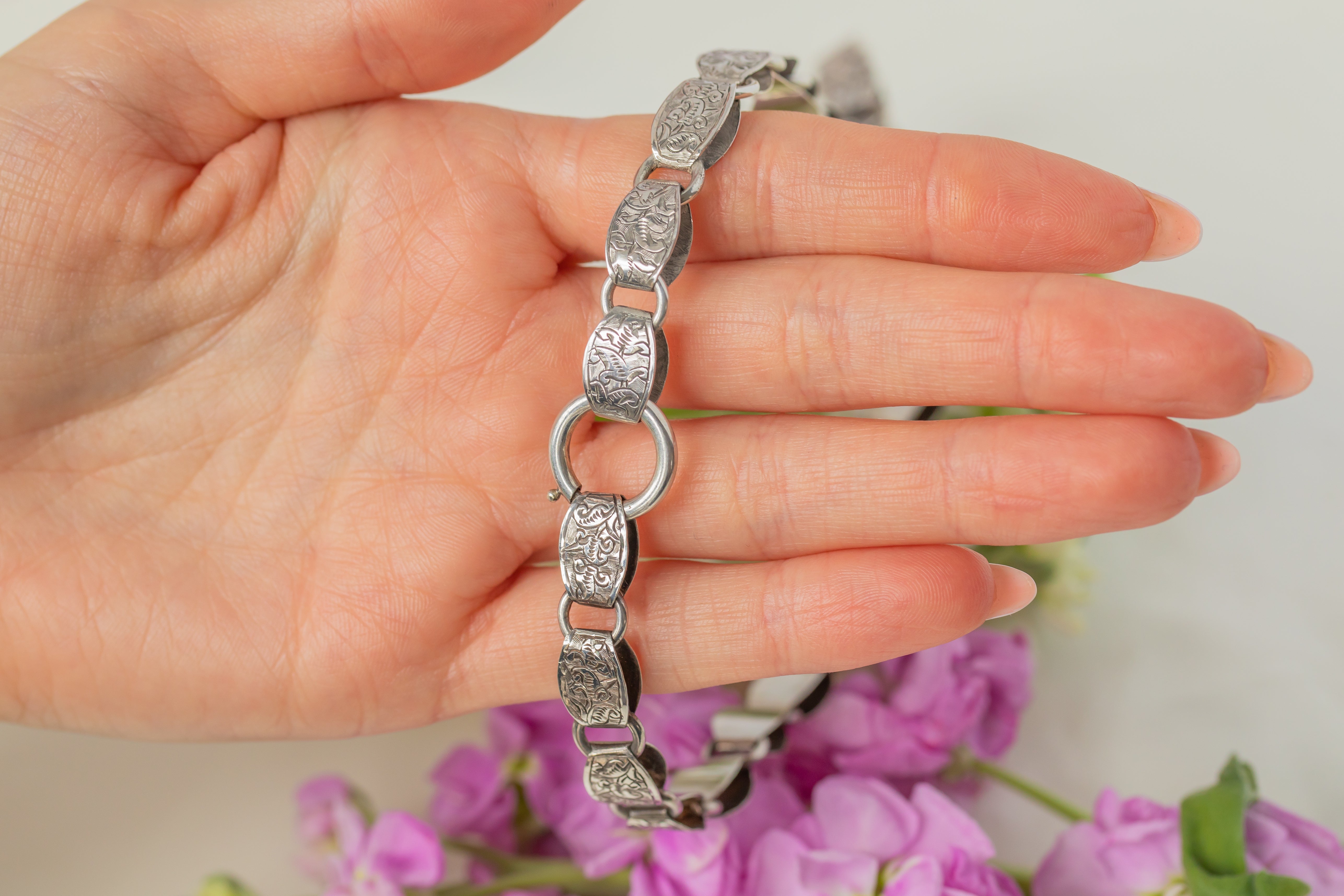 VERY GOOD. This 16" antique Silver engraved book chain necklace is in very good condition. The necklace has lovely flat links that will sit flush against the chest and the engravings are unique to each link, which have all been securely attached to the next. The chain has minimal surface wear, only some age spots on a few of the links. One of the links has been repaired throughout its lifespan, but given her age, this is hardly surprising and the job has been done well so you can cherish her for decades to come. The bolt ring closes securely allowing you to personalise this chain with a pendant or locket and wear her confidently!