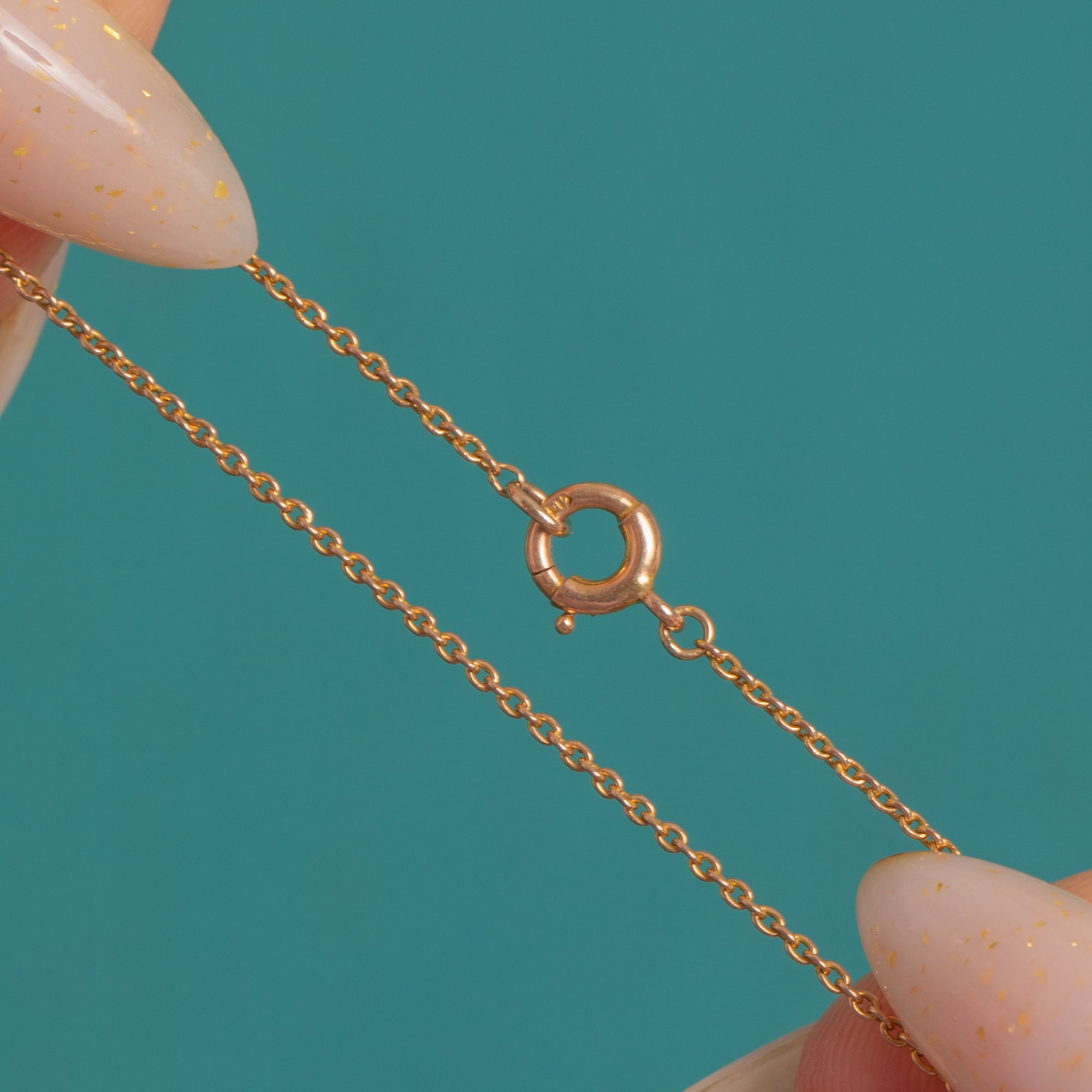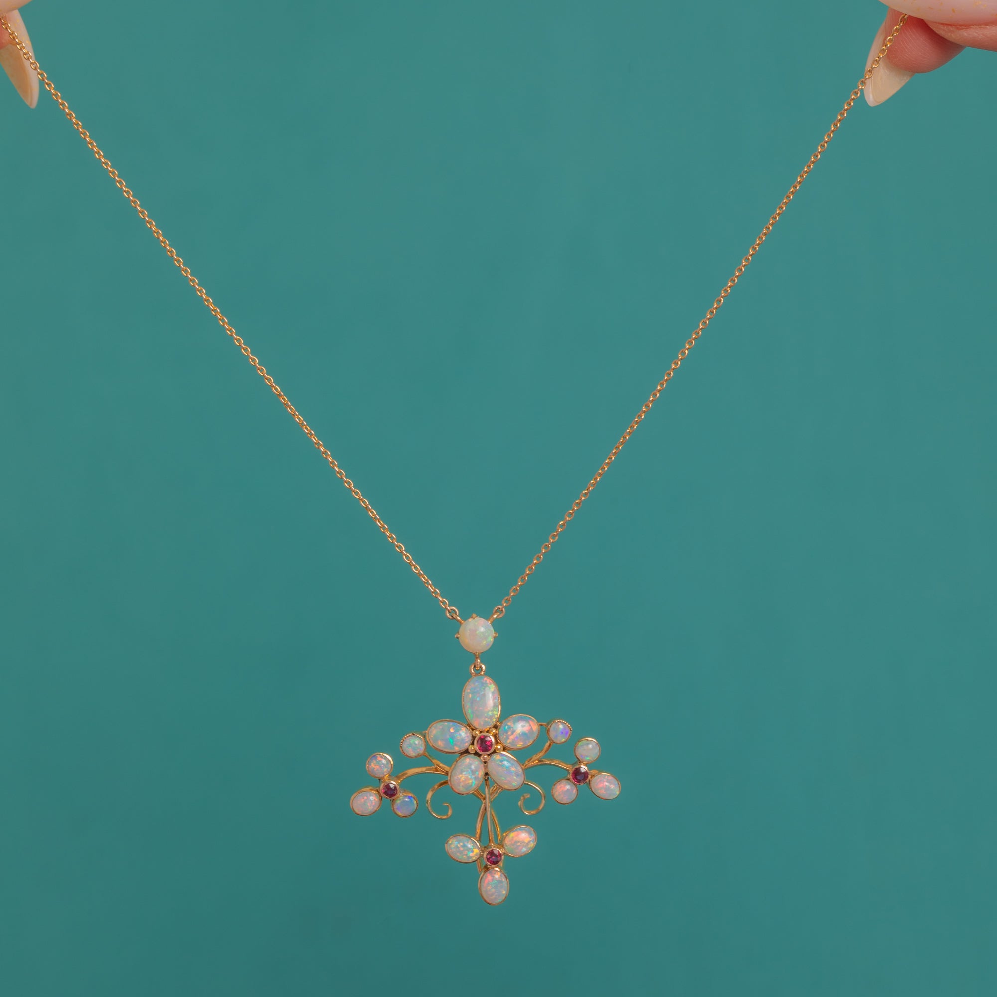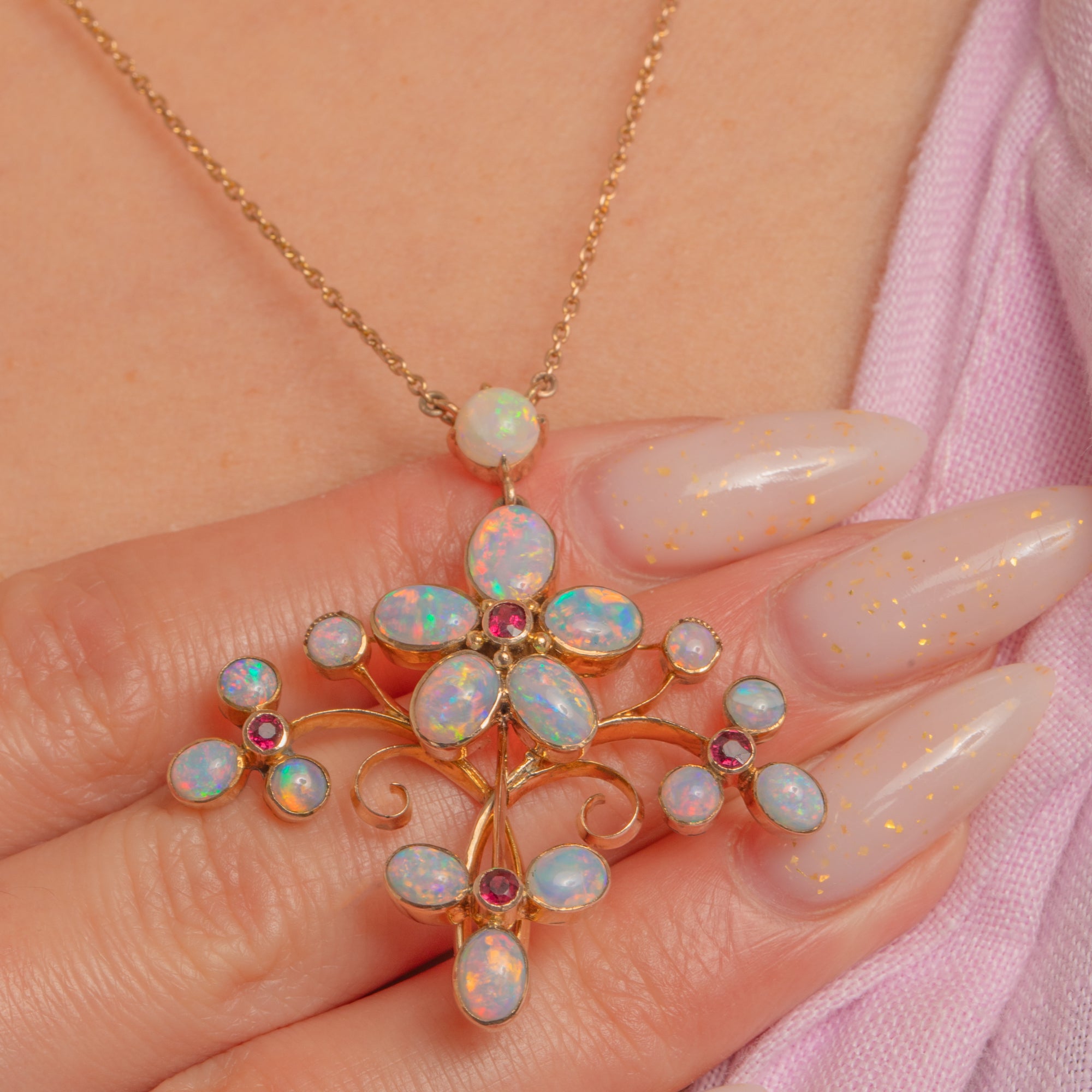 Set in warm 9ct Gold and suspended from a fine 15ct Gold chain, the Opals display lively blue, green and orange flashes, while the Rubies lend a delicate pop of pinkish-red sparkle. Elegant, feminine and endlessly wearable, it’s a timeless jewel from the golden age of Art Nouveau.
