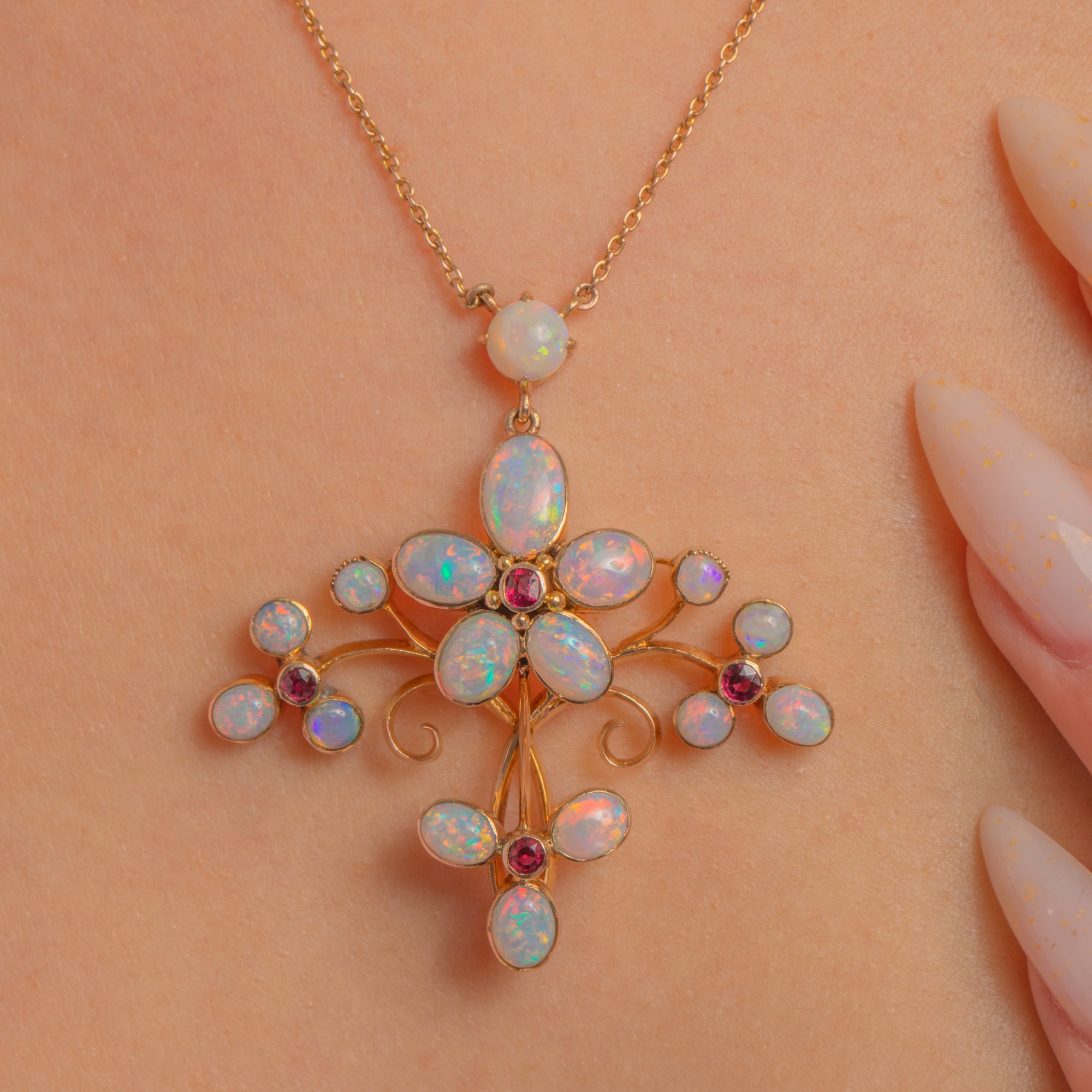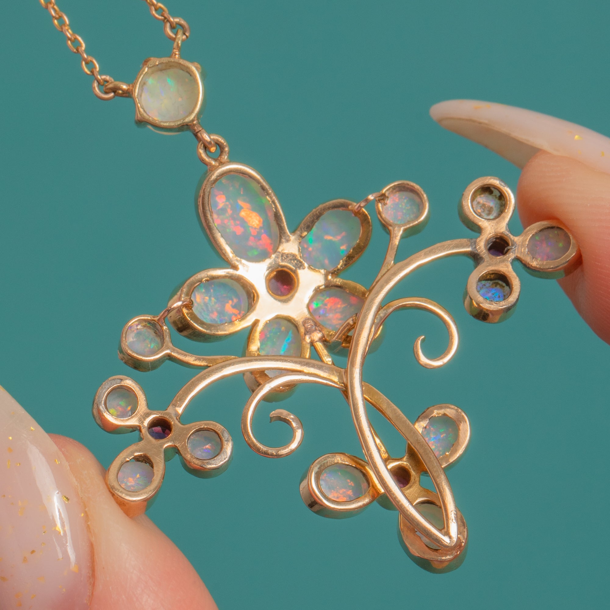 16" Art Nouveau 9ct Gold Floral Opal Ruby Necklace