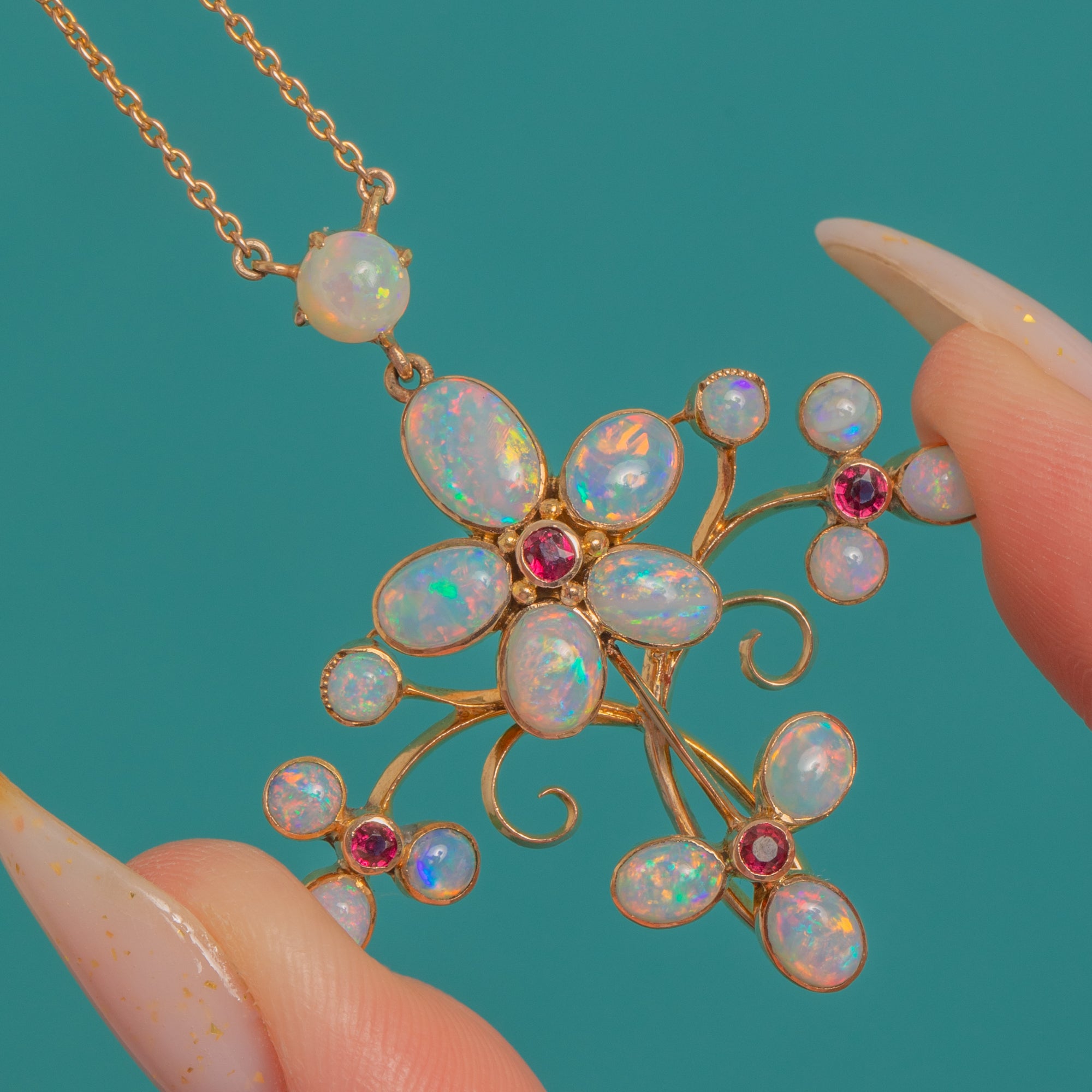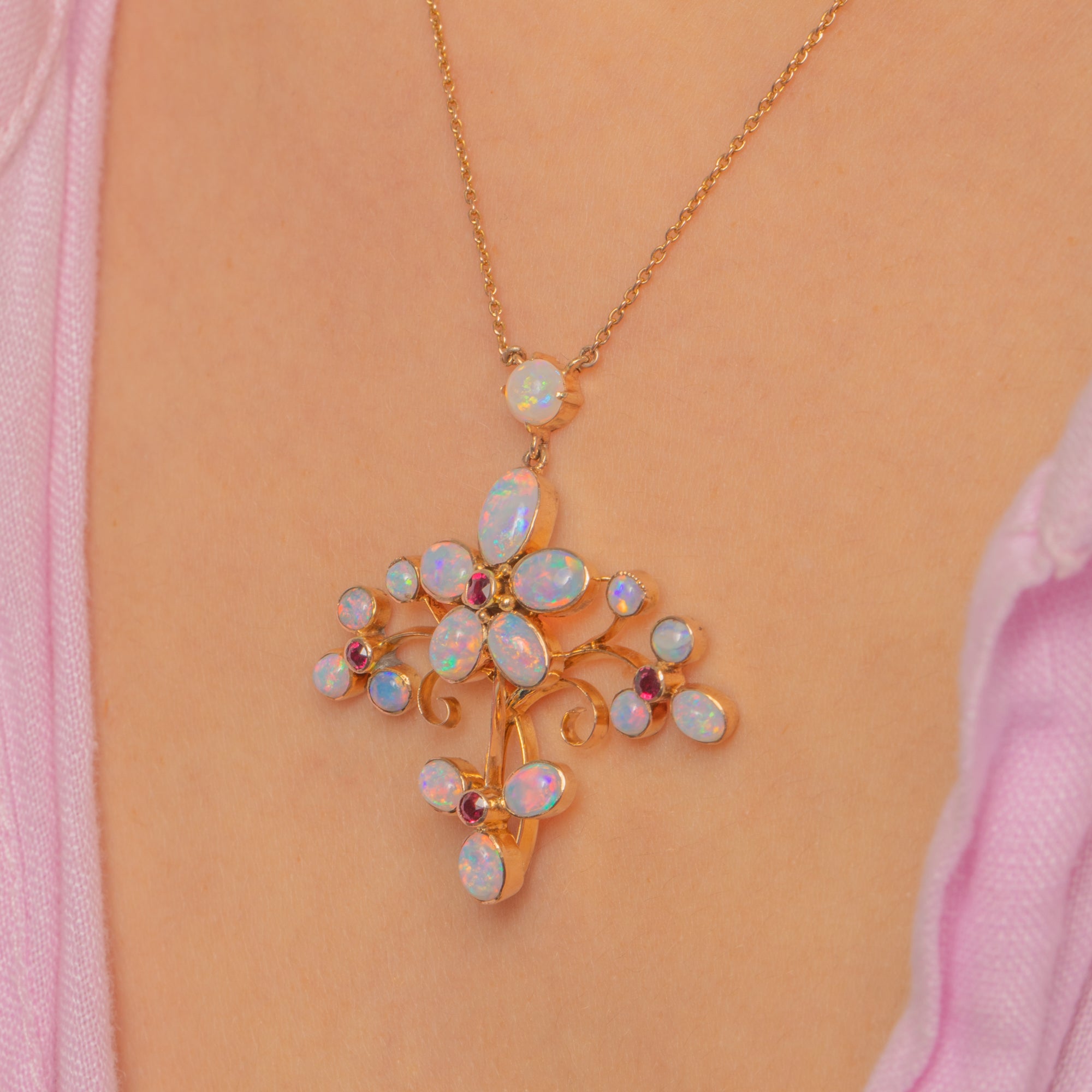 A romantic Art Nouveau lavalier, this openwork pendant dances with iridescent Opals and petite Ruby accents across curling foliate scrolls. The smooth rub-over settings and airy framework capture the era’s signature “whiplash” curves, with an articulated round surmount above and a graceful drop below for beautiful movement on the neckline.