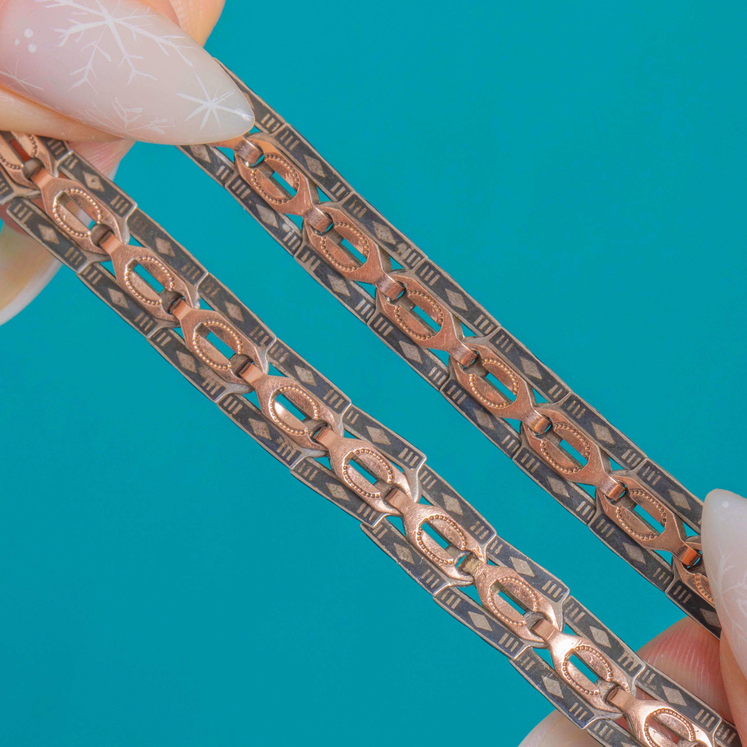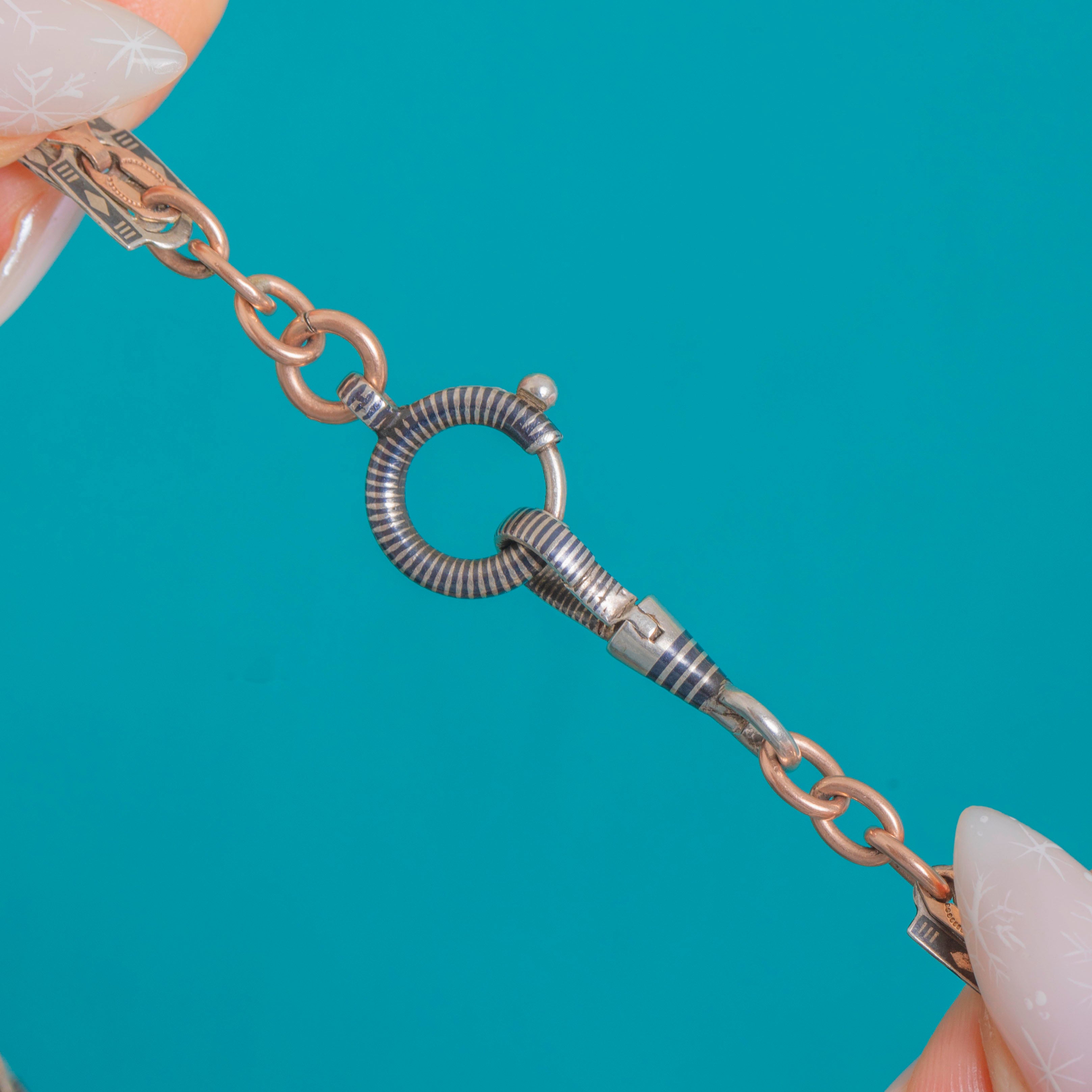 EXCELLENT: The niello is in fabulous condition with strong, even contrast and only light surface wear to the high points. The articulated links lie flat and move smoothly with an attractive, even patina. No obvious dents, losses or visible repairs.