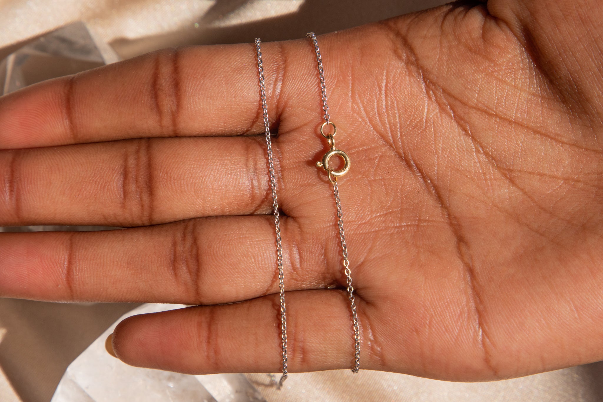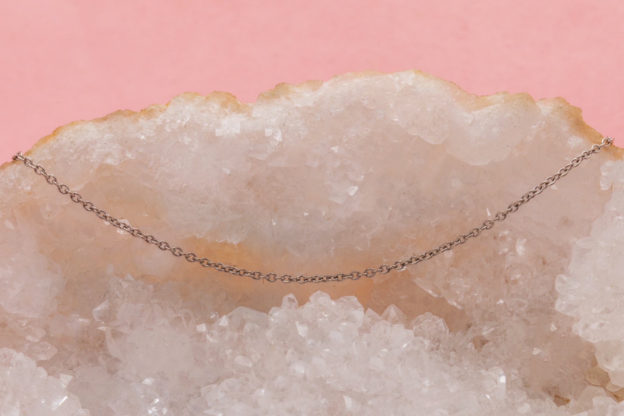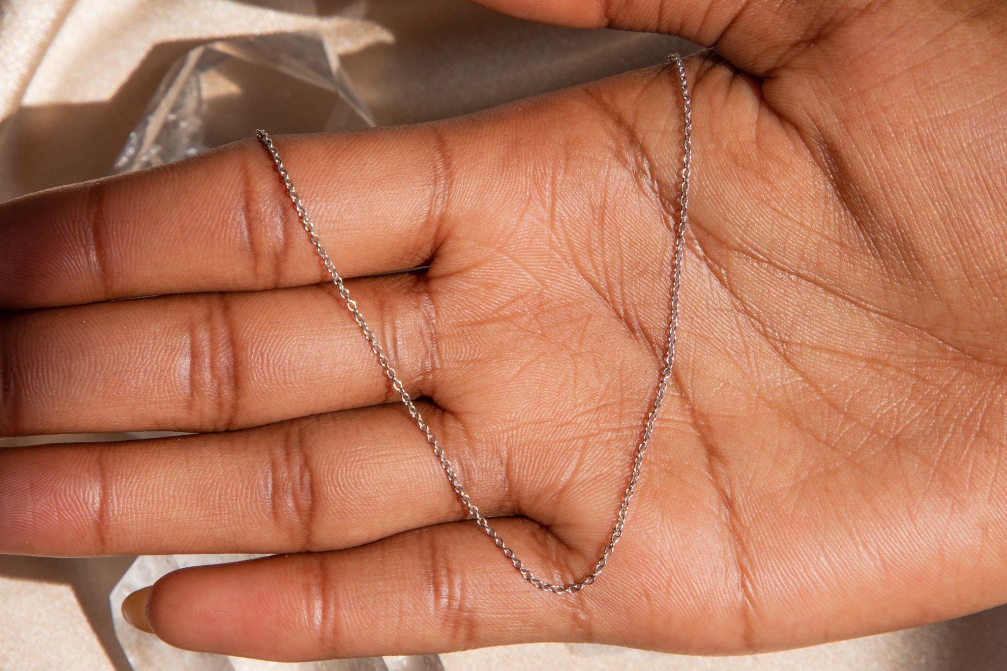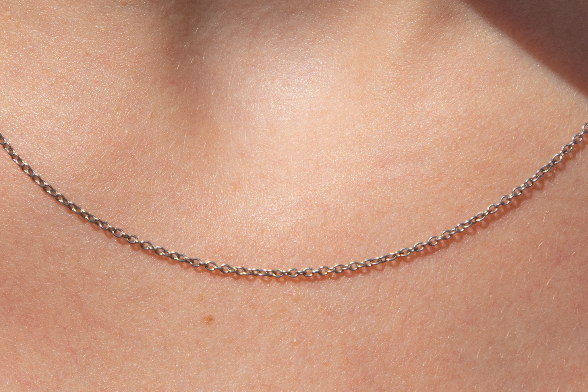 A simple 16" Italian 18ct White Gold pendant chain to add to your collection. This skinny trace chain boasts a cool, bright sheen throughout and will easily hold your favourite charms and pendants.