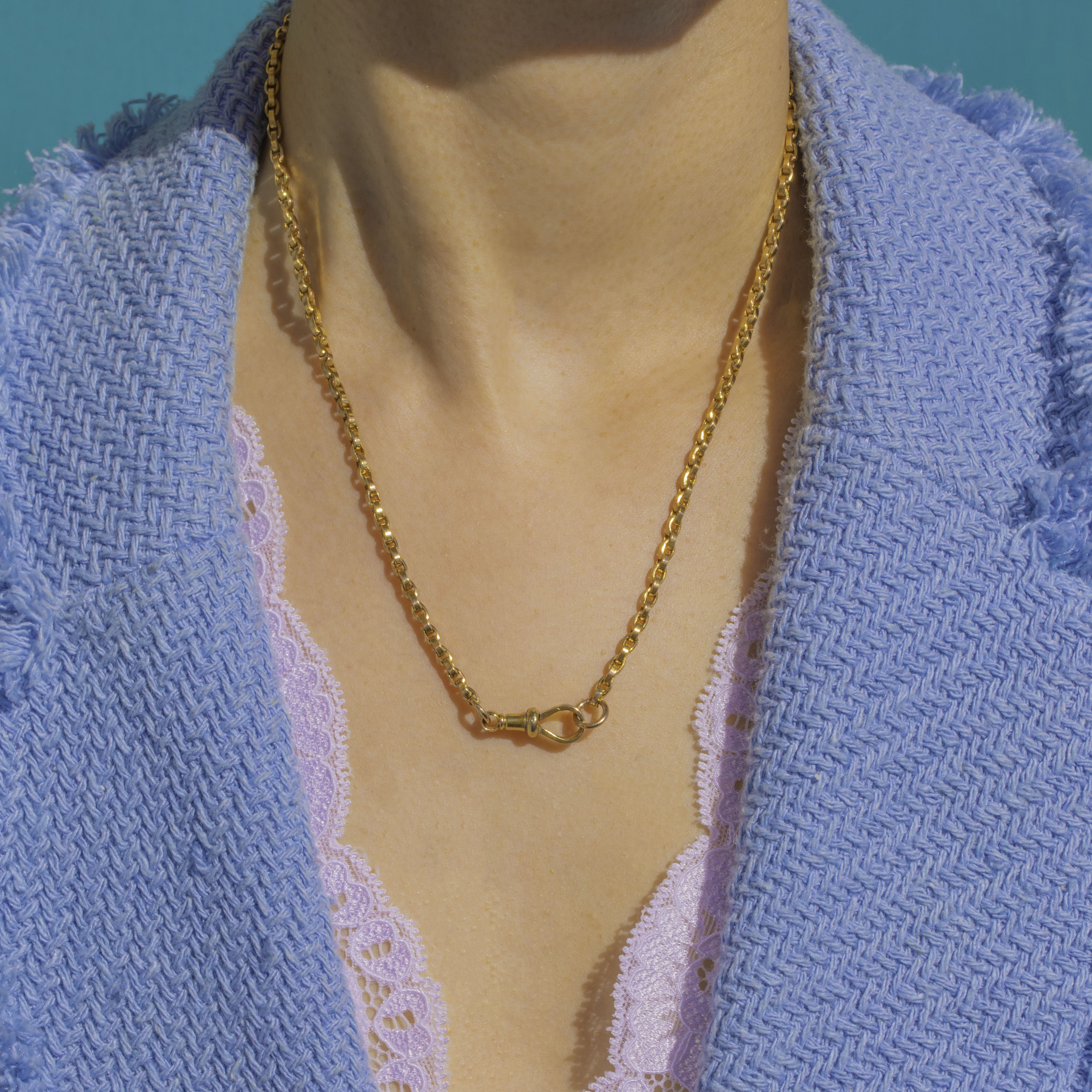 Timeless and beautifully versatile, this antique 9ct Gold belcher chain hails from the Victorian era. The classic belcher links catch the light with an elegant, honeyed glow, creating a sleek silhouette that sits effortlessly at the collarbone.