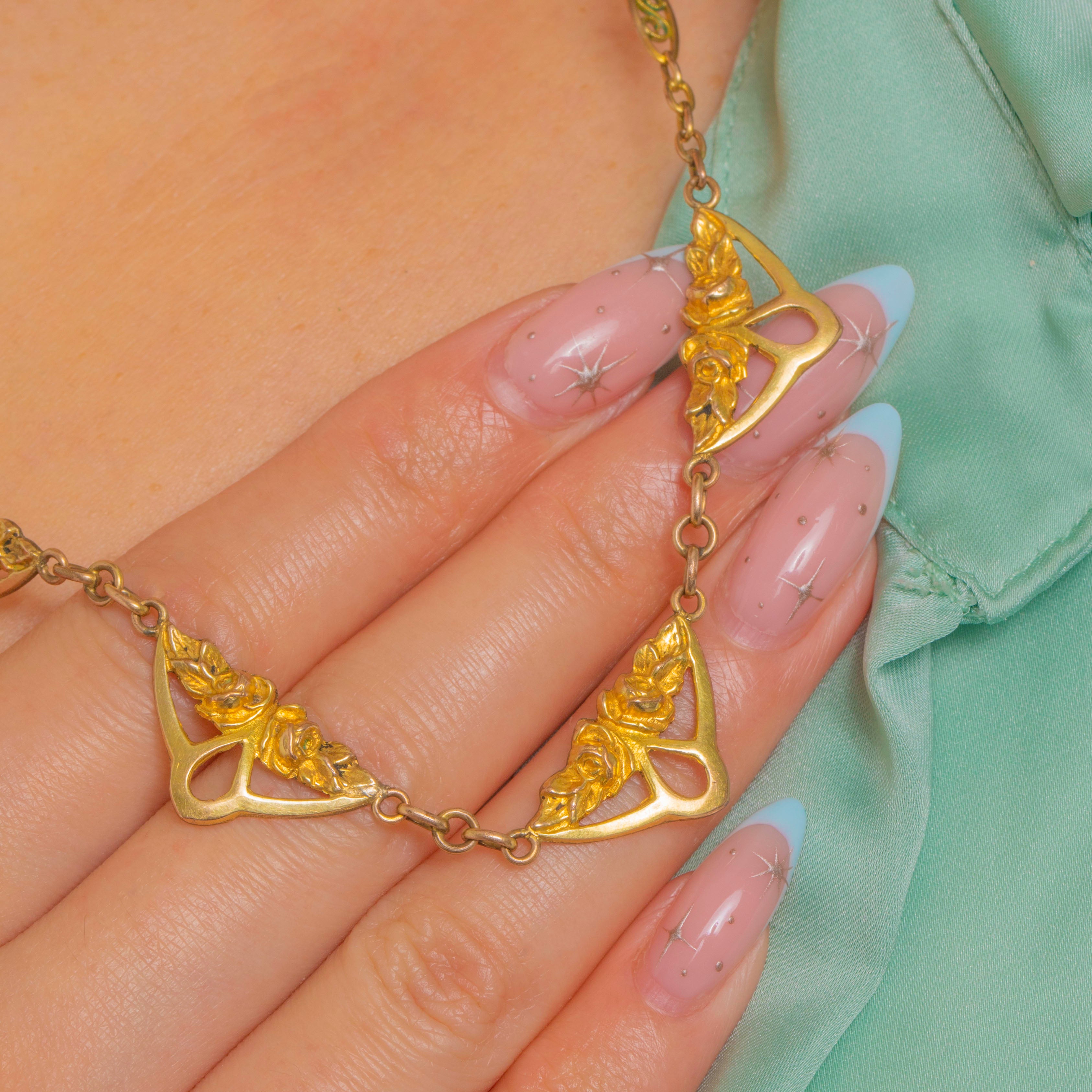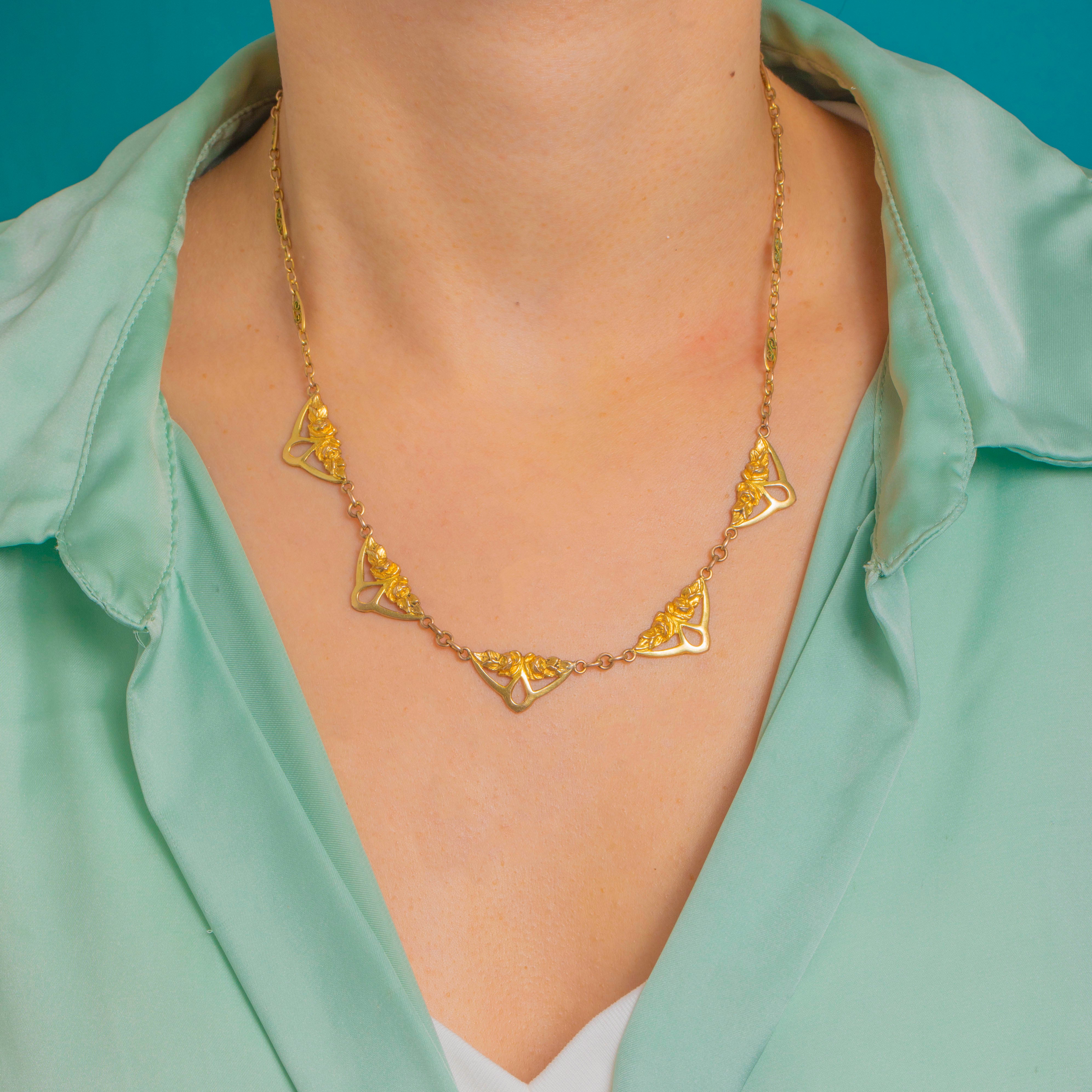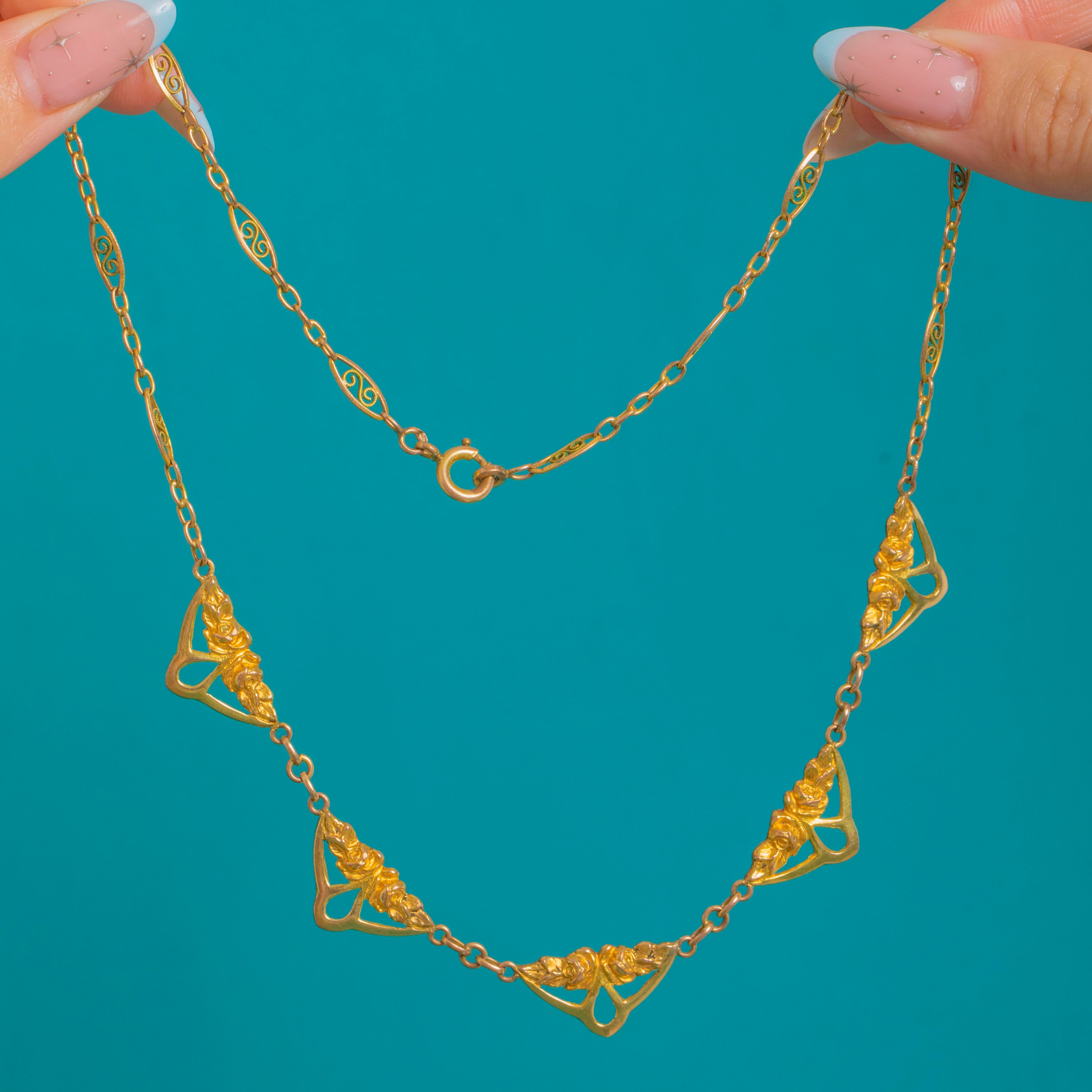 A romantic French Gold Fixe necklace with a delicate garland of openwork plaques, this beauty captures the fluid grace of Edwardian design. Five airy triangular plaques are adorned with stylised floral sprays and graceful whiplash curves, linked to a fine trace-style chain punctuated with navette-shaped stations for a wonderfully decorative finish.