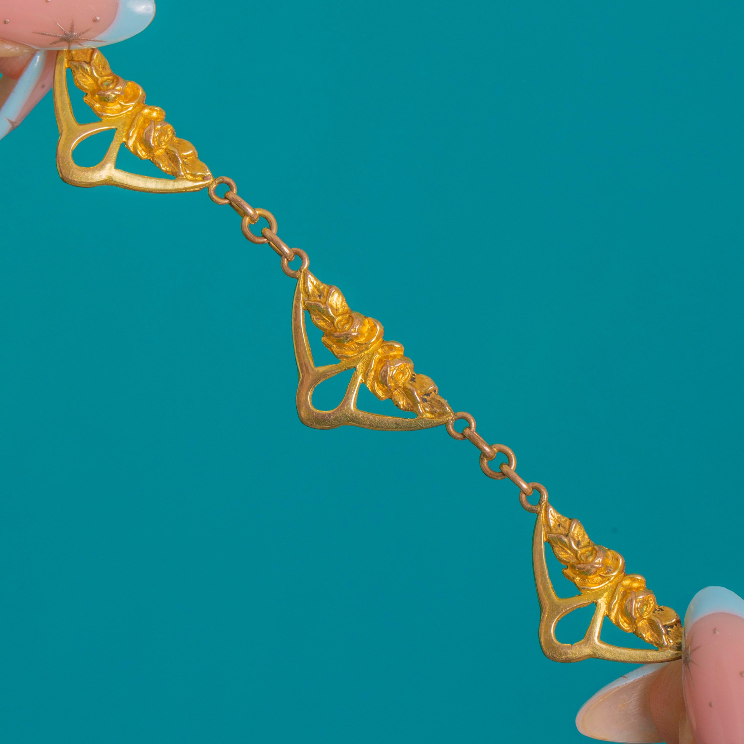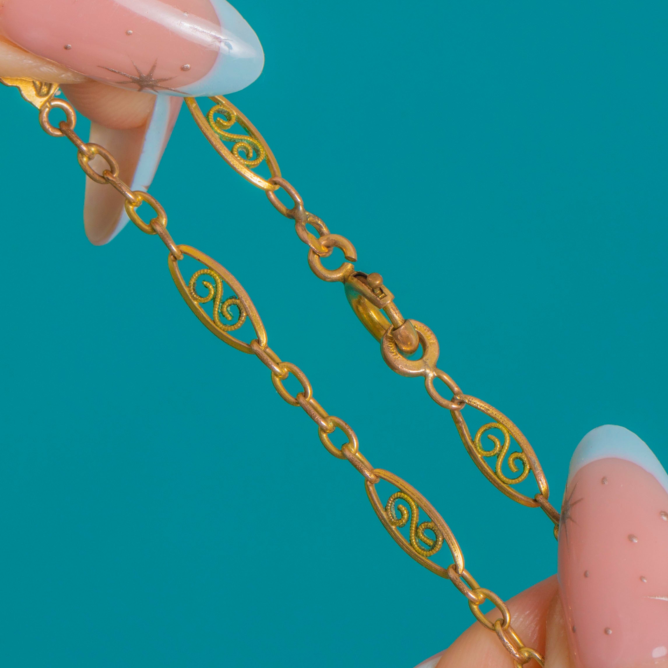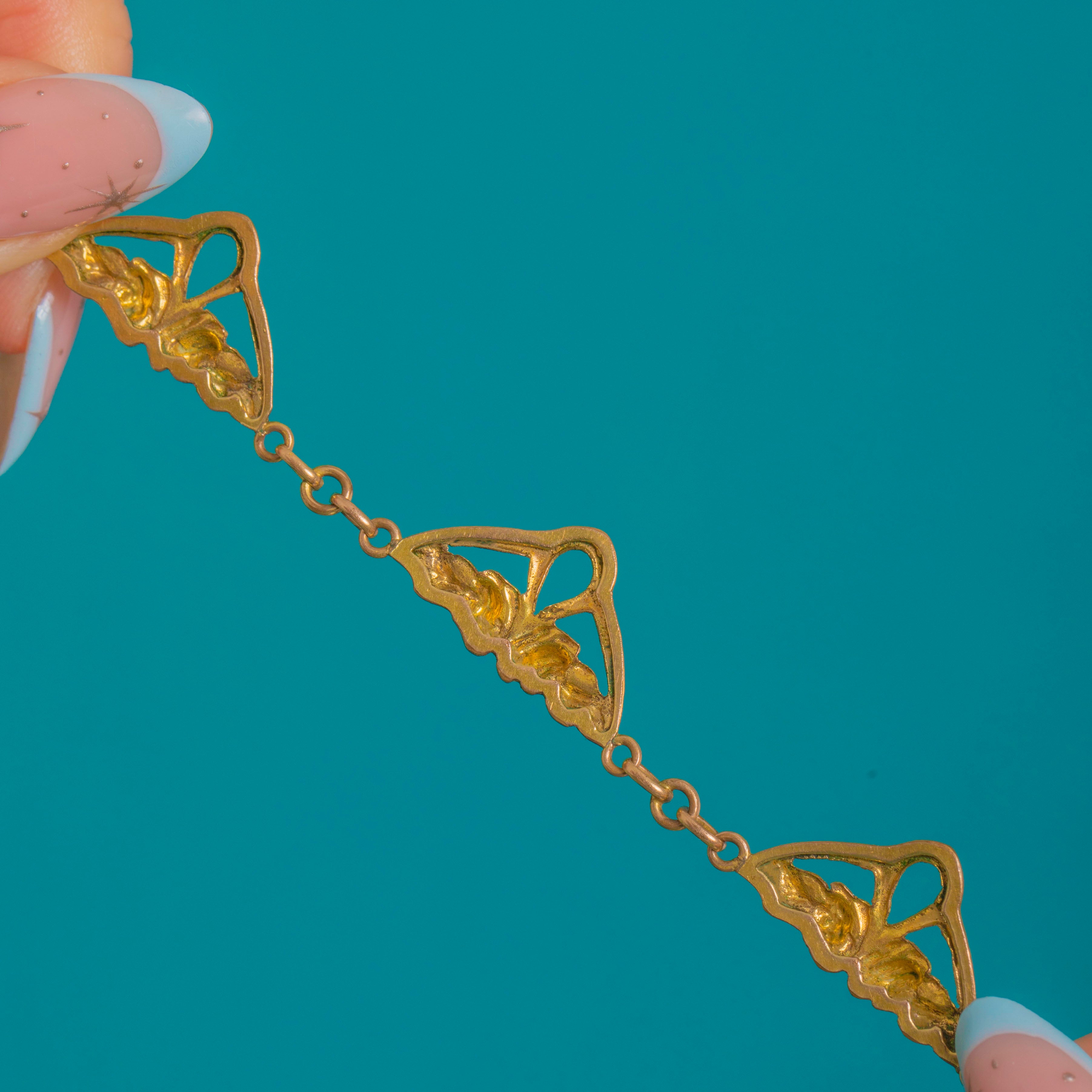 A romantic French Gold Fixe necklace with a delicate garland of openwork plaques, this beauty captures the fluid grace of Edwardian design. Five airy triangular plaques are adorned with stylised floral sprays and graceful whiplash curves, linked to a fine trace-style chain punctuated with navette-shaped stations for a wonderfully decorative finish.