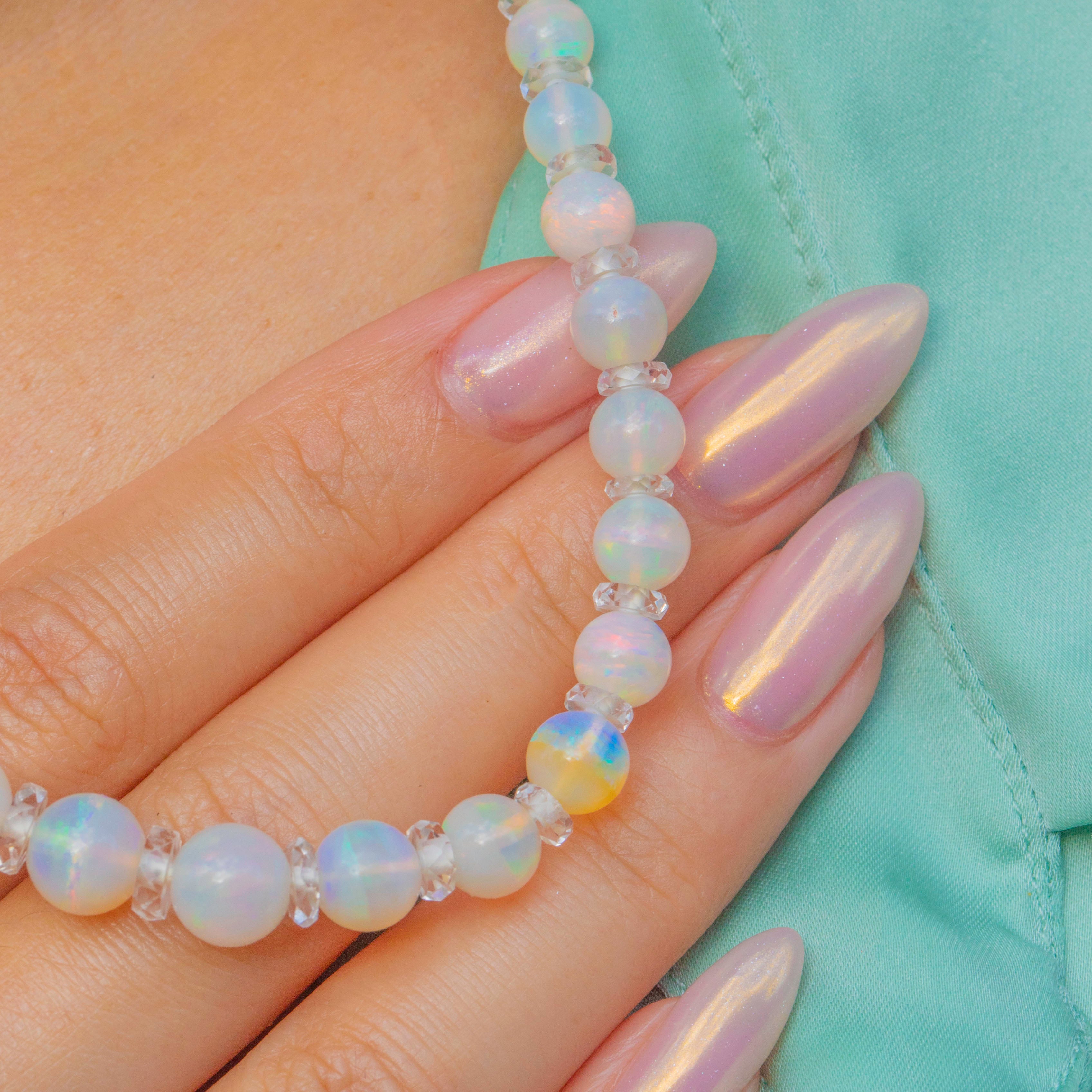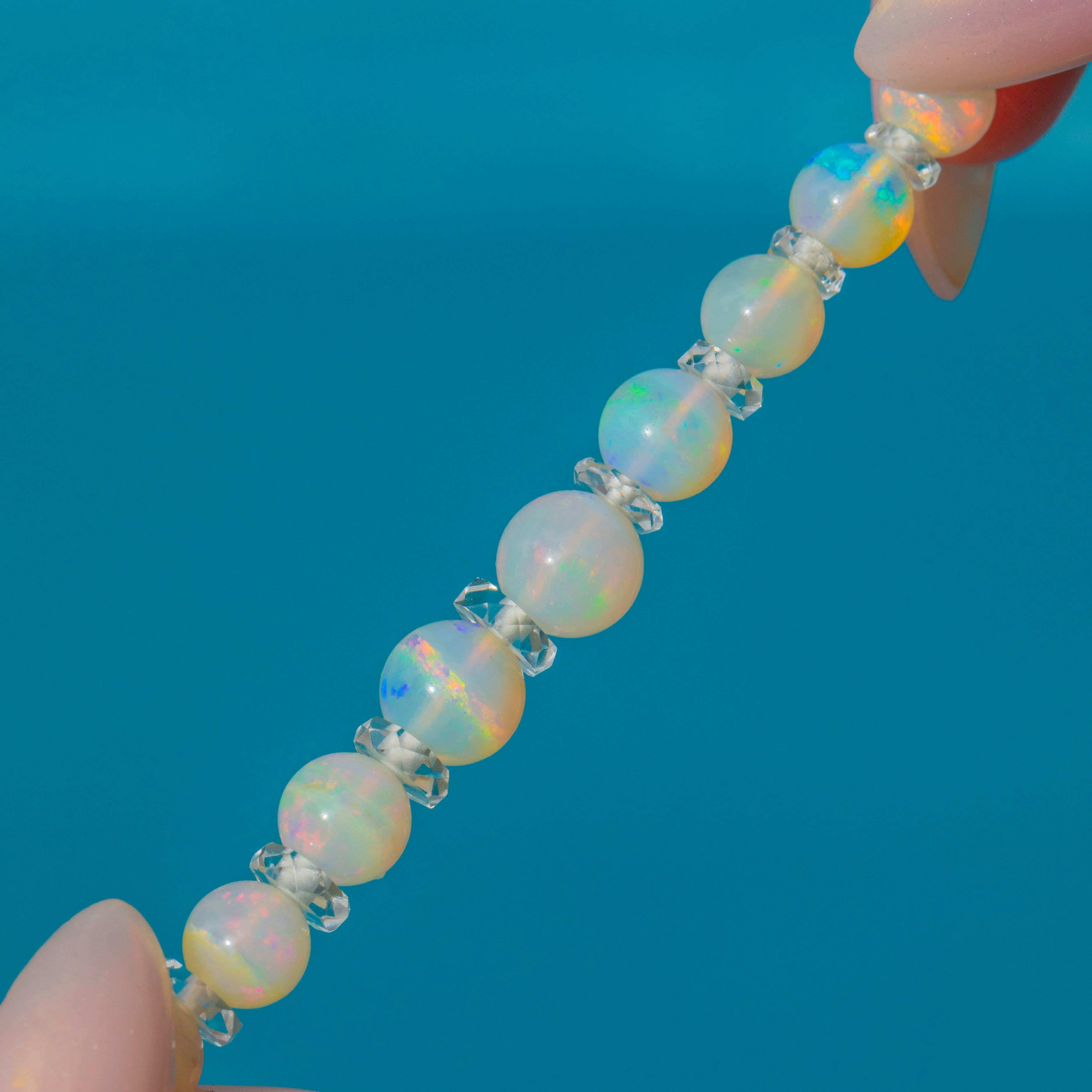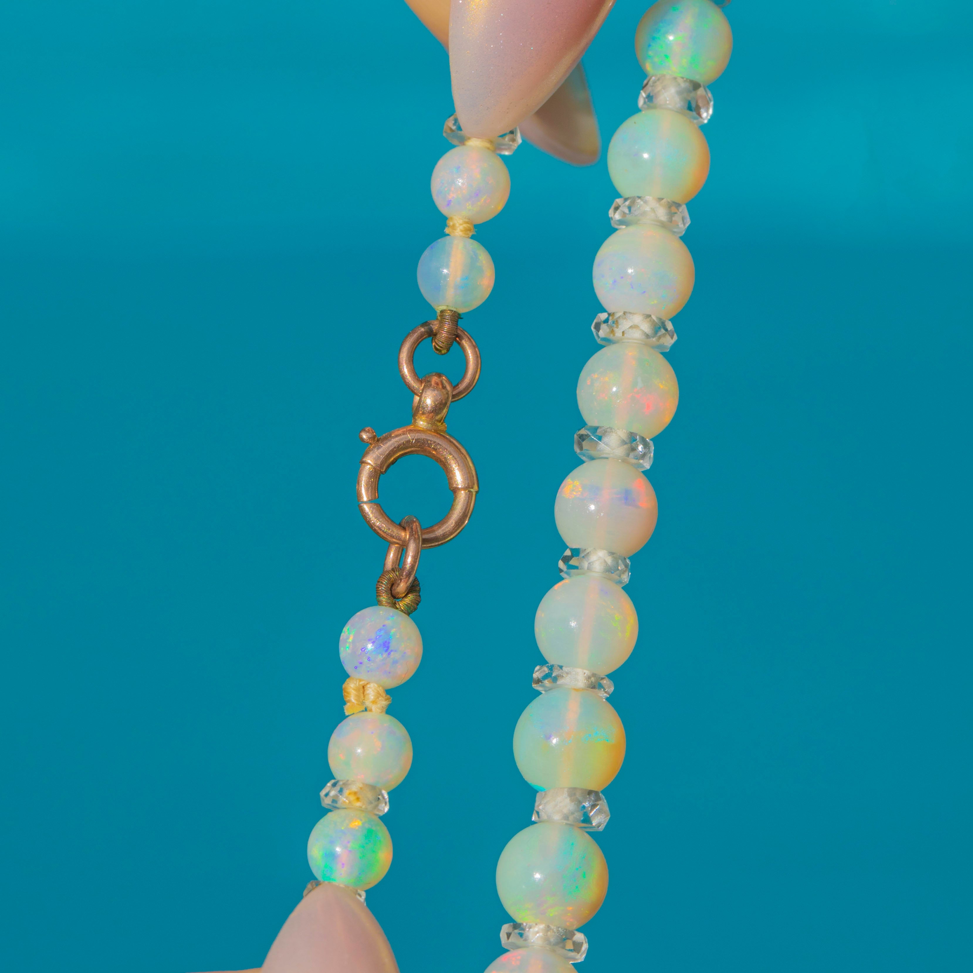 EXCELLENT: The Opal beads are free from chips, abrasions or cracks, retaining good lustre and play-of-colour. Rock Crystal spacers are intact and clear, and the 9ct Gold clasp is in full working order with minimal age-related wear.