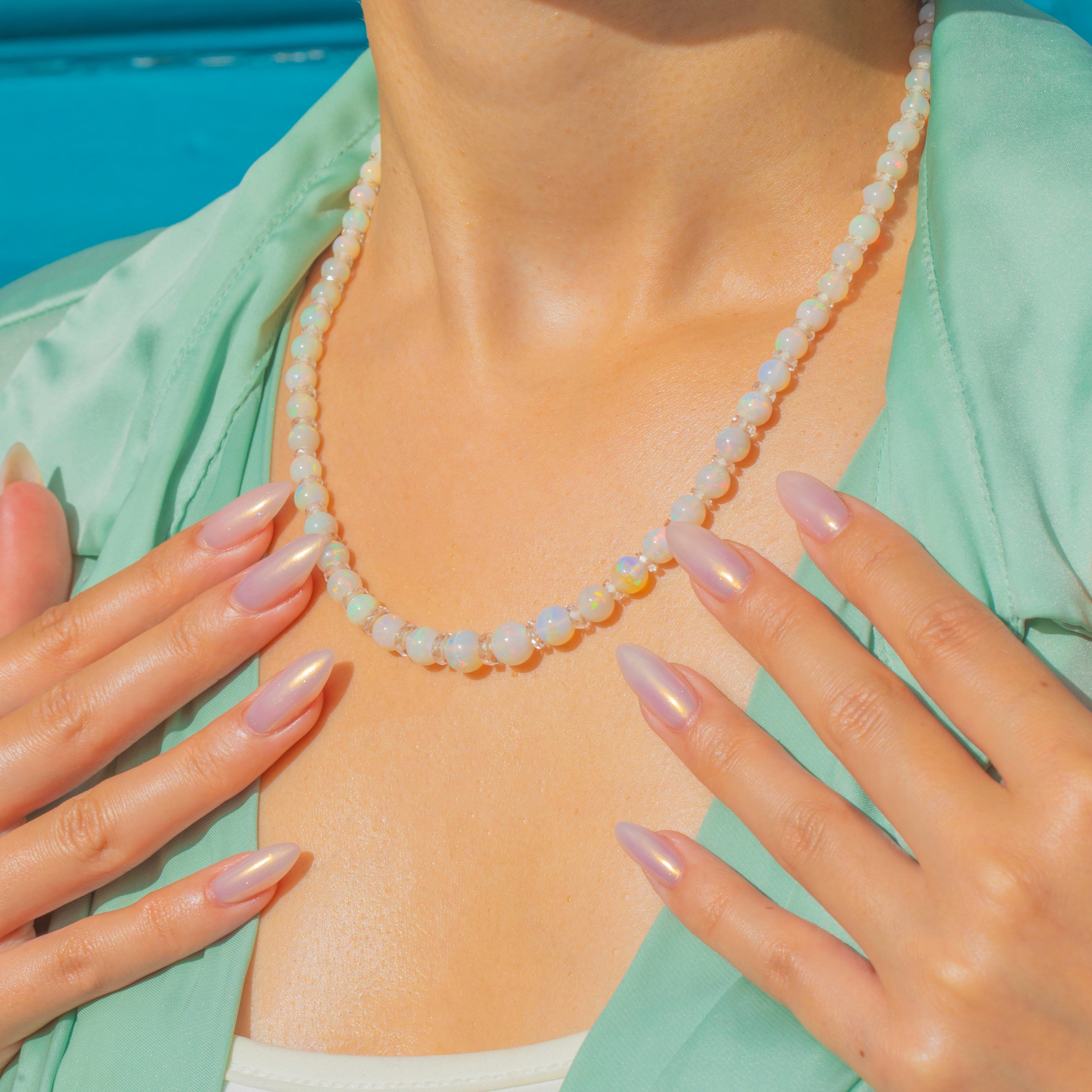 17" Art Deco Opal Bead Necklace with Rock Crystal Spacers, Antique Bolt Ring Clasp