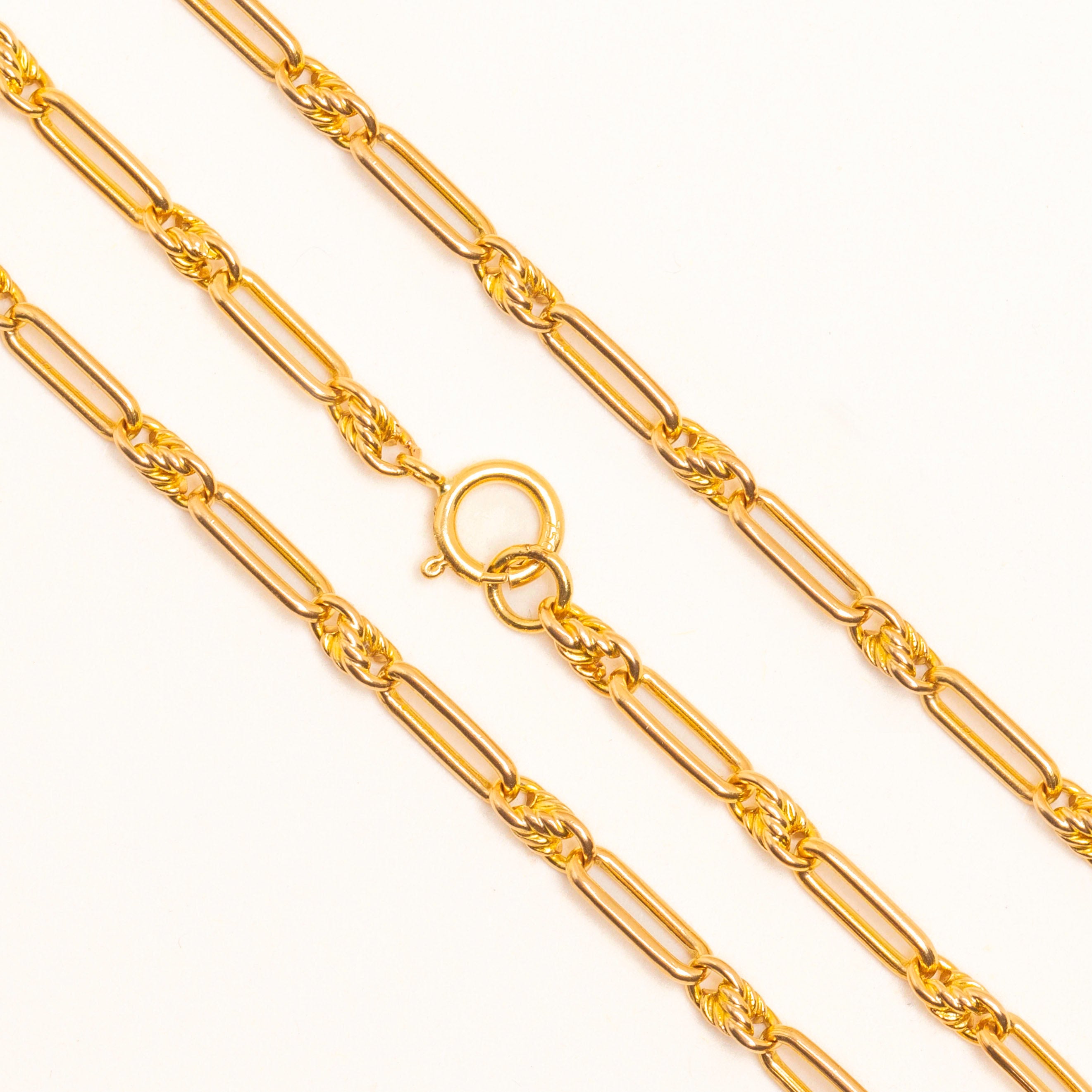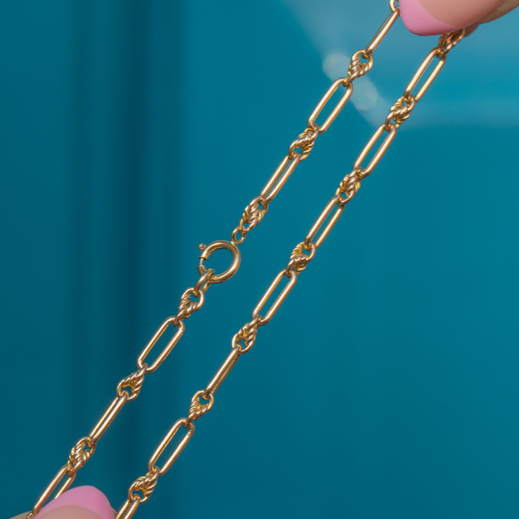 EXCELLENT -  With perfectly connected links, a fully functioning bolt-ring and mouth-watering 15ct Gold, this 18" antique 15ct Gold lover's knot chain is in excellent condition! The links are smooth and have the most wonderful bright yellow hue. No damage or wear to note. She's beautiful!