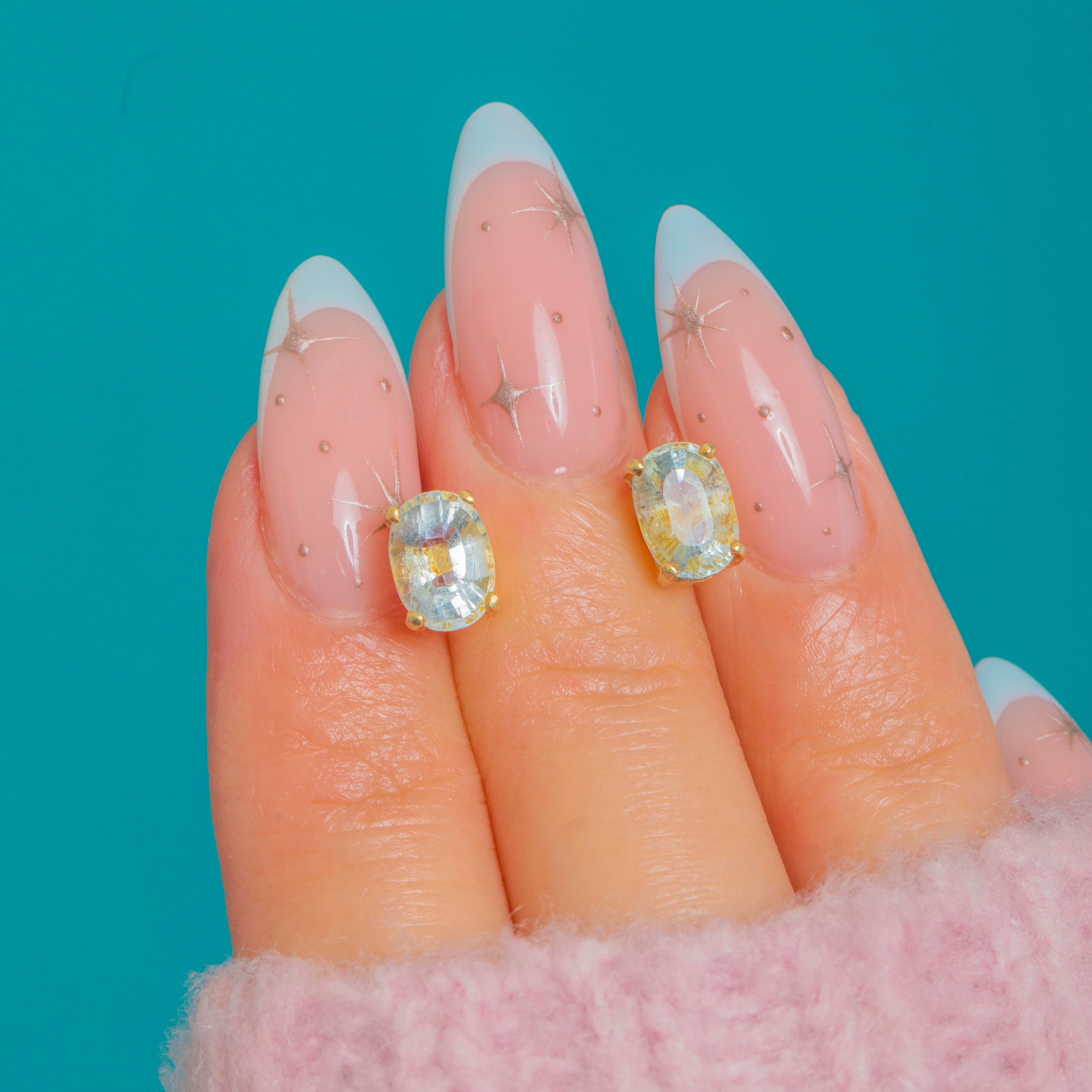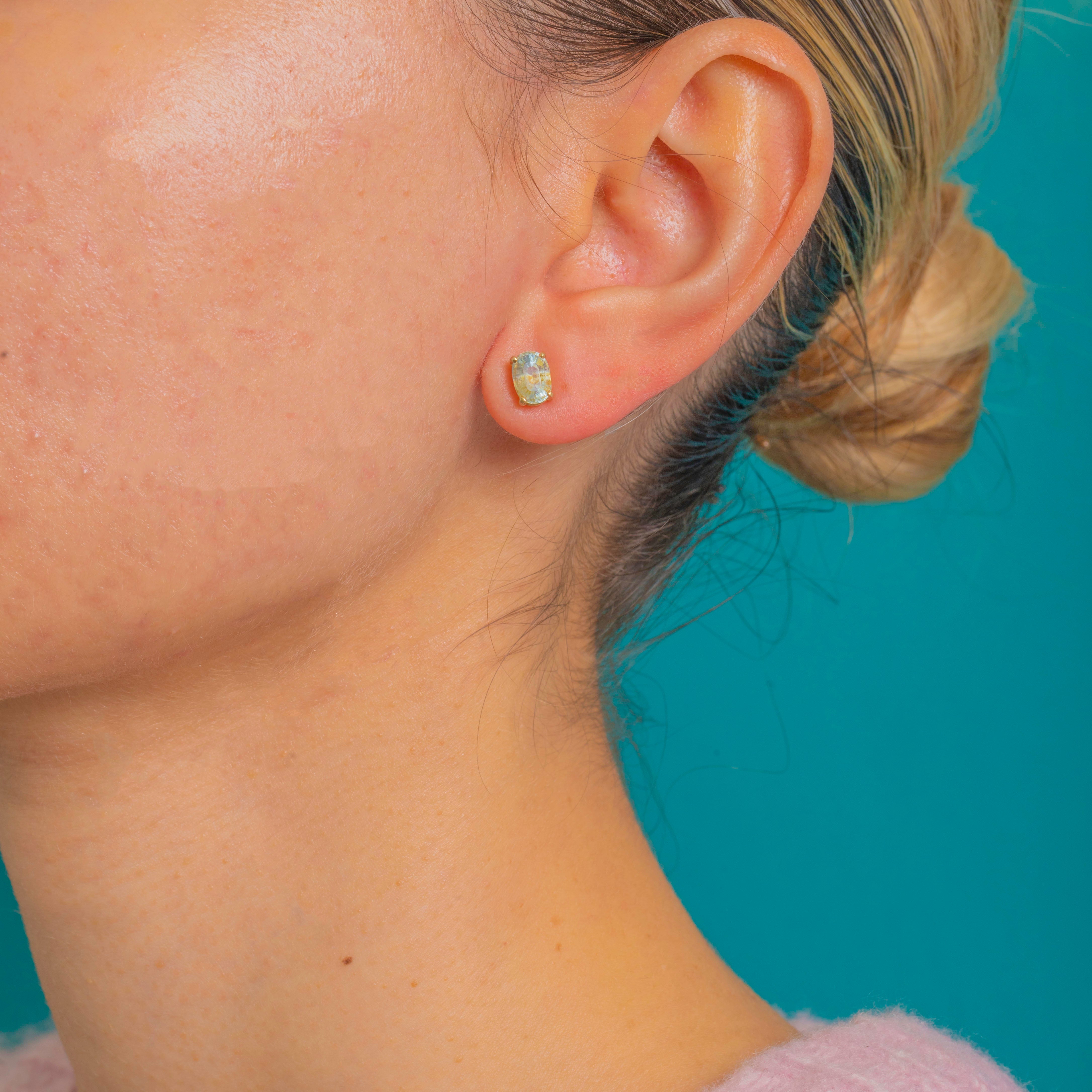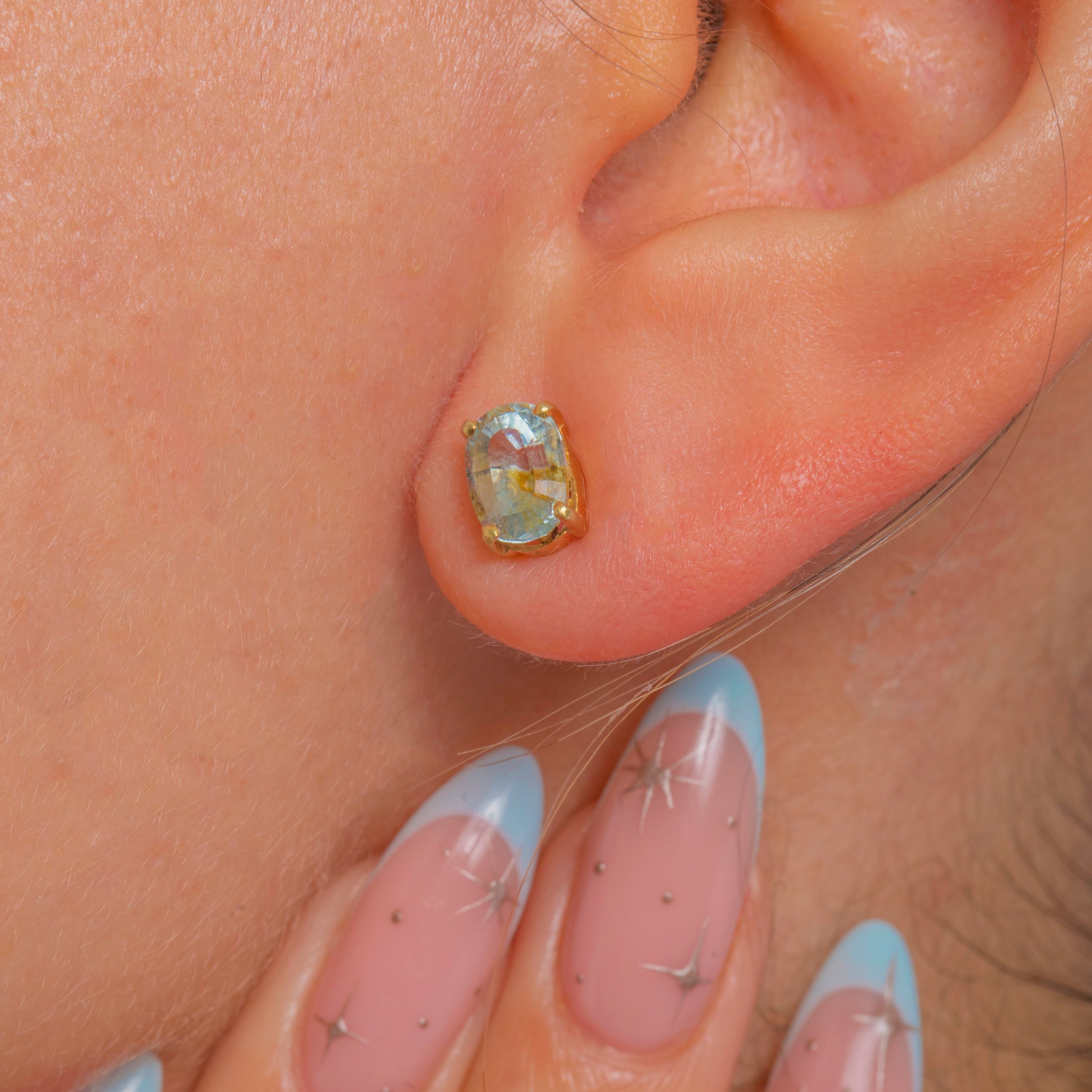 Cool, crisp and beautifully understated, these Oval Aquamarine stud earrings bring a whisper of icy blue to the ear. Each gemstone is held in a neat four-claw basket, allowing light to flow through and illuminate their serene watery hue against glowing 18ct Gold.