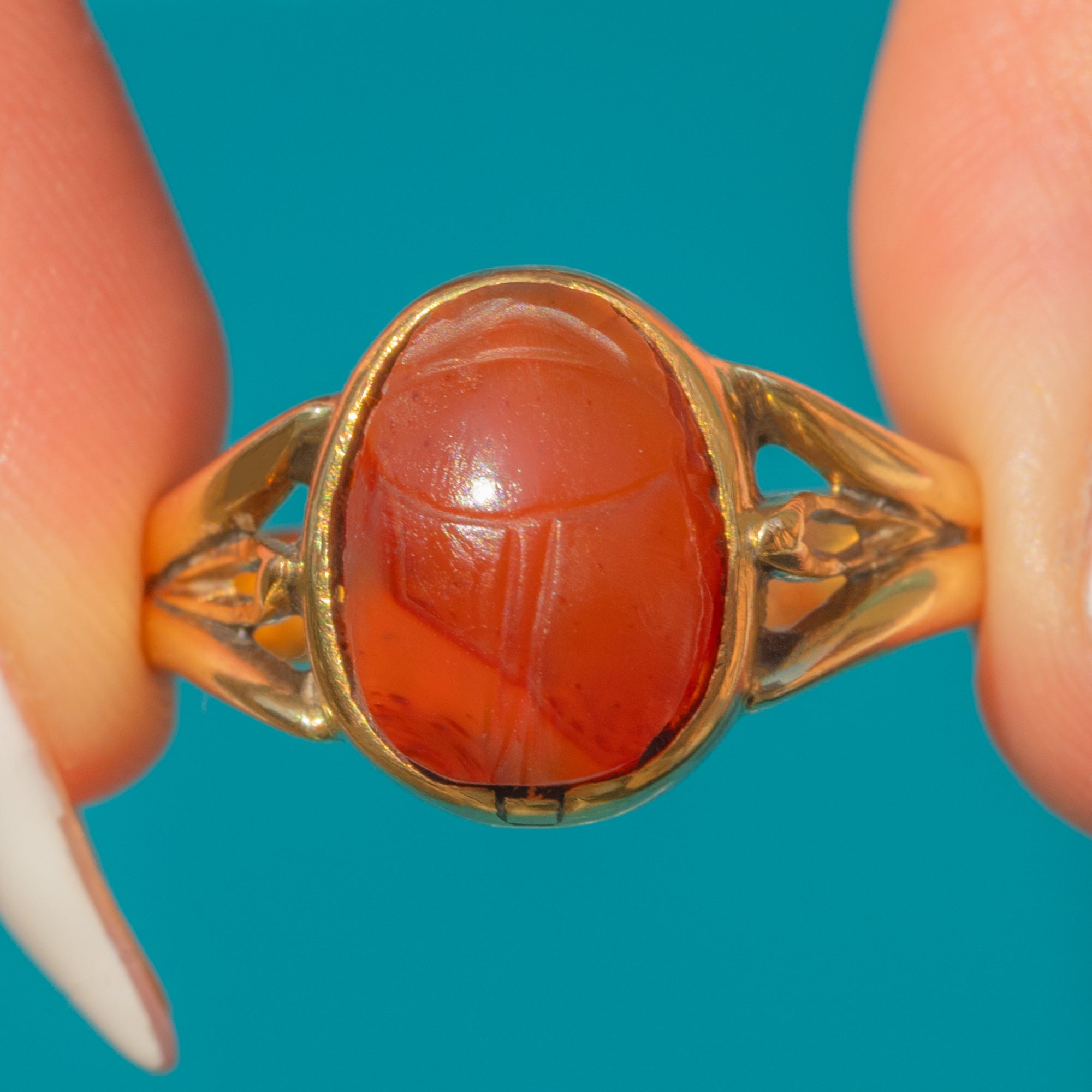 This vintage 18ct Gold Archaeological Revival ring features a finely carved Agate scarab, inspired by Ancient Egyptian symbolism of protection and rebirth.