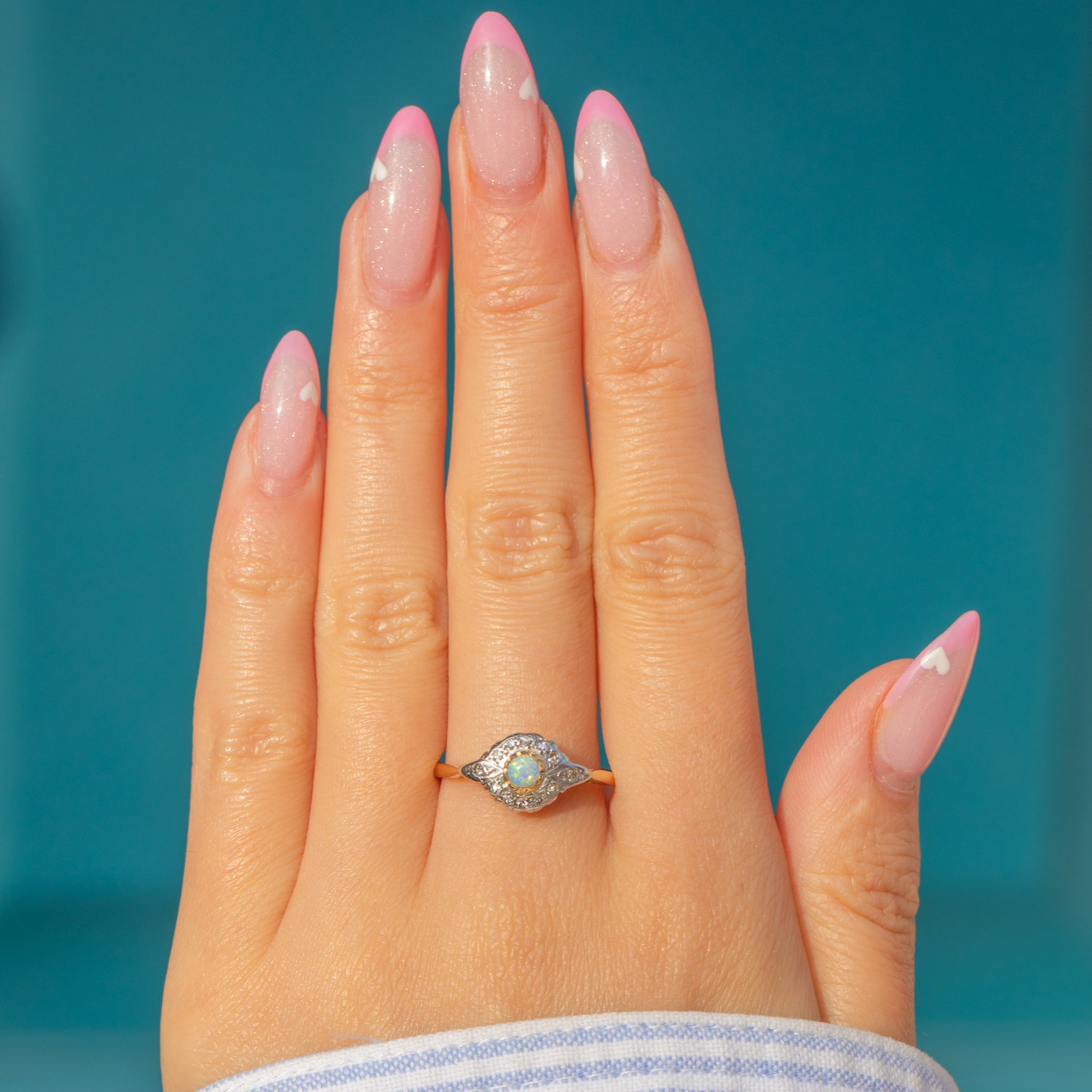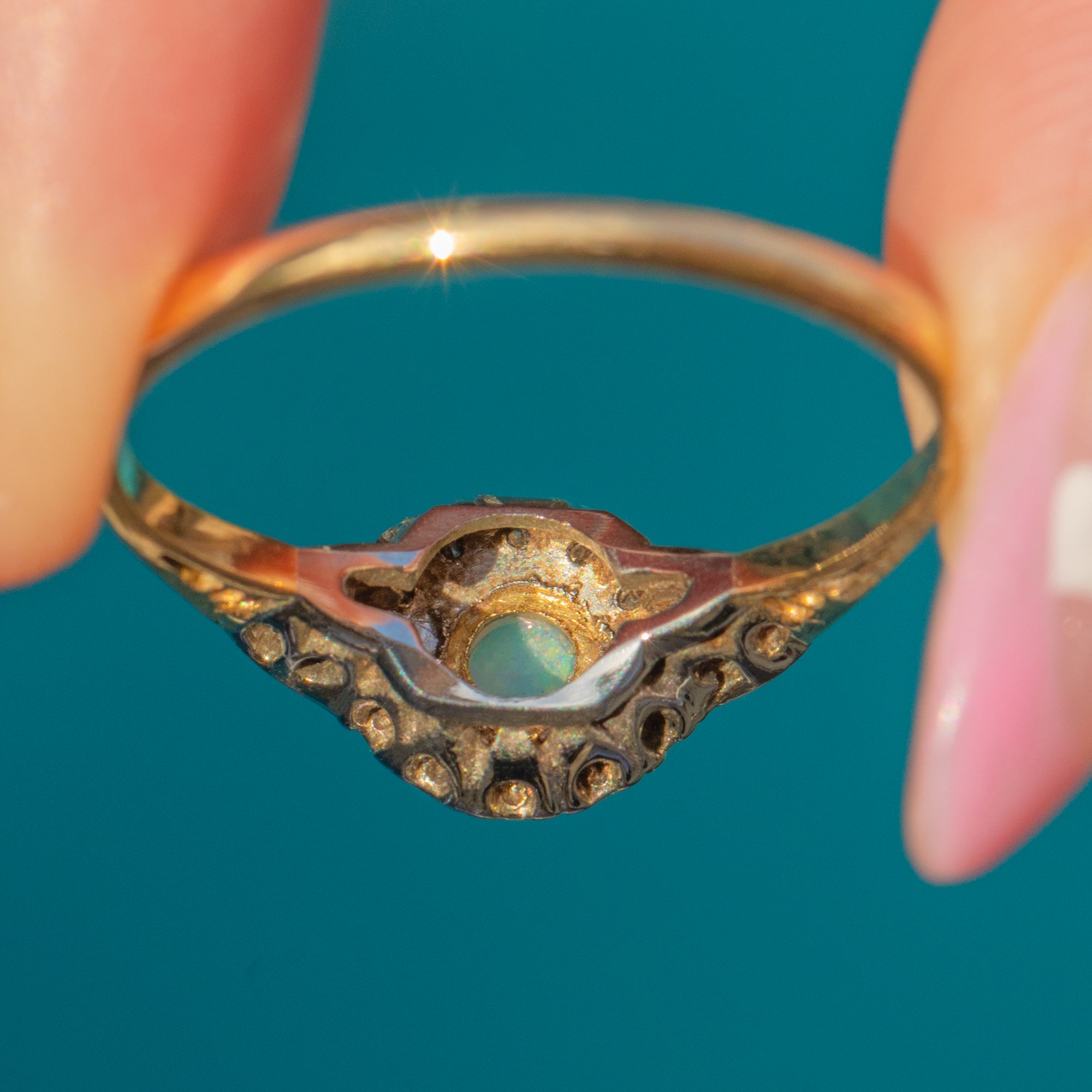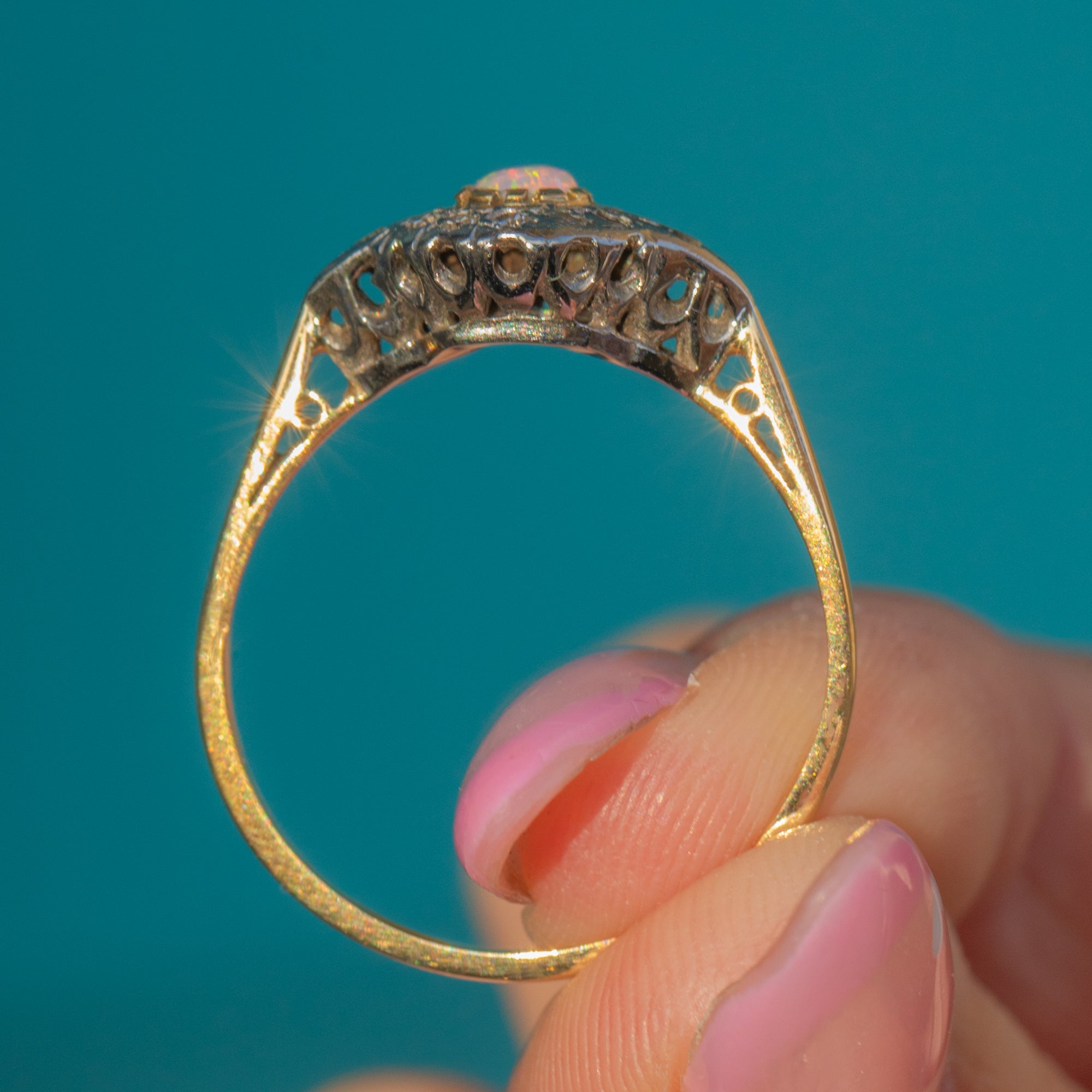 This graceful Art Deco ring features a luminous 3mm Opal framed by delicate 1.5mm Diamonds. The play of light between the Opal’s pastel fire and the Diamonds’ crisp sparkle creates a refined and timeless look. Set in rich 18ct Gold, it embodies the understated glamour of the 1920s era.