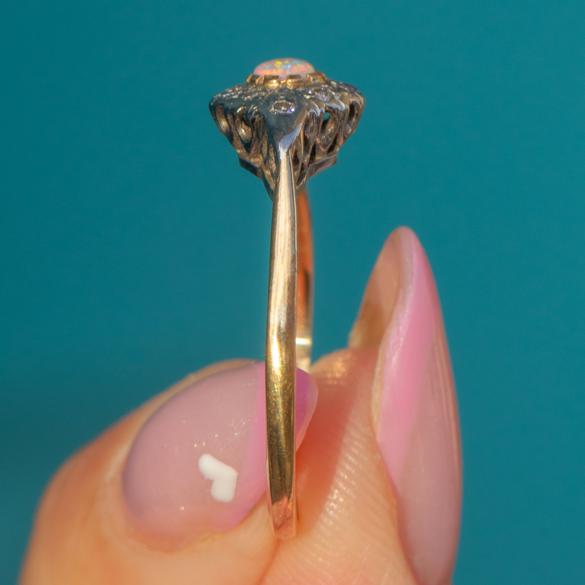 EXCELLENT: The Opal displays good colour and clarity with no surface wear. The Diamonds are bright, secure and well-matched. The Gold band retains a lovely smooth polish with minimal wear, and the ring has been beautifully cared for over time.