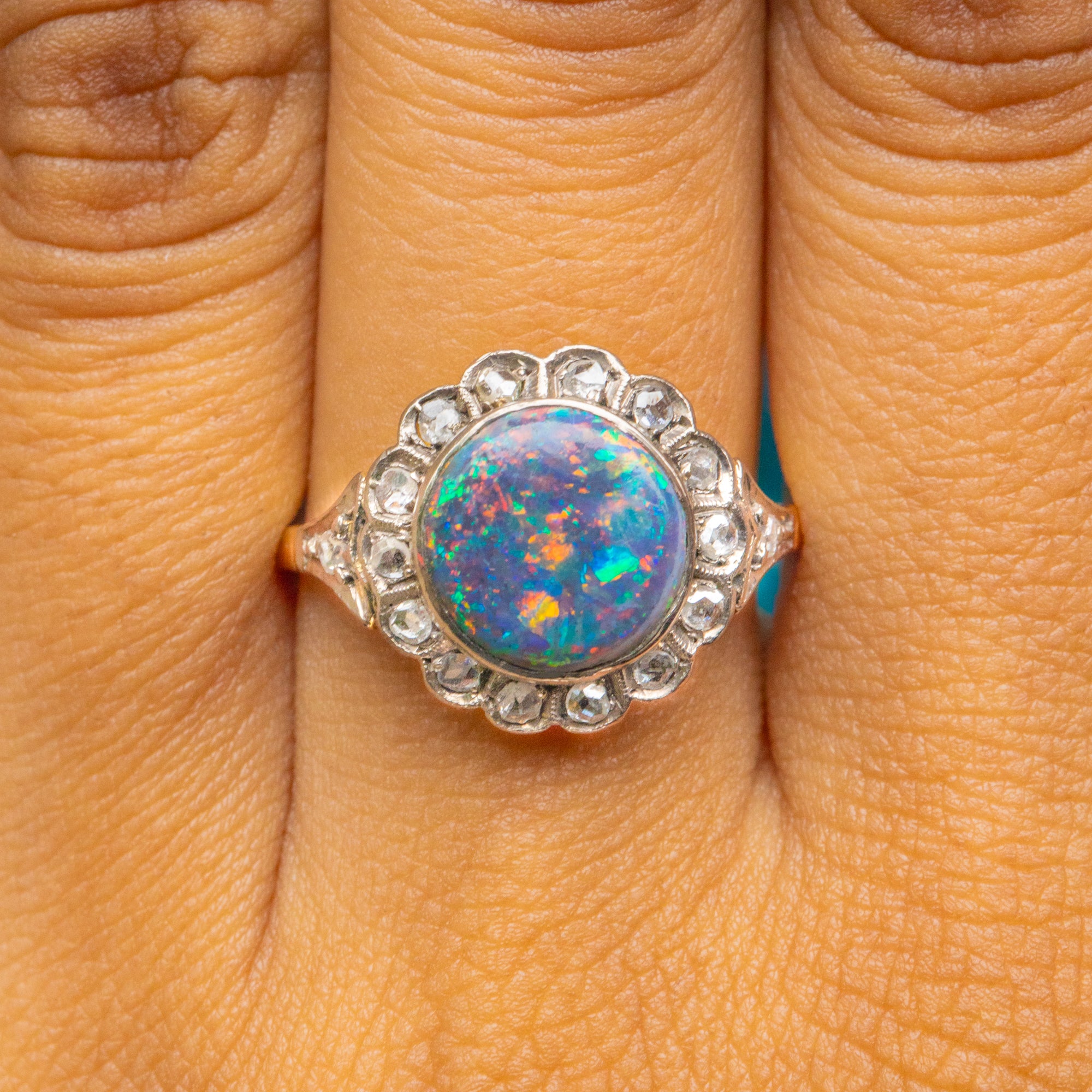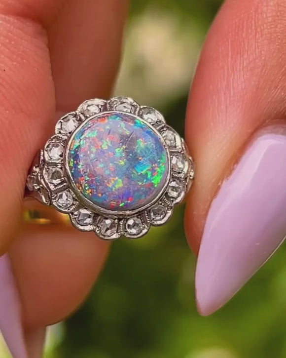 With authentic black Opals almost always sourced from the outback of Lightening Ridge Australia, this black Opal Diamond ring is a rare beauty that will take pride of place within your antique jewellery collection!