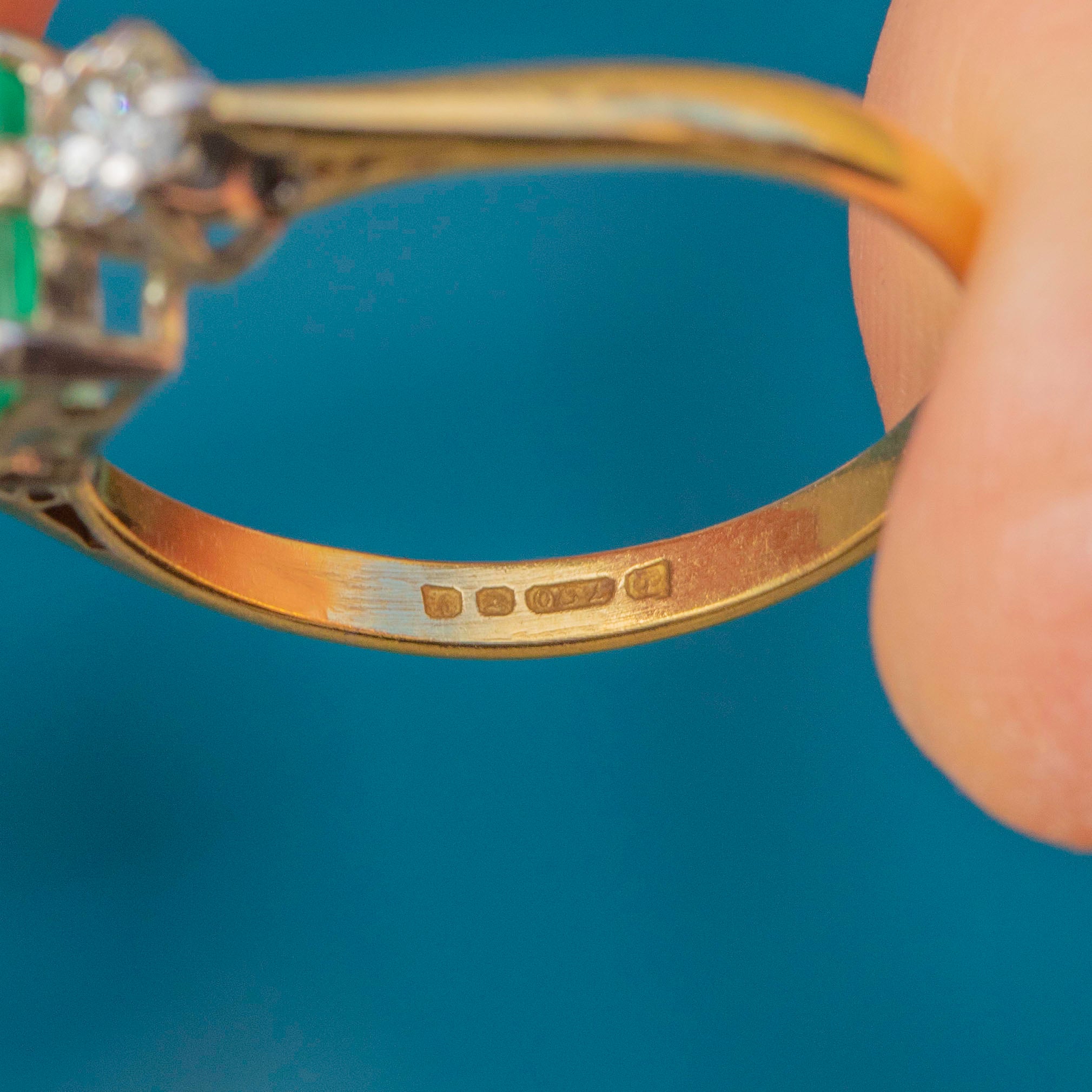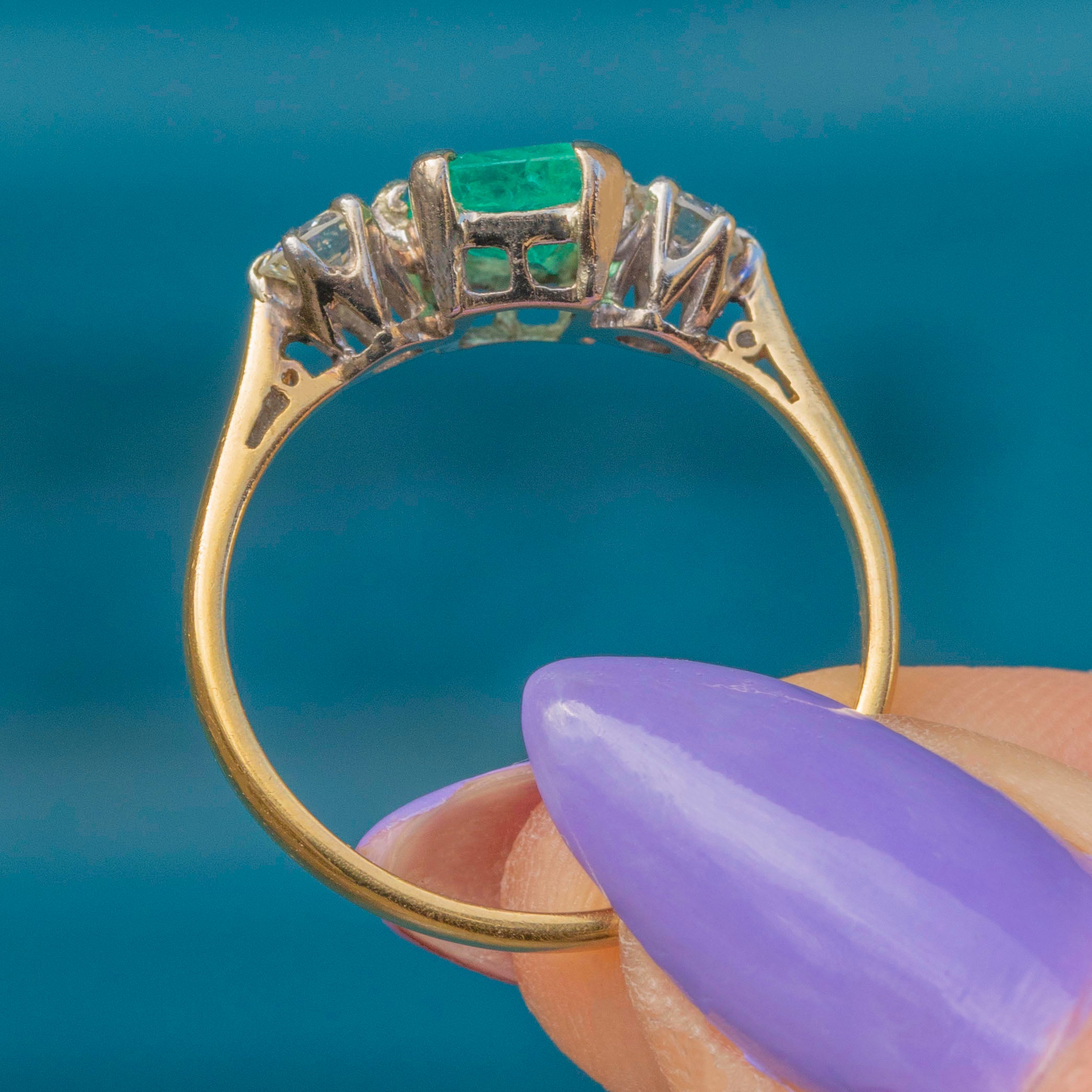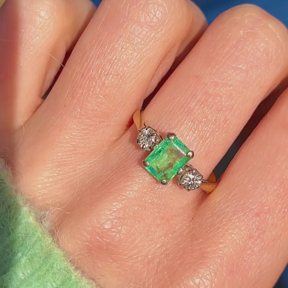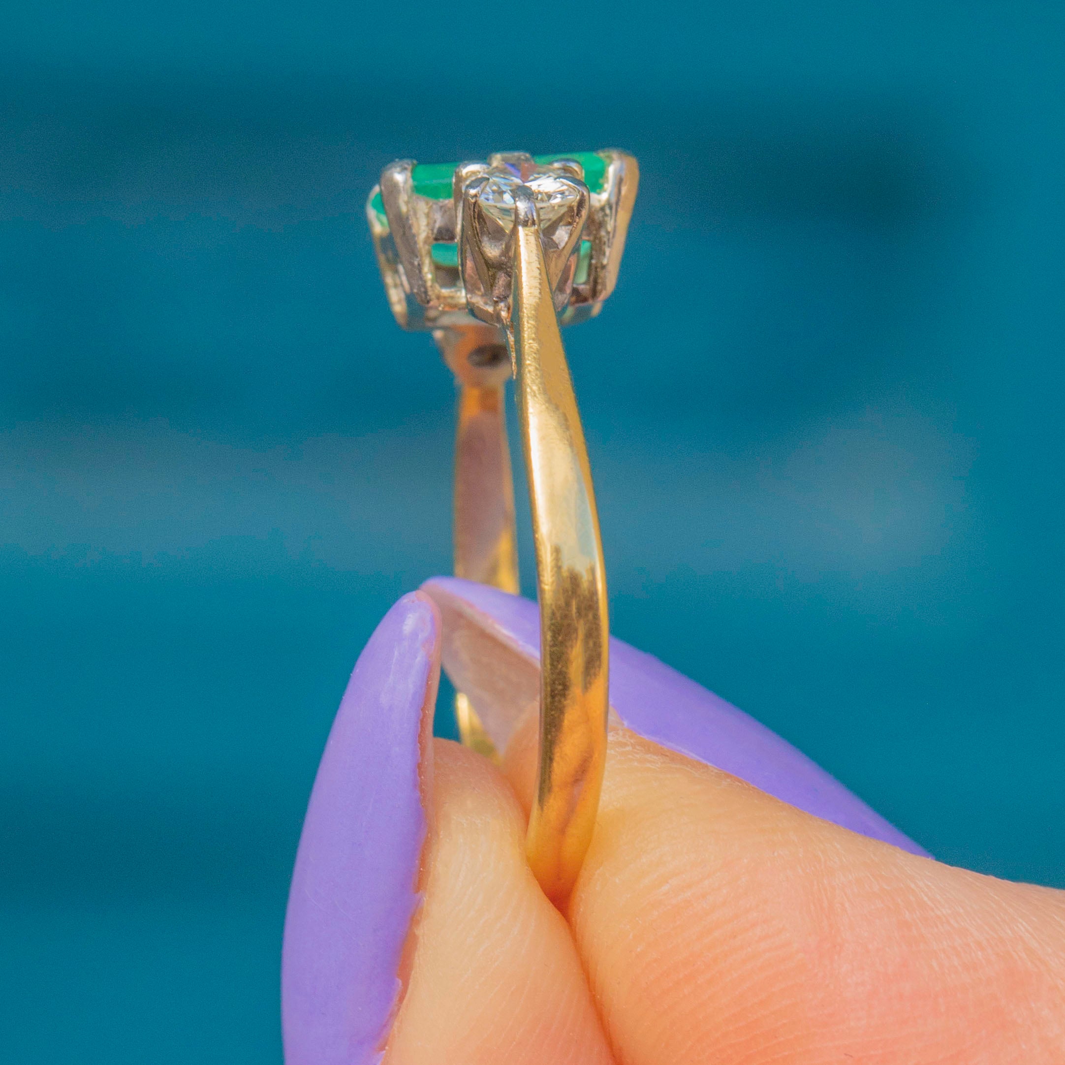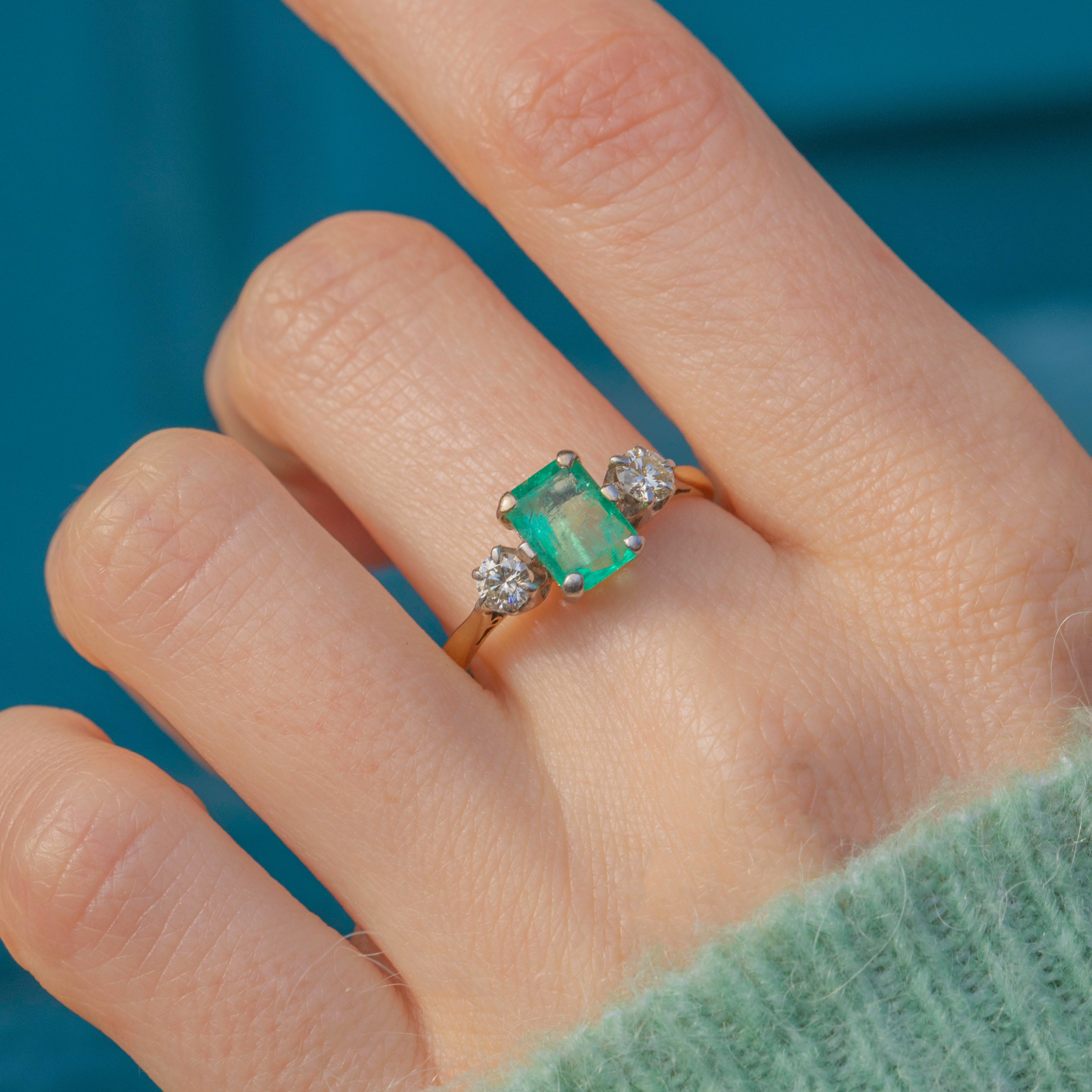 EXCELLENT: This 18ct Gold Emerald Diamond trilogy ring is in excellent condition! This gorgeous piece is like no other, with each gemstone securely set. The 18ct Gold band is hallmarked, and the Platinum settings provide extra strength. The Emerald has some wear and natural inclusions, adding to its unique character, but the Diamonds remain bright and secure. Overall, there is no significant damage to note—she's a beauty!